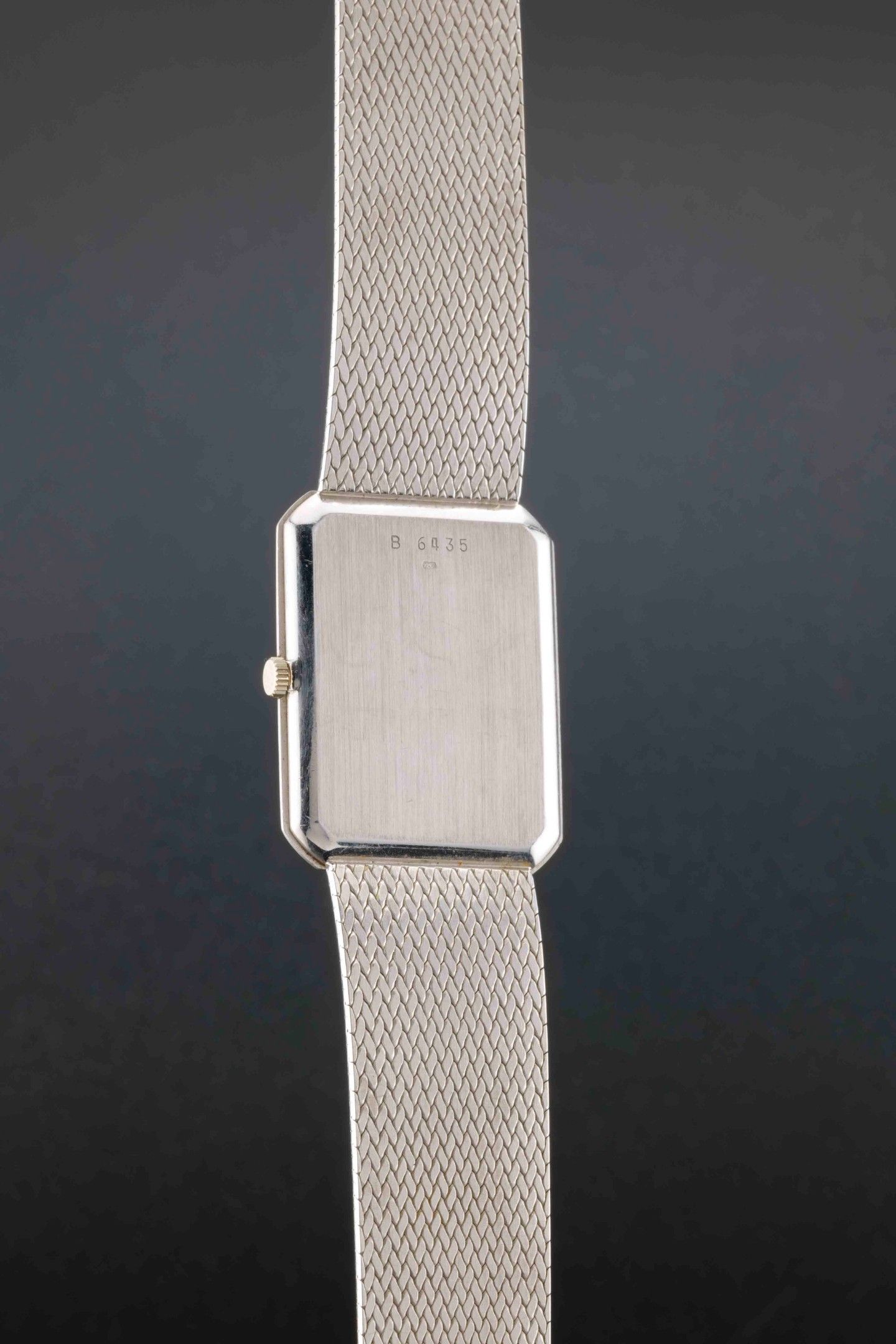 Case: rectangular in 750/1000 white gold, smooth bezel, fluted round winding mechanism, clip-on back.