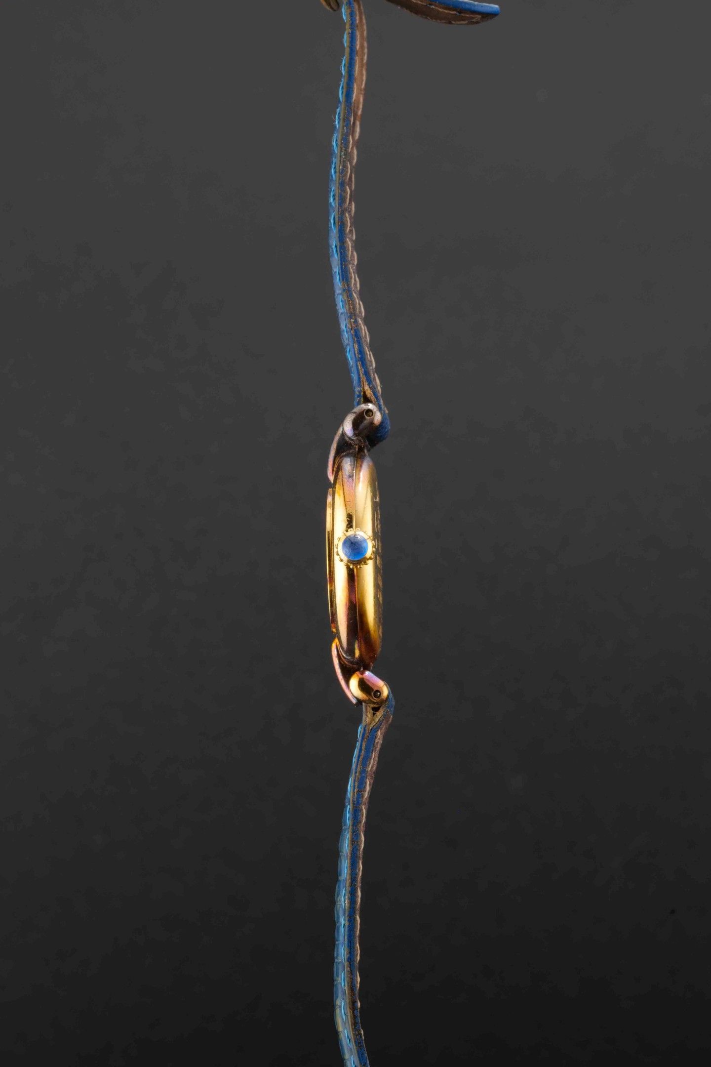 Strap: blue leather signed Cartier Paris, gold folding clasp signed.