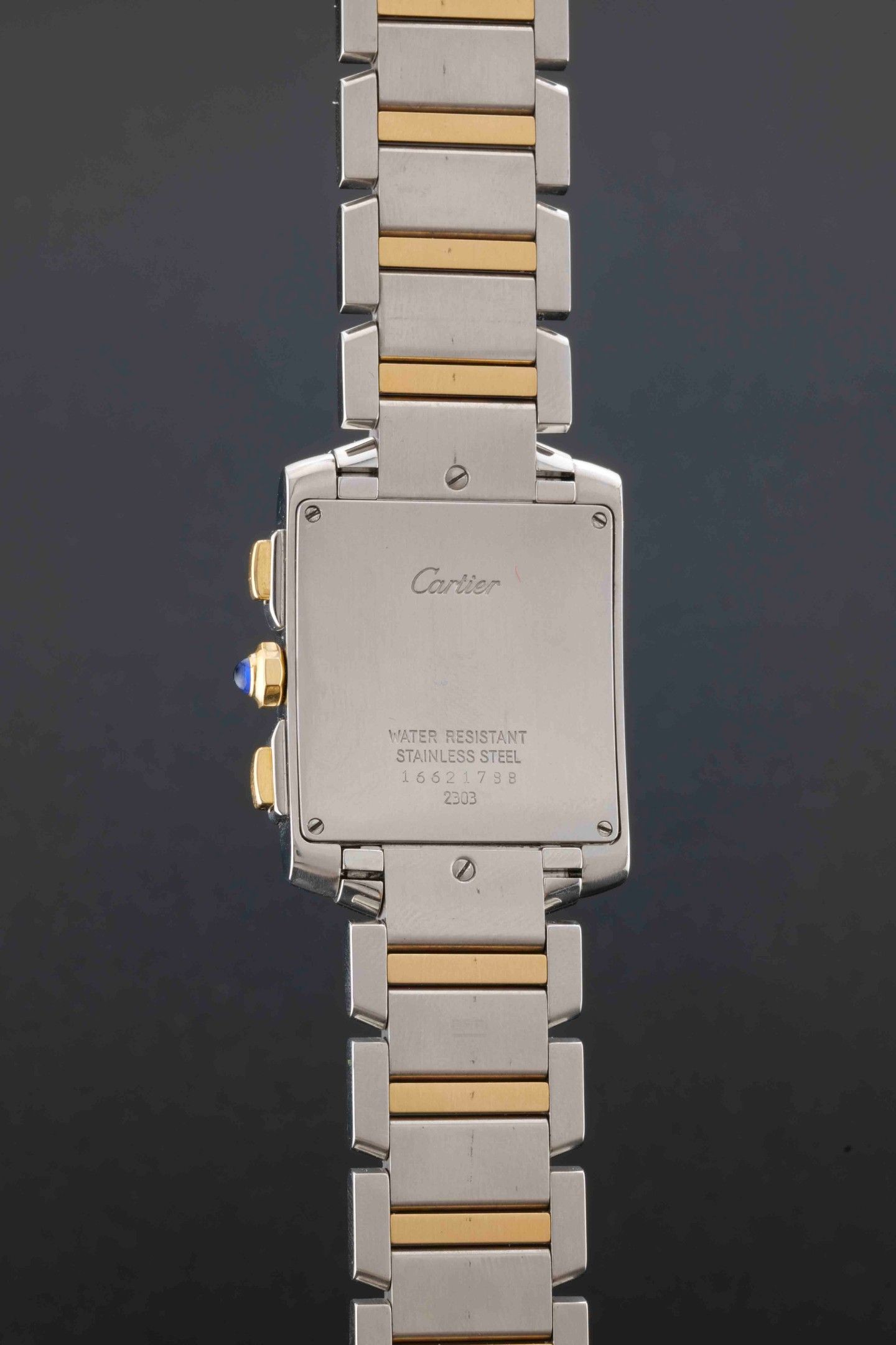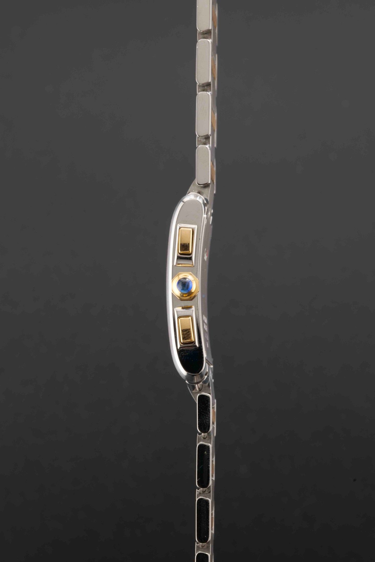 Case: rectangular with screw-down steel back, winding mechanism set with a sapphire cabochon, rectangular push-pieces.