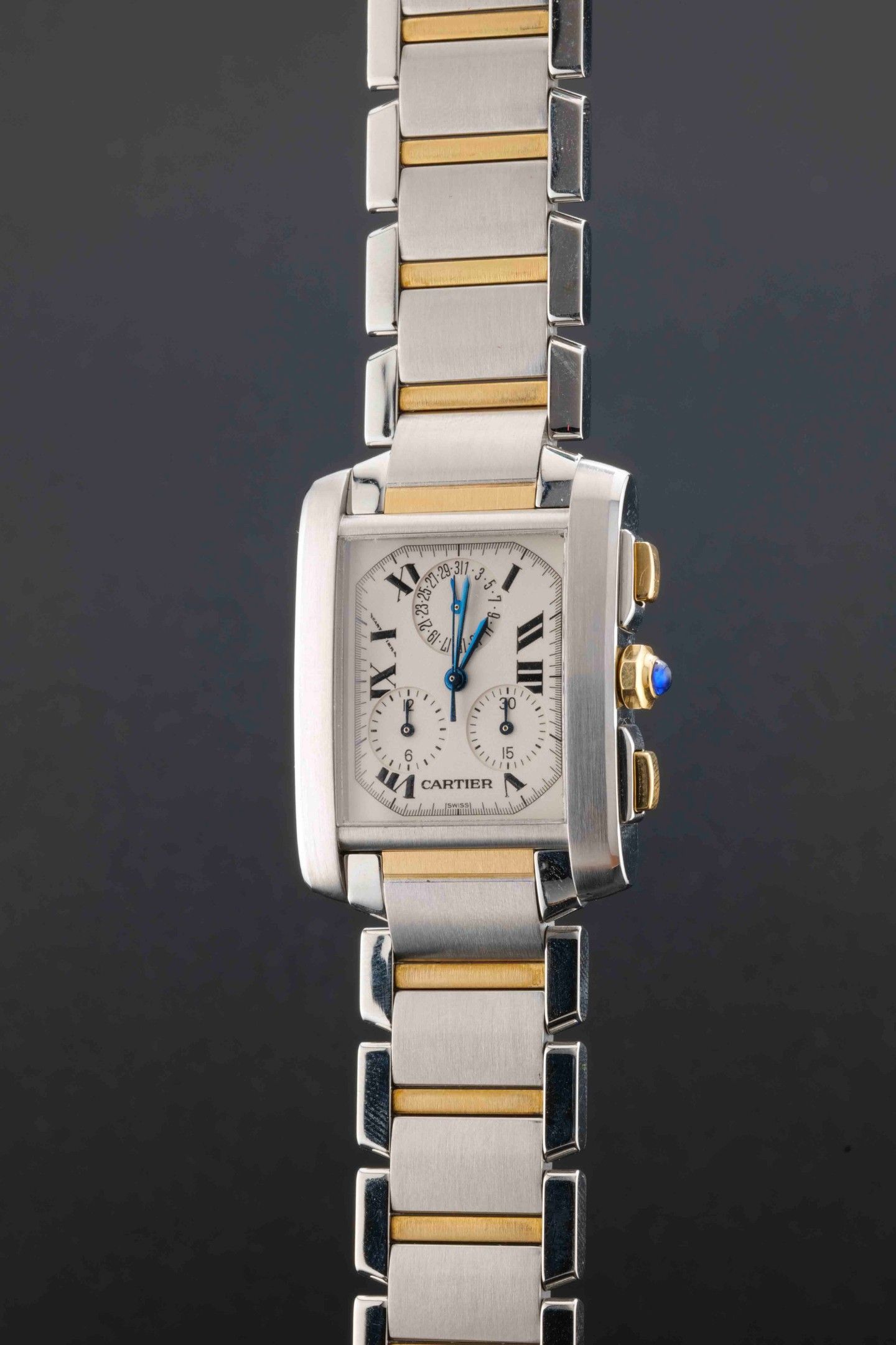 Dial: signed white, baton hour-markers and painted Roman numerals, sub-counter at 4 o'clock for the minutes, sub-counter at 8 o'clock for the hours and sub-counter at 12 o'clock for the date.