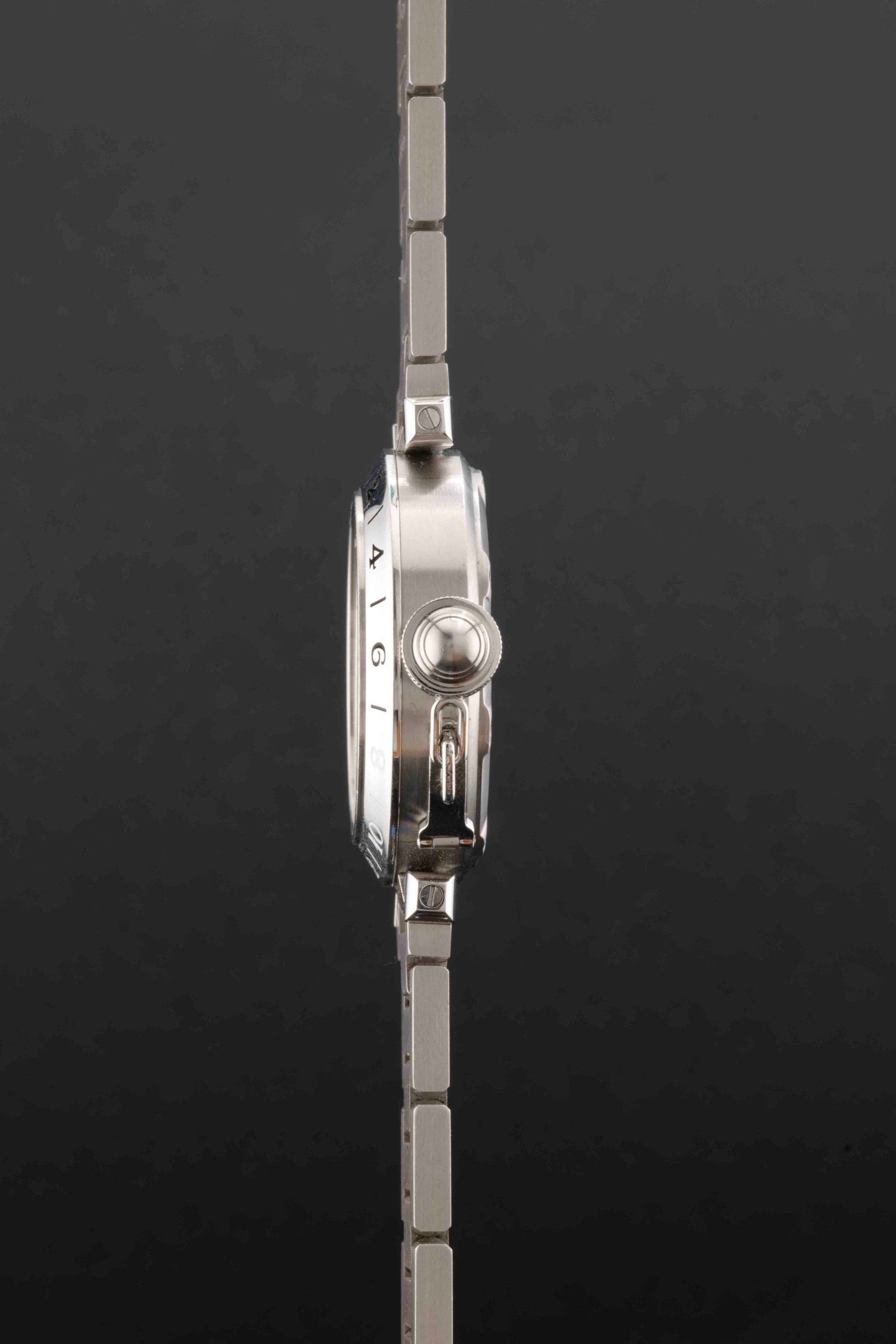 Case: round in steel, graduated fixed bezel, fluted round winding mechanism with screw protection, screw back.