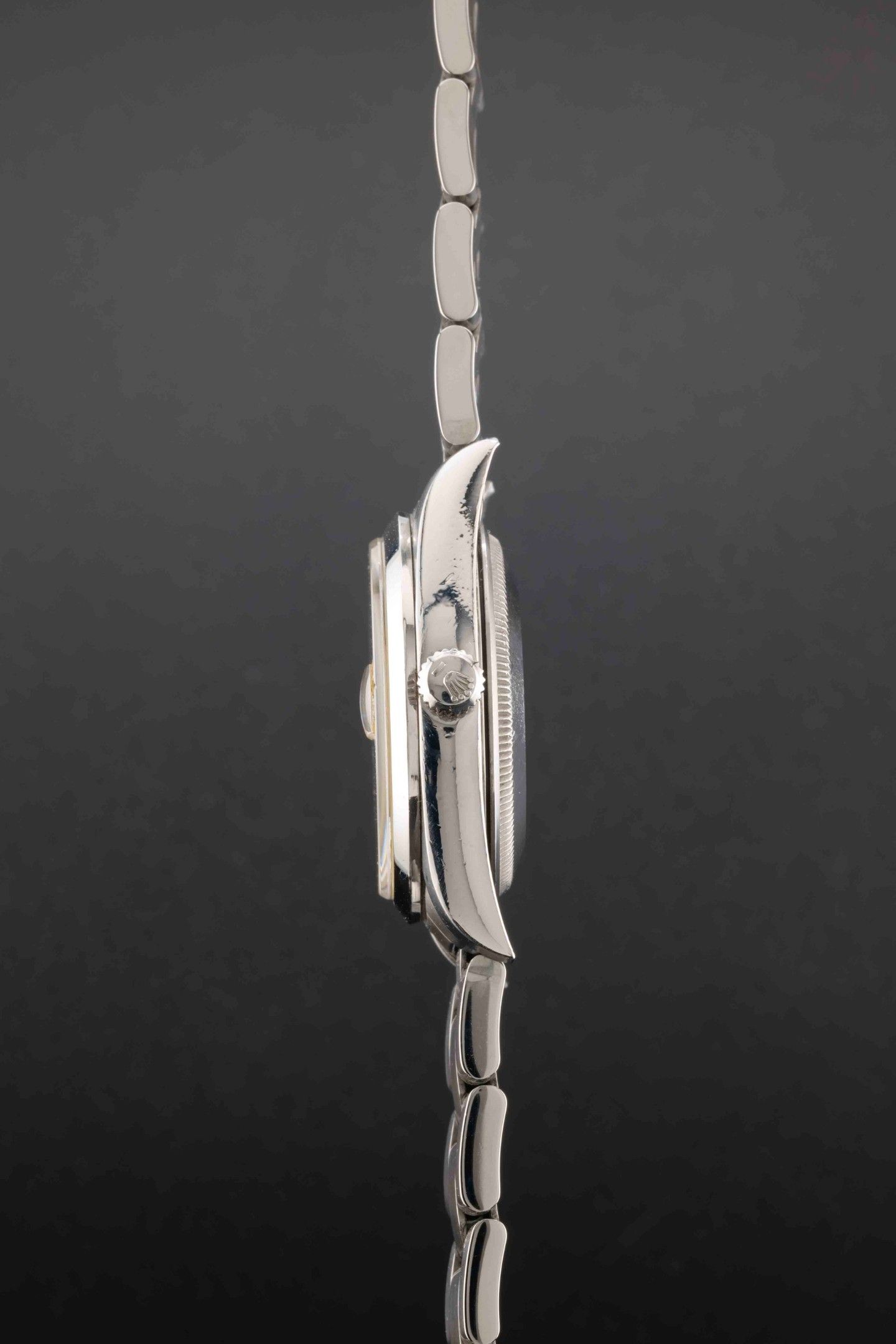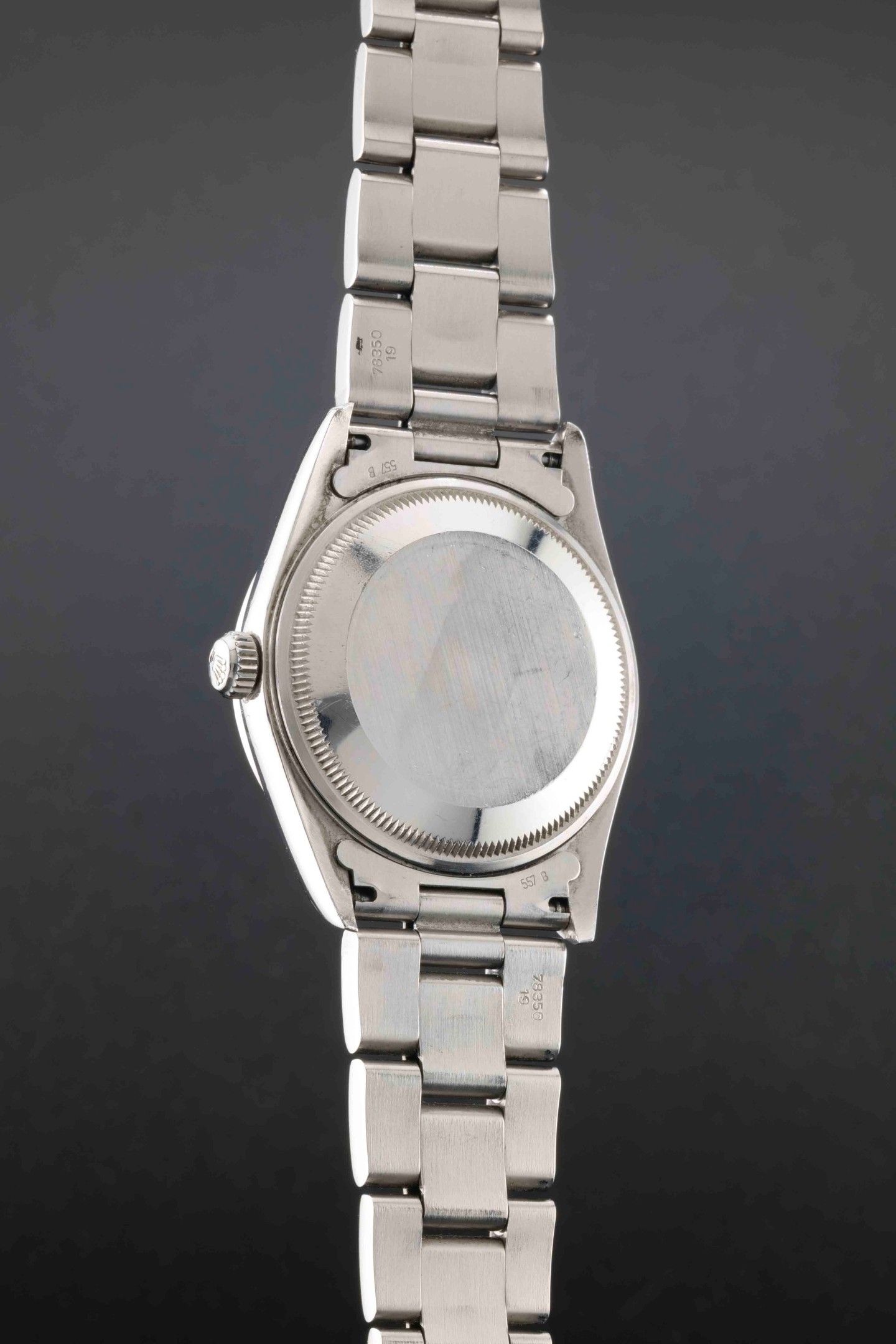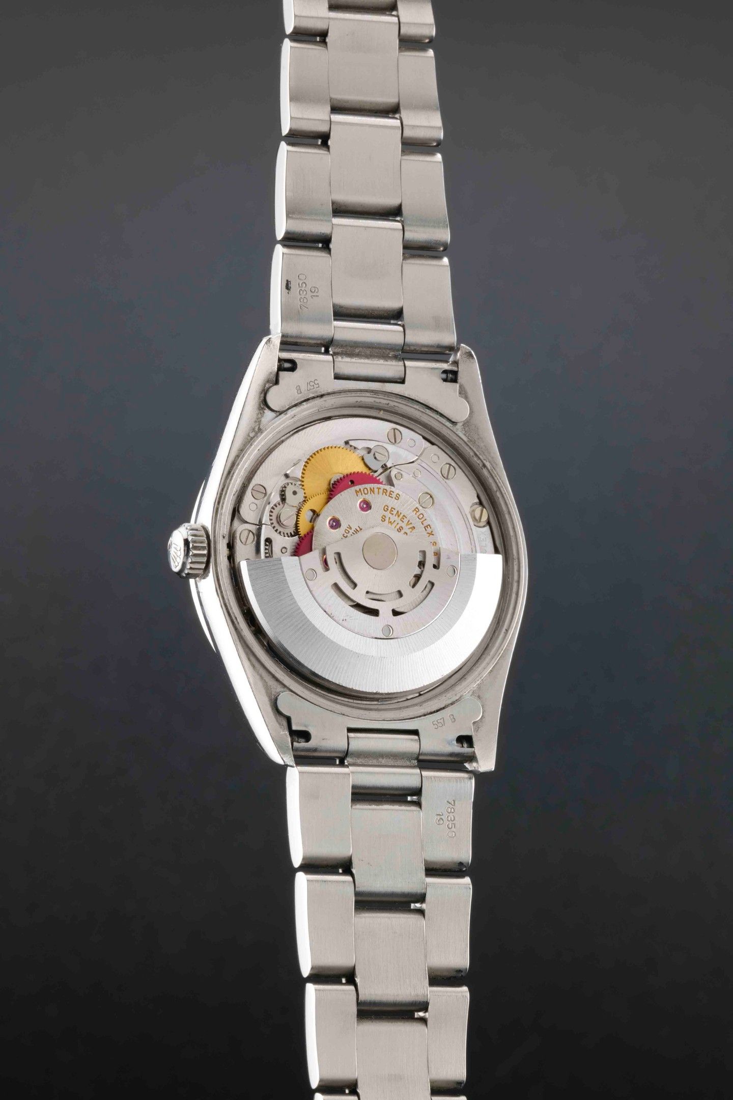 ROLEX Oyster Perpetual Date Ref : 15200 Circa: 1994. Case: round steel, smooth bezel, signed fluted winding mechanism, screw-down back. Dial: silvered, signed Rolex, applied baton hour markers, date window at 3 o'clock. Hands: batons. Glass: sapphire. Movement: mechanical self-winding, Rolex calibre 3135. Strap: steel oyster with Rolex 78350/19 folding clasp, endlink 557B. Set: none. Diameter: 34 mm. Length: 19 cm. Consulted by Mr Vautrin, Olivine Prestige company.