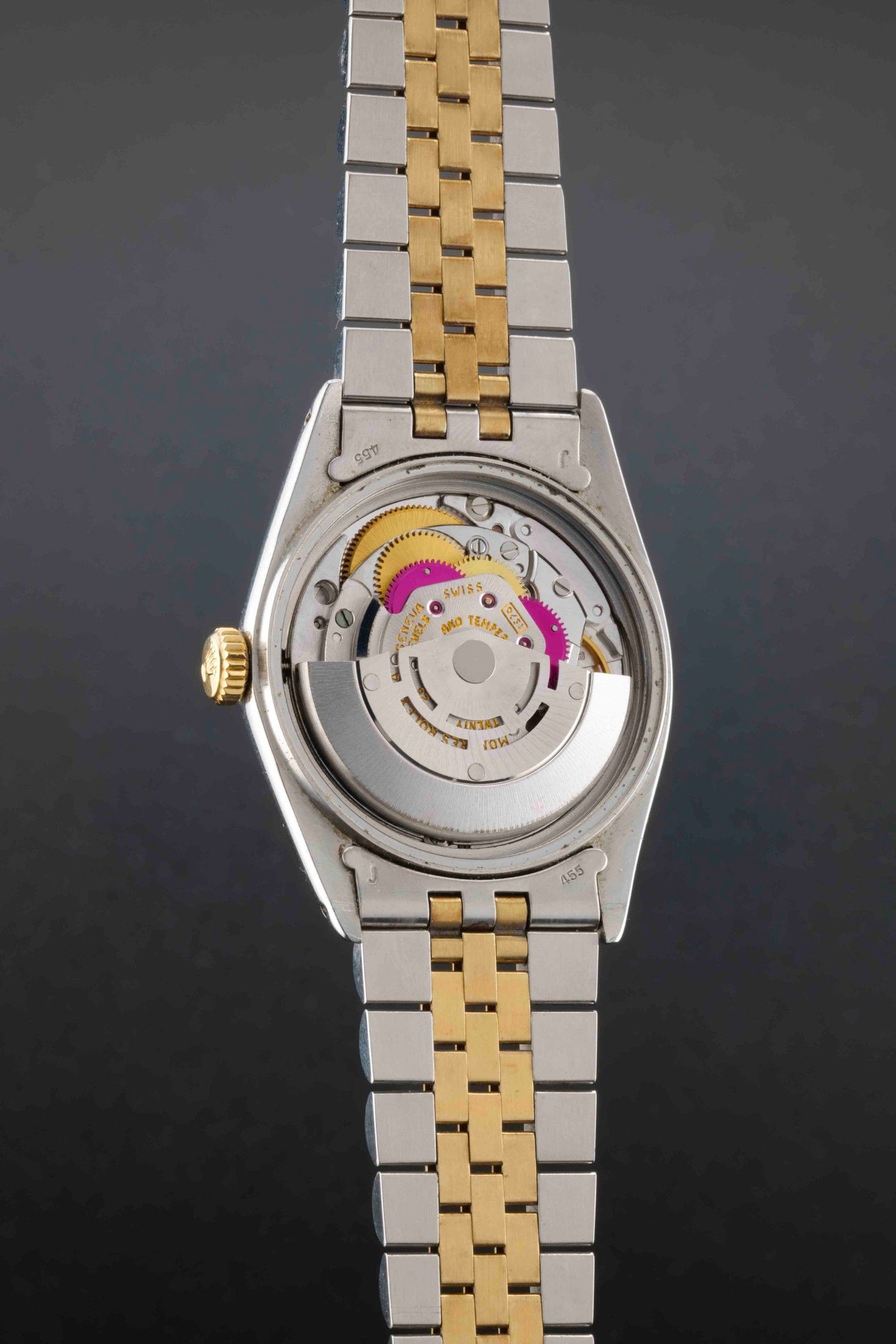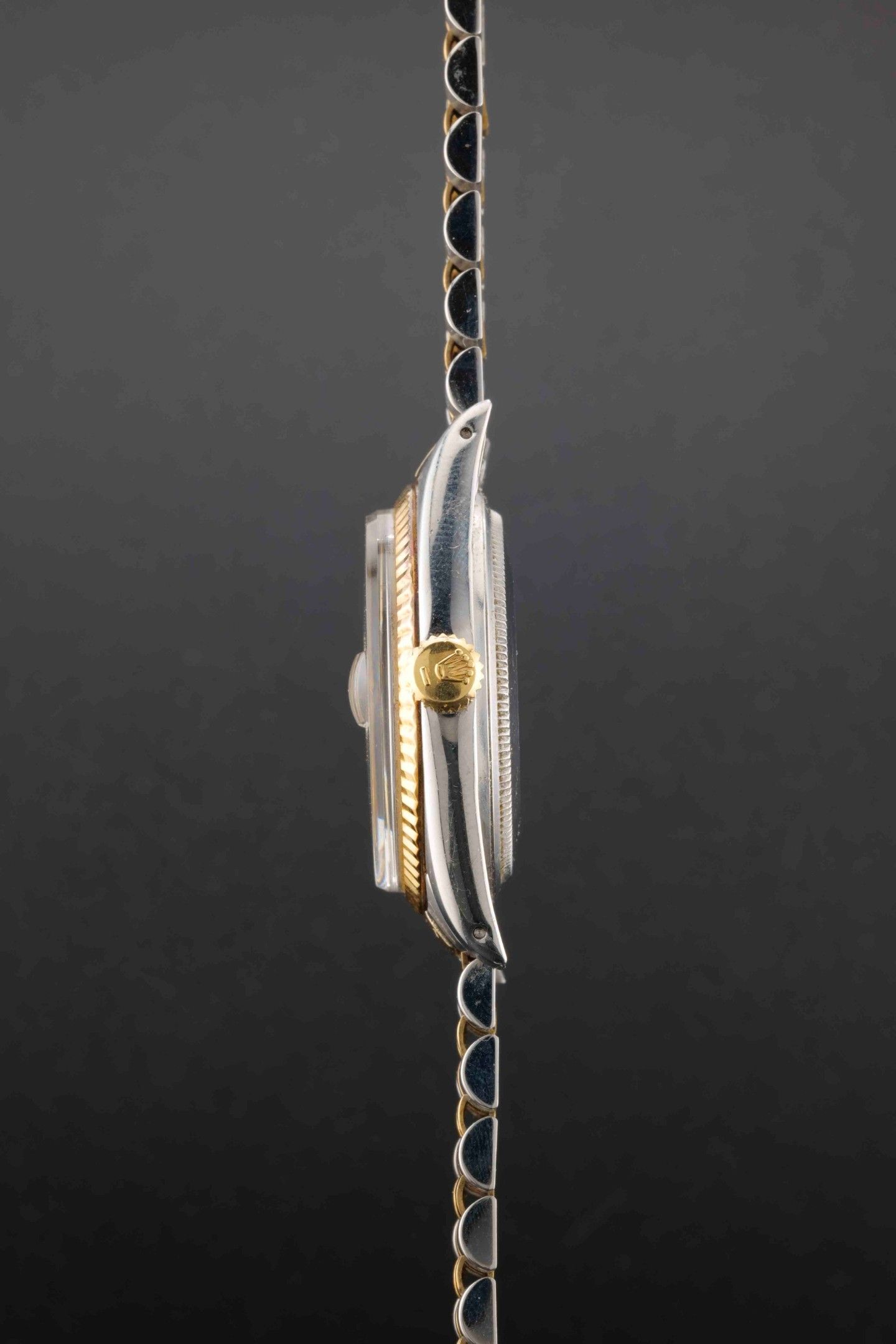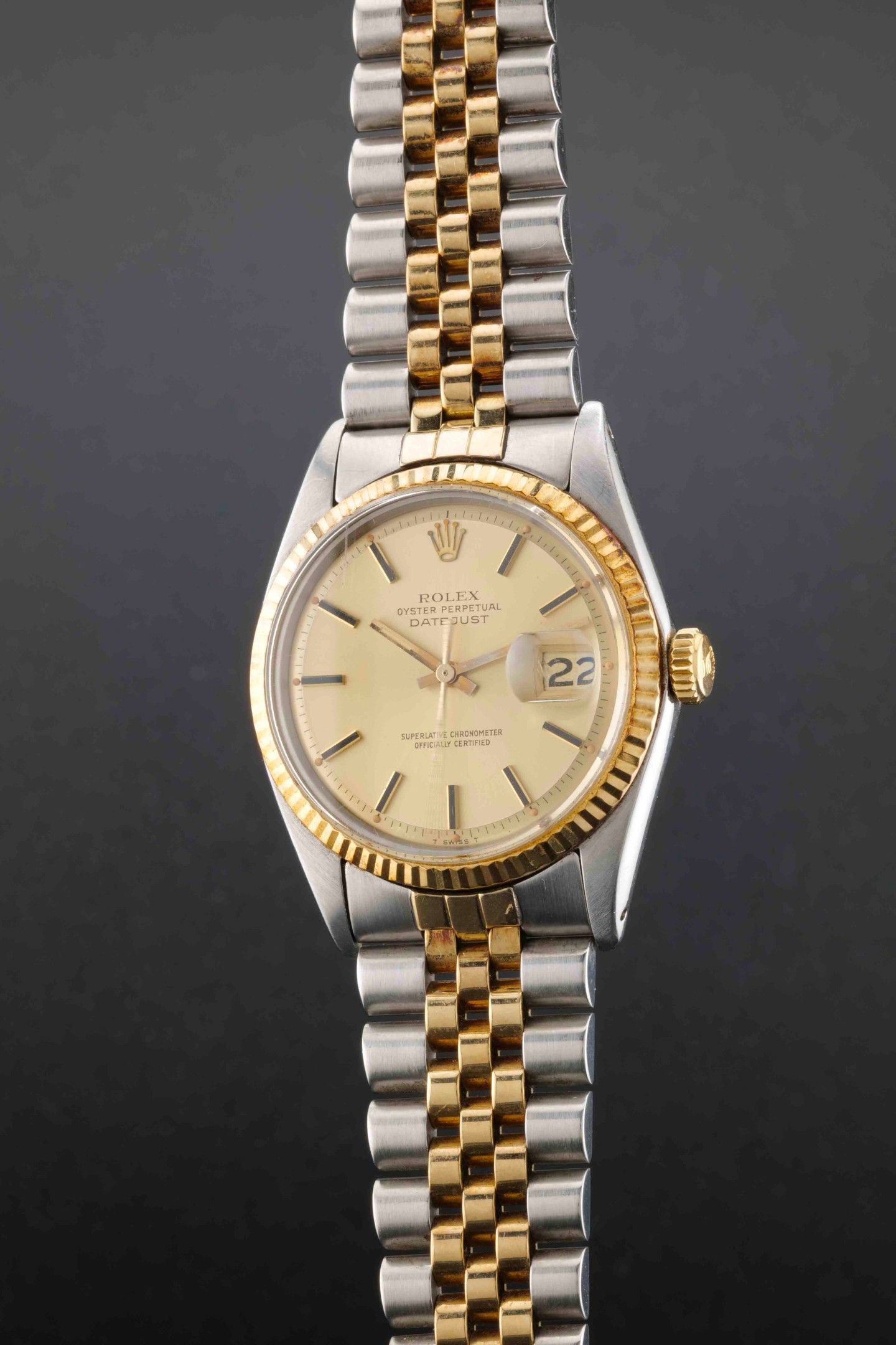 ROLEX Datejust Ref : 1601 Circa: 1973. Case: round steel, fluted bezel in 14k yellow gold, fluted and signed winding mechanism, screw-down back. Dial: gold dial signed Rolex, applied baton hour markers, date window at 3 o'clock. Hands: batons. Glass: organic. Strap: 14k gold and folded steel jubilee signed Rolex 62523H, endlink 455. Movement: mechanical self-winding, calibre 1570. Set: none. Diameter: 36 mm. Length: 19 cm. Gross weight: 94.10 g. Consulted by Mr Vautrin, Olivine Prestige company.