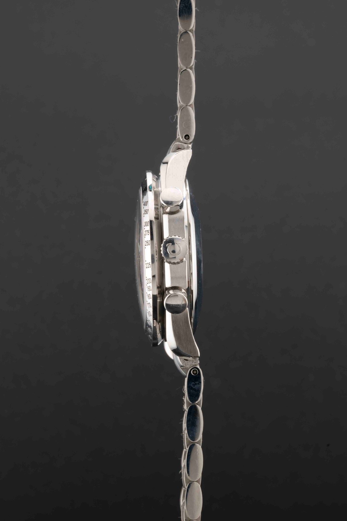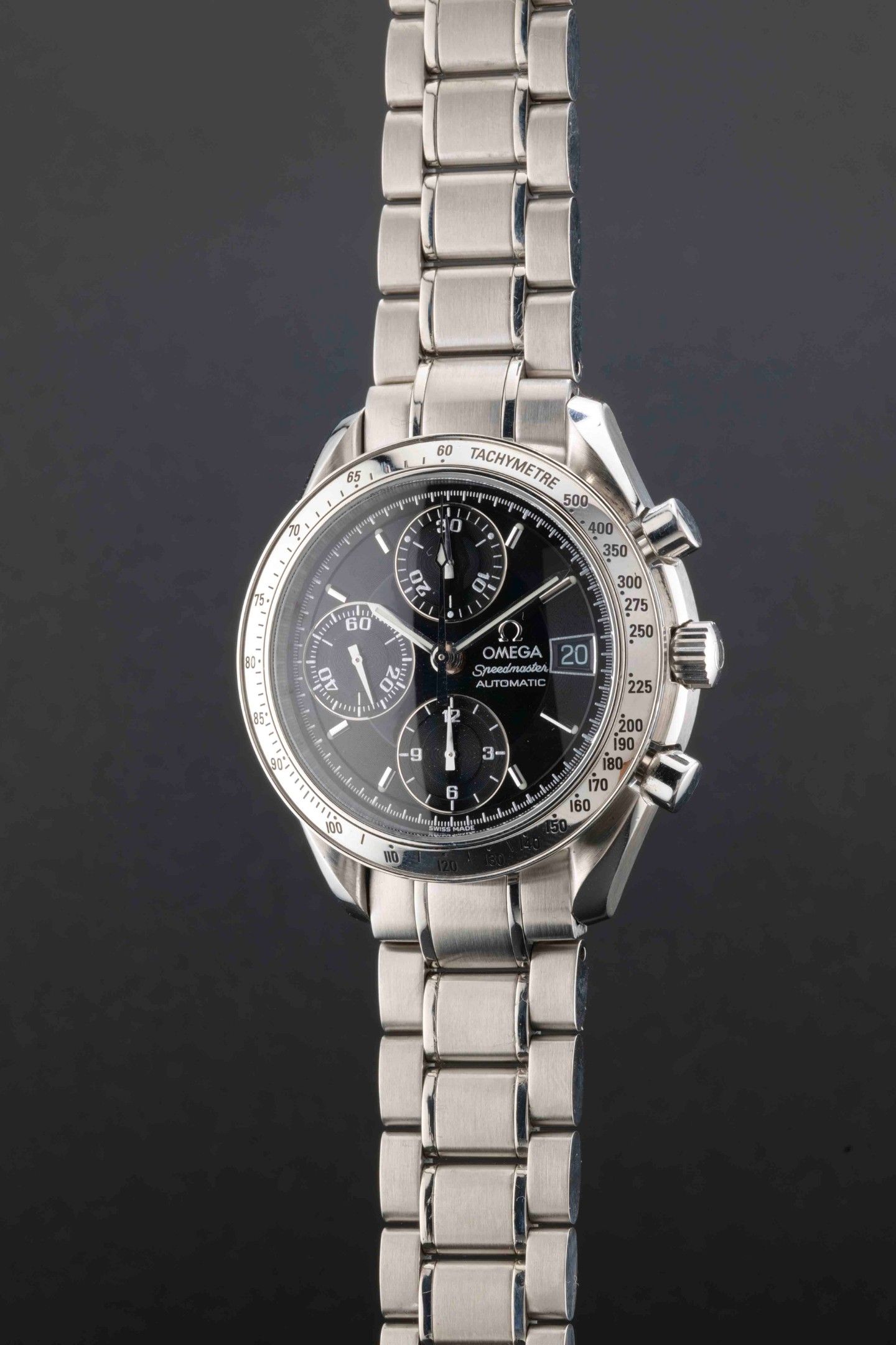 Dial: black signed Omega, date window at 3 o'clock, applied baton hour markers, sub-counter at 6 o'clock for the hours, sub-counter at 9 o'clock for the seconds, sub-counter at 12 o'clock for the minutes.