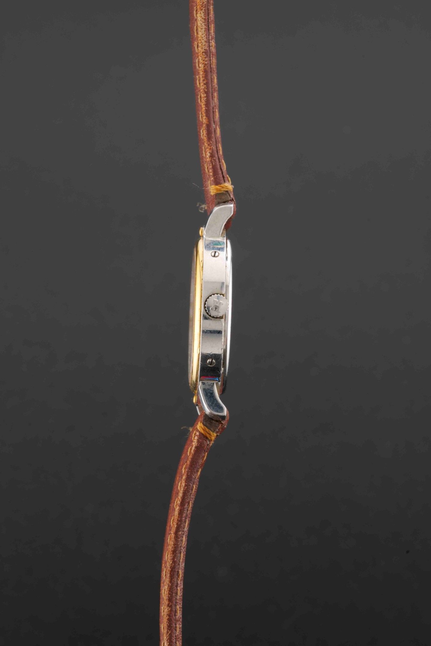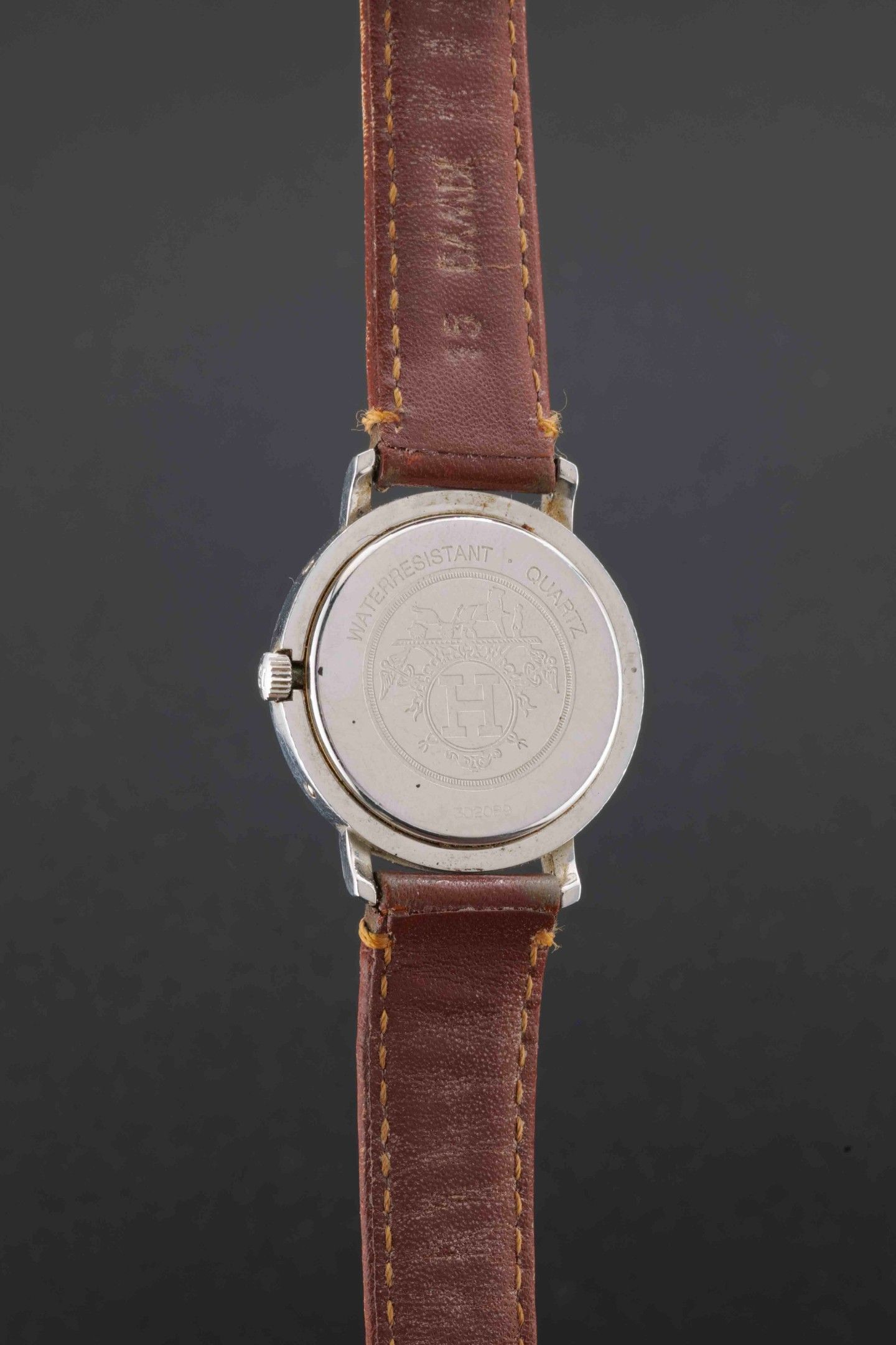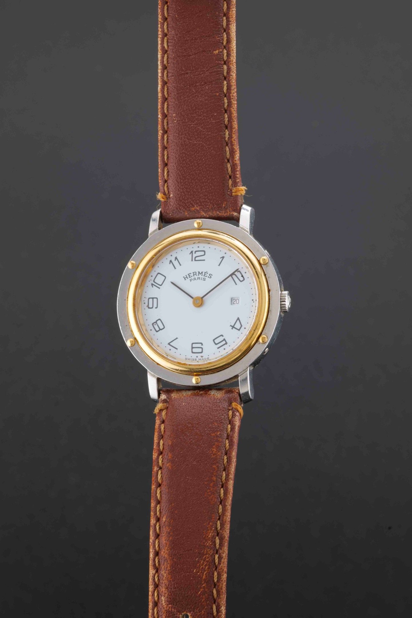 Dial: white signed Hermès, painted beaded hour-markers and painted Arabic numerals, date window at 3 o'clock.