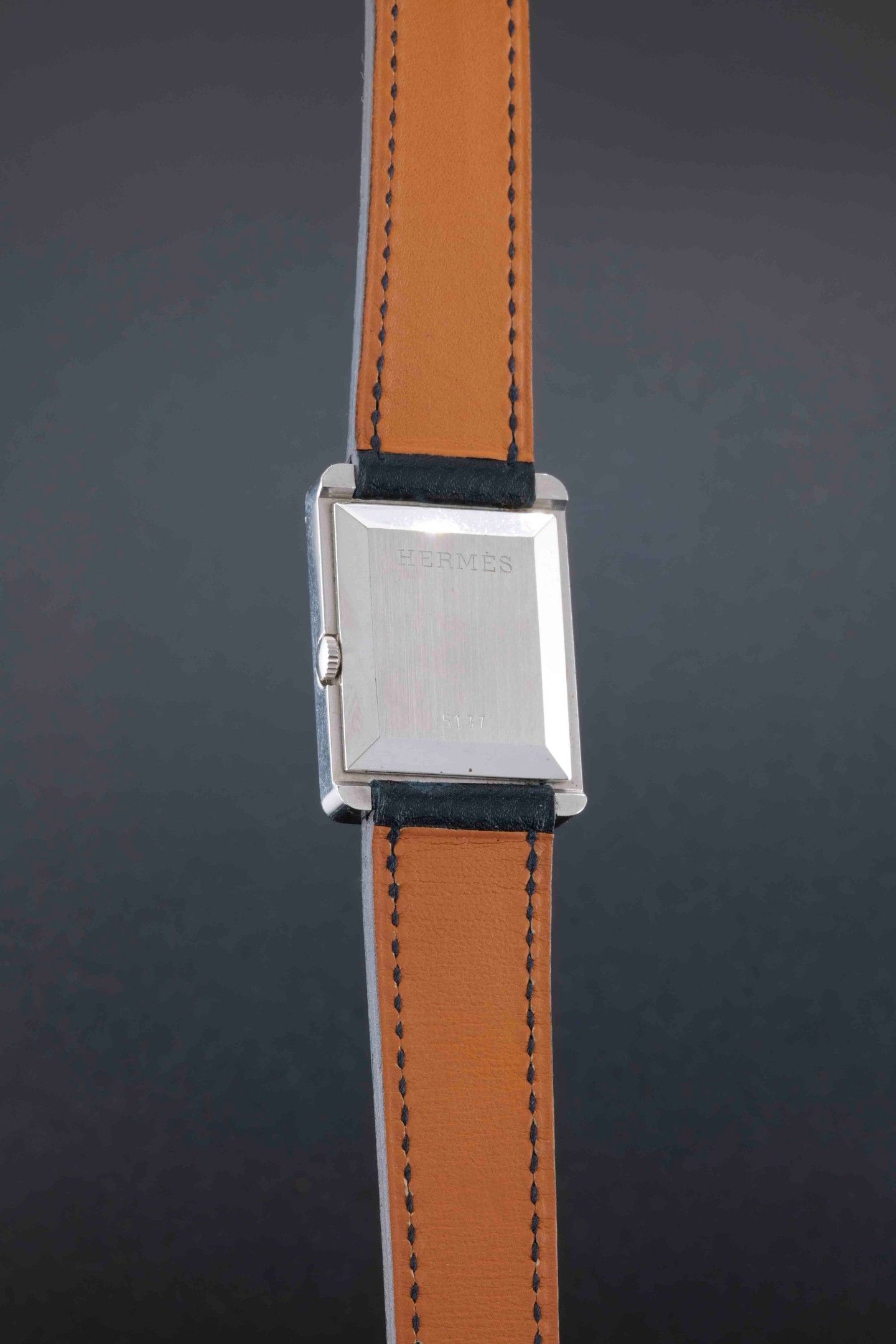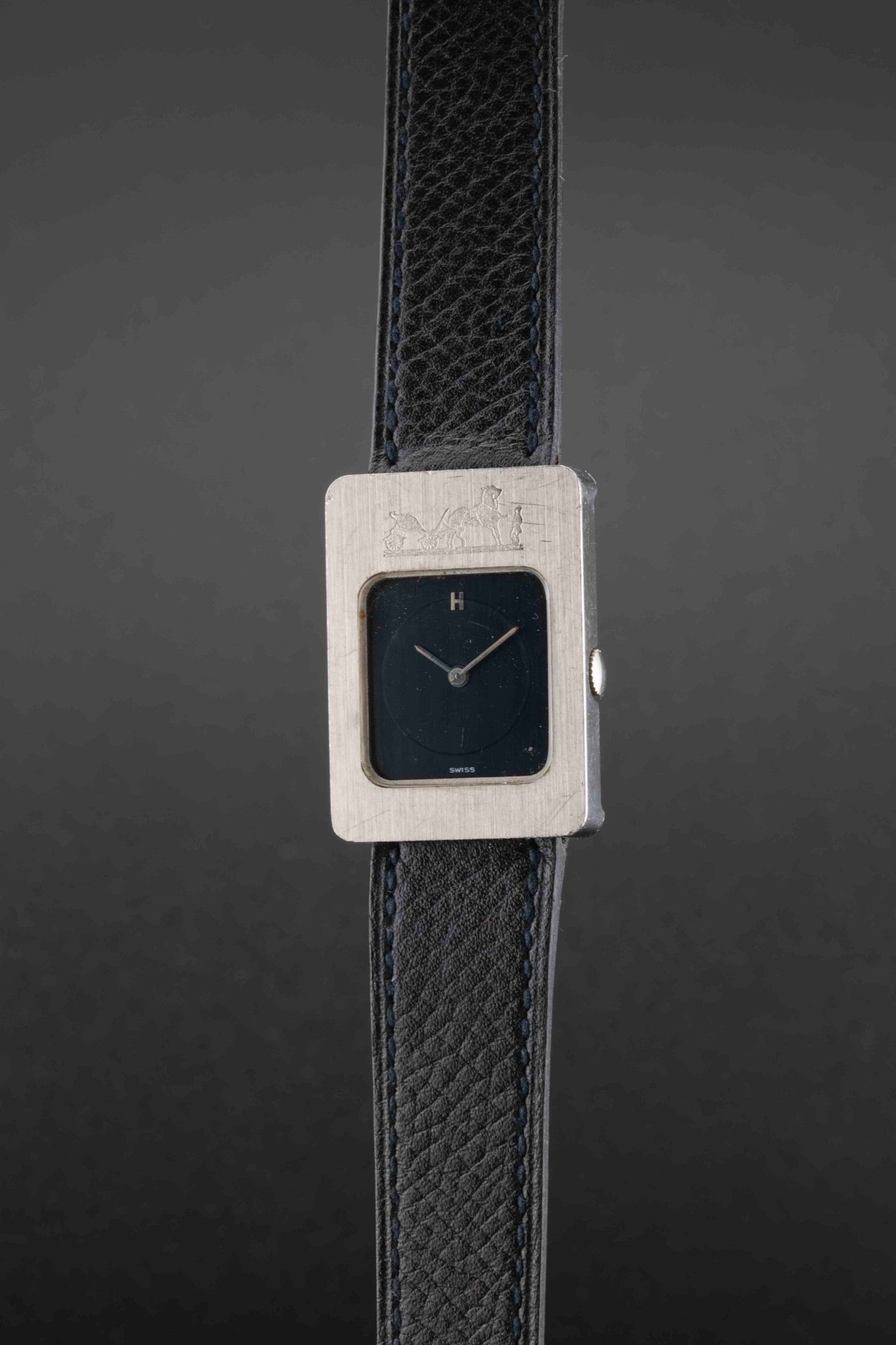 Strap: black leather strap signed Hermès, steel pin buckle.