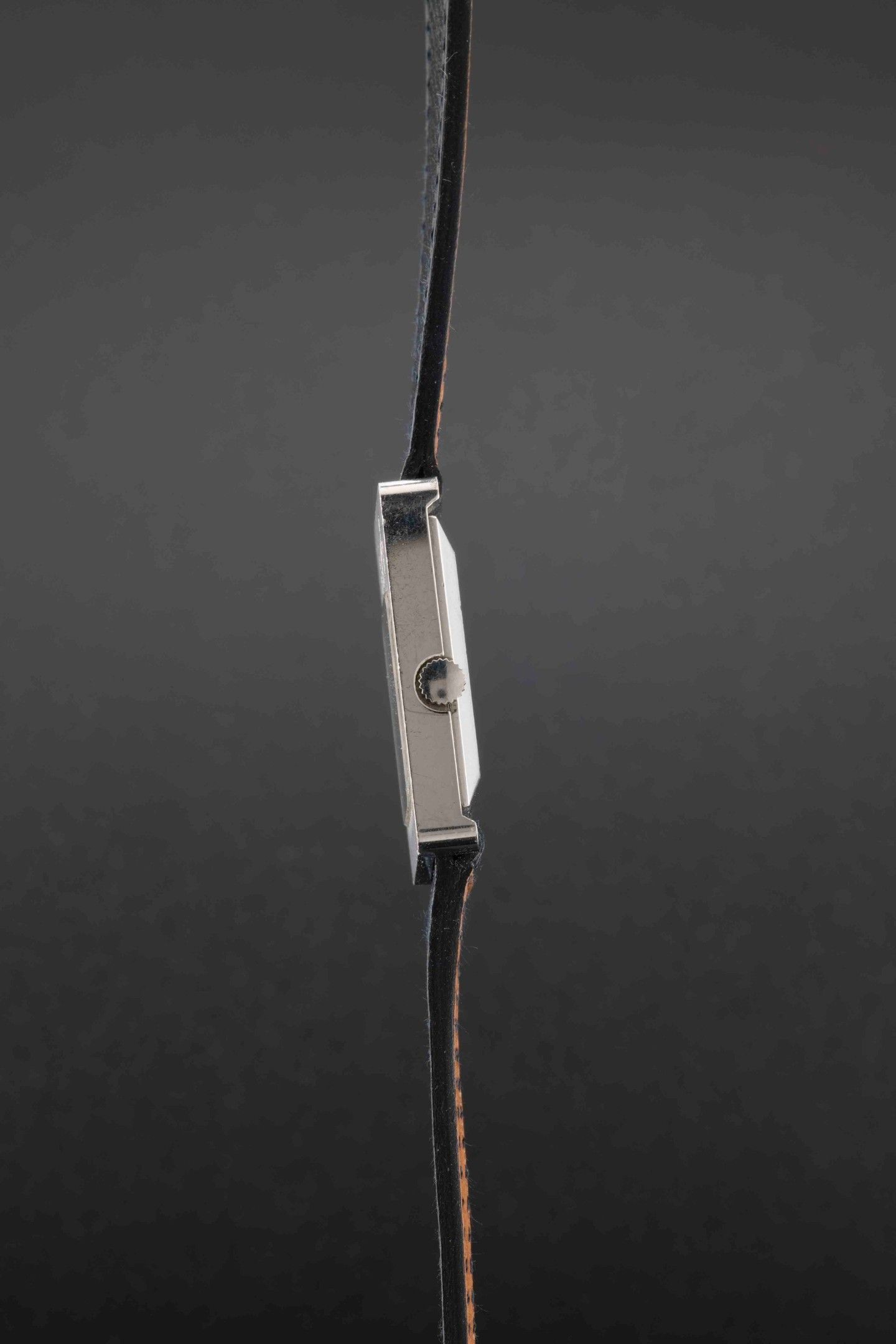 Case: rectangular steel, smooth bezel, round fluted winding mechanism, clip-on back.