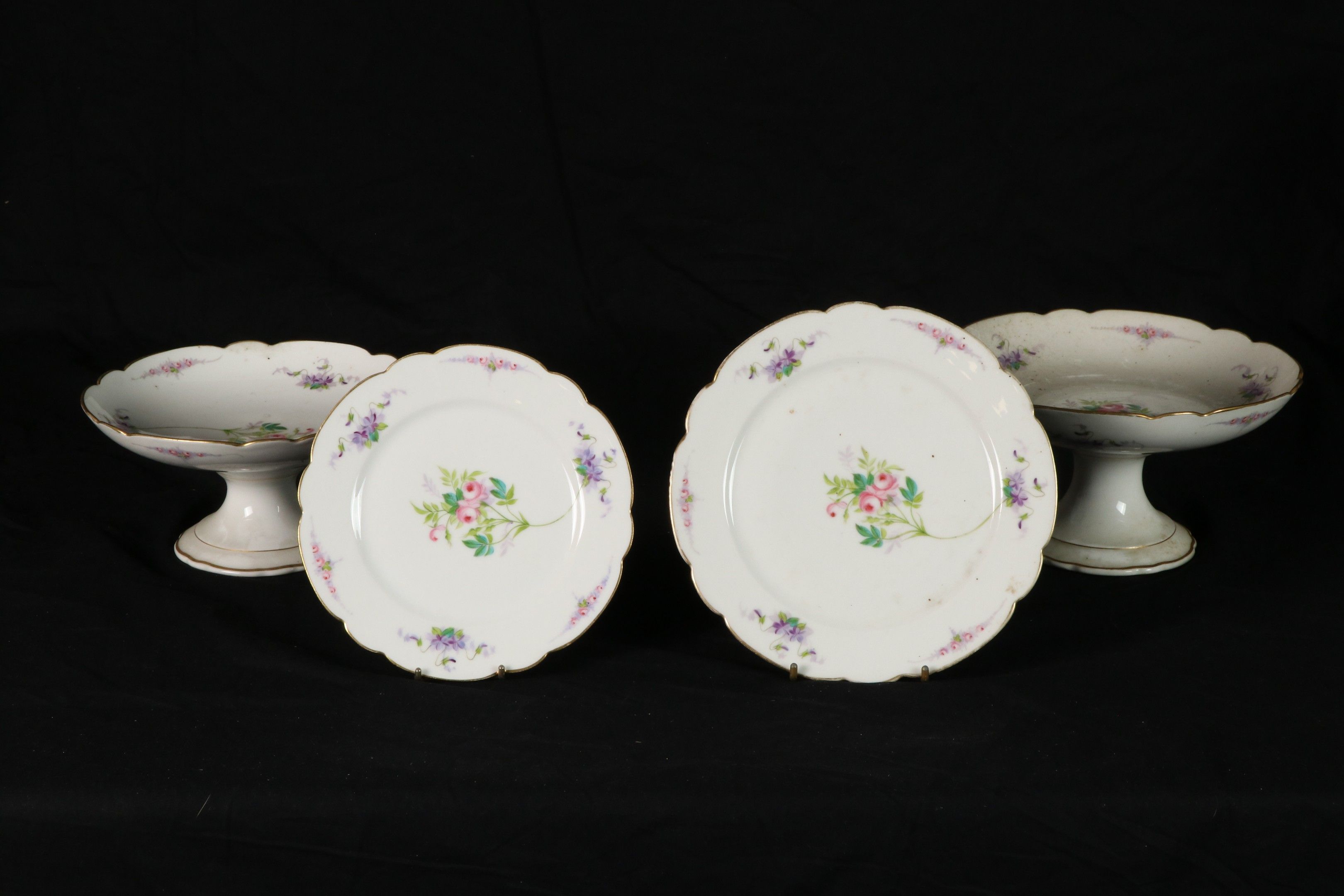 Porcelain dessert service with polychrome decoration of a branch of roses in the basin and violets and roses on the contoured wing highlighted with gold fillets. 19th century. Comprising: 18 plates, 4 trays and 2 bowls. D. 20 cm (slight wear).