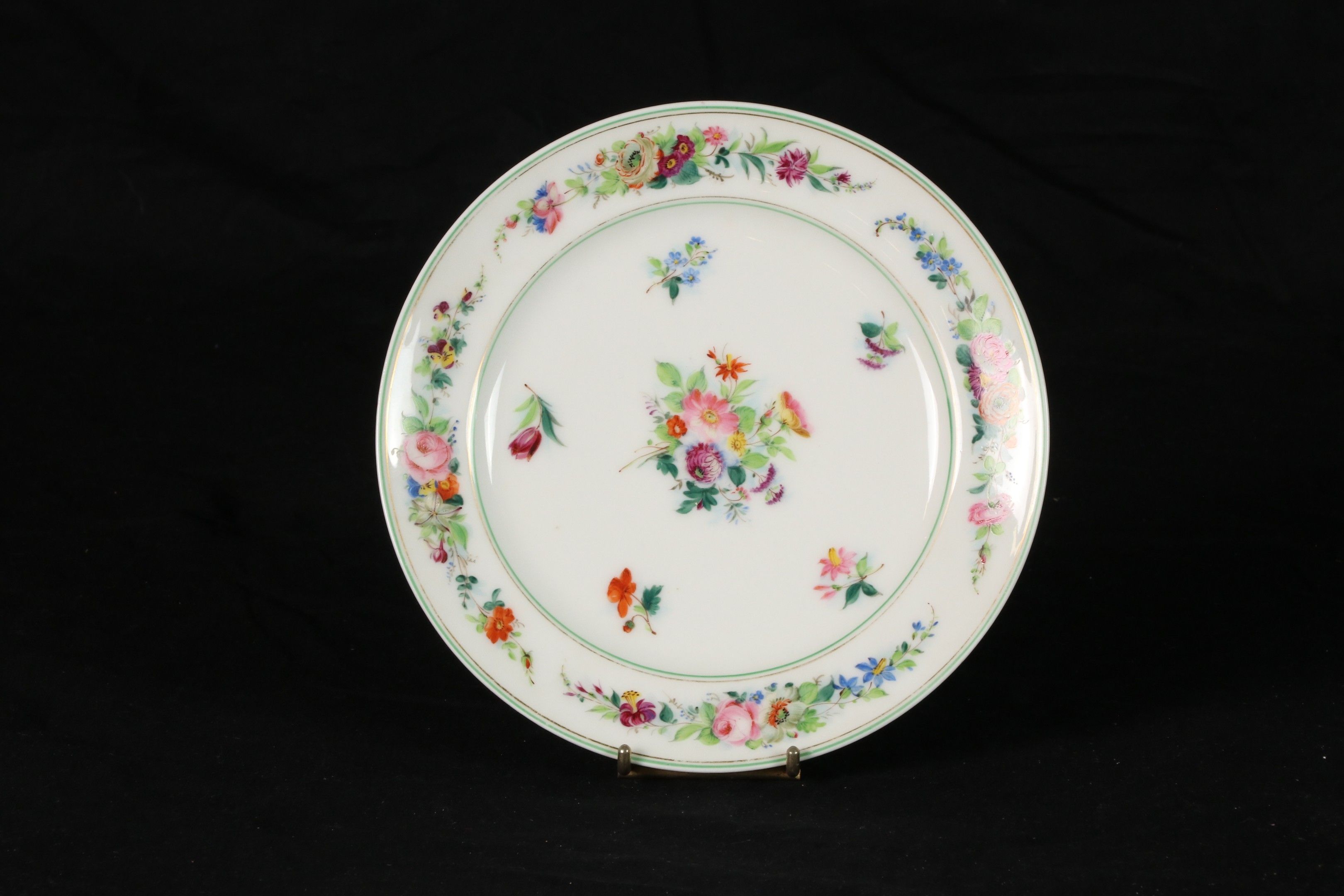 Set of 10 porcelain dessert plates with polychrome decoration of bouquets and flowers on the base and floral friezes on the rim with gold and green fillets (slight wear).