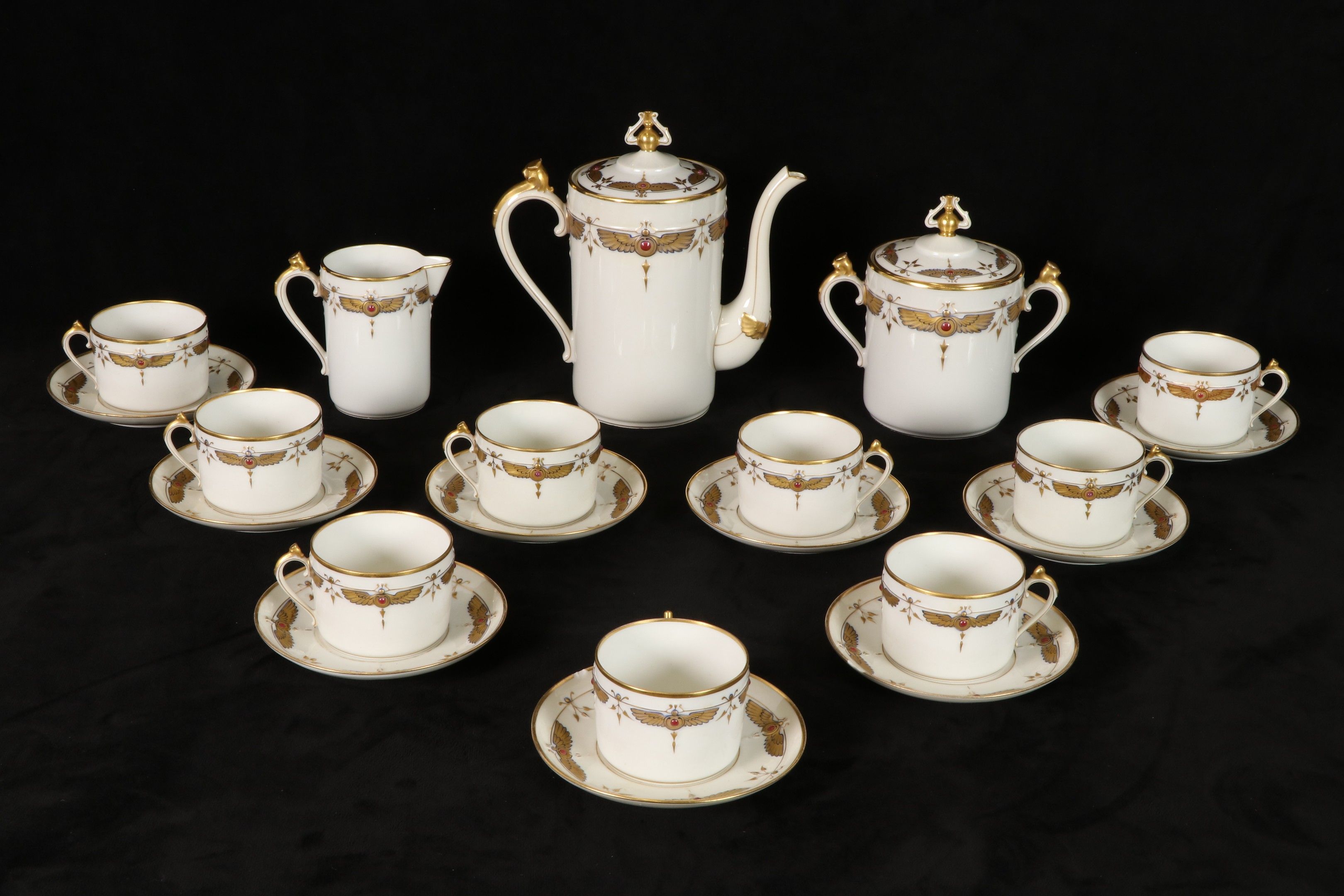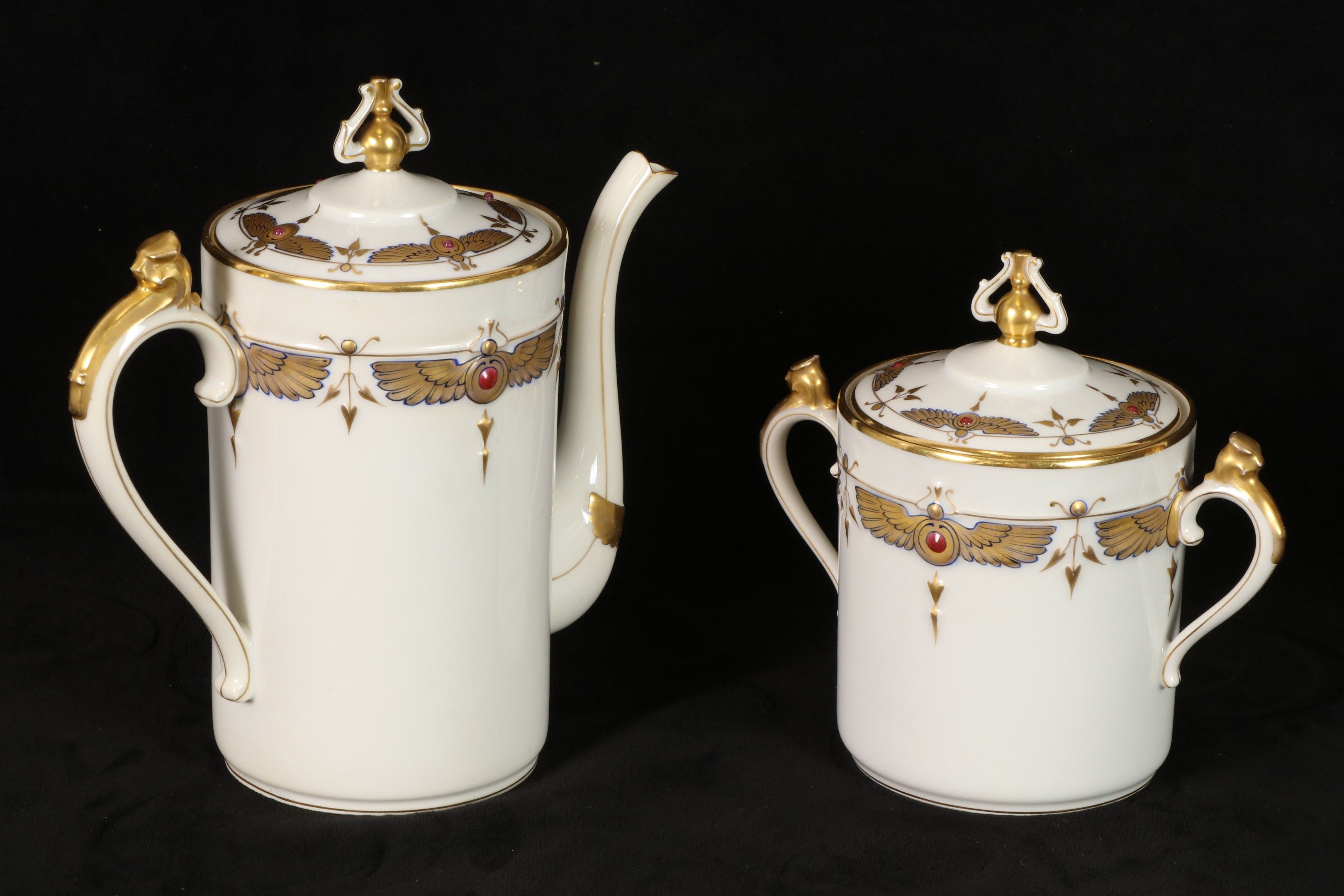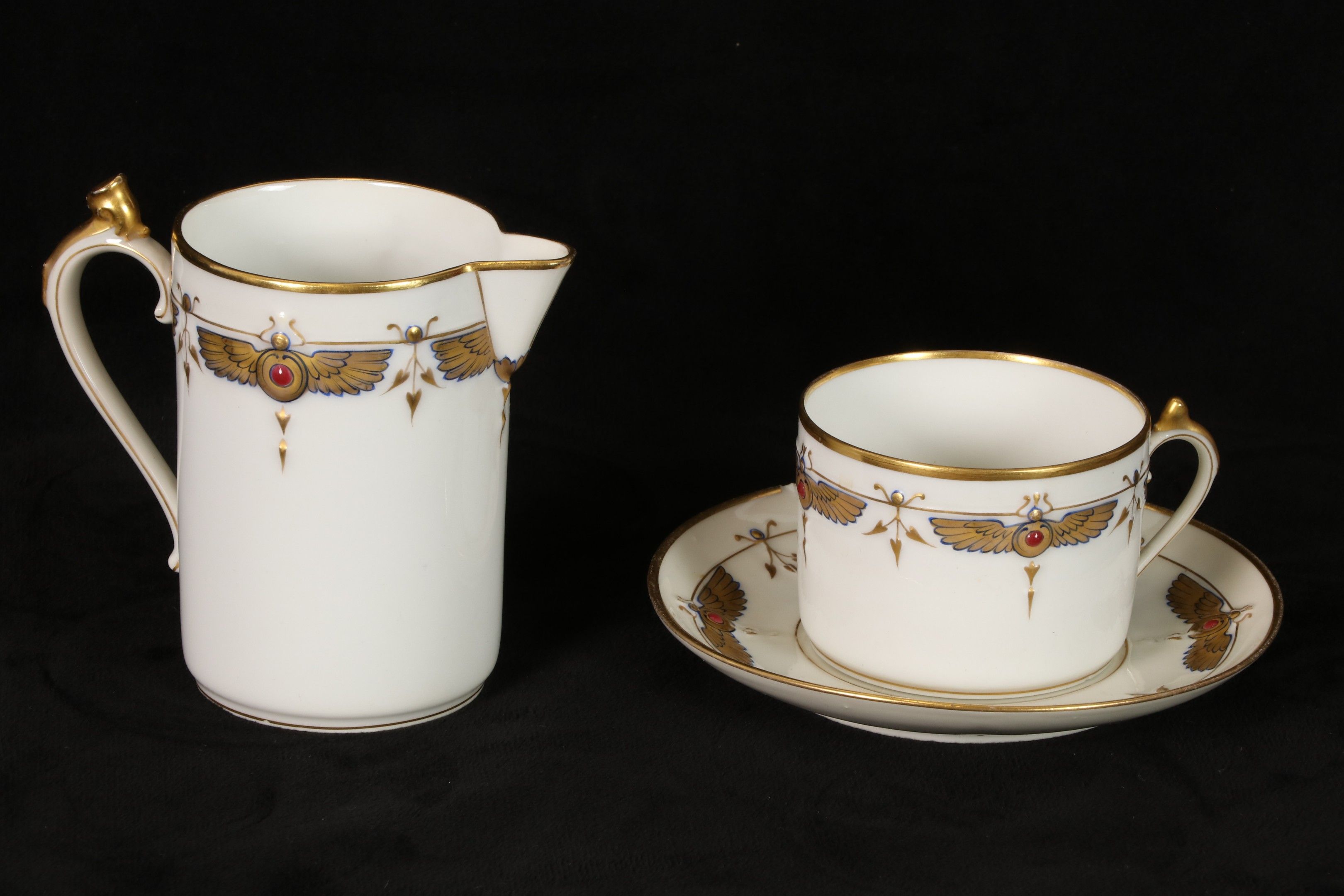 BAC ET PERIGAULT (1874-1919), Limoges - Porcelain tea service decorated with scarabs with gold highlights in the Egyptian style comprising 9 cups (one damaged) and their saucers (two chipped), a dish, a teapot, a creamer and a sugar bowl.