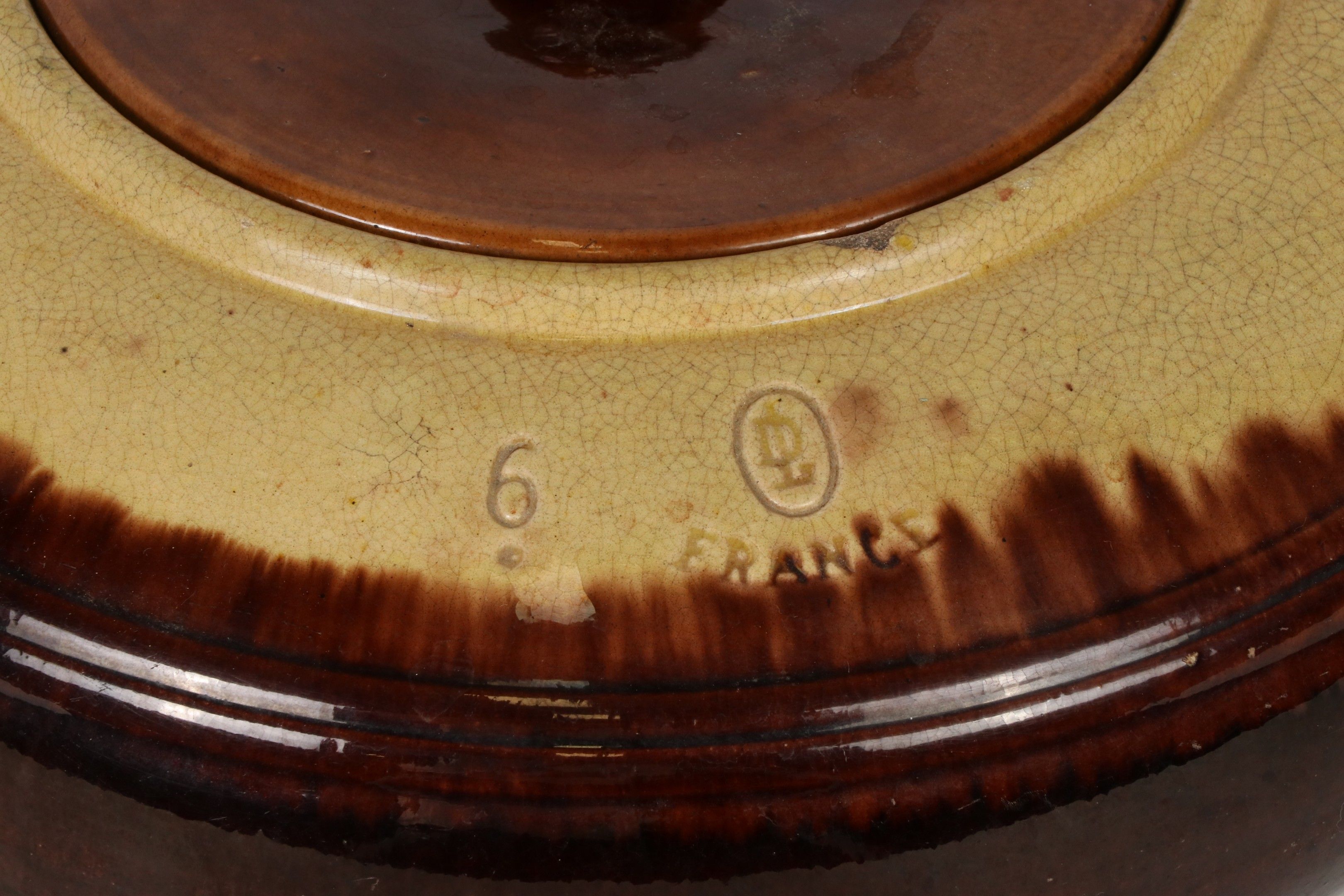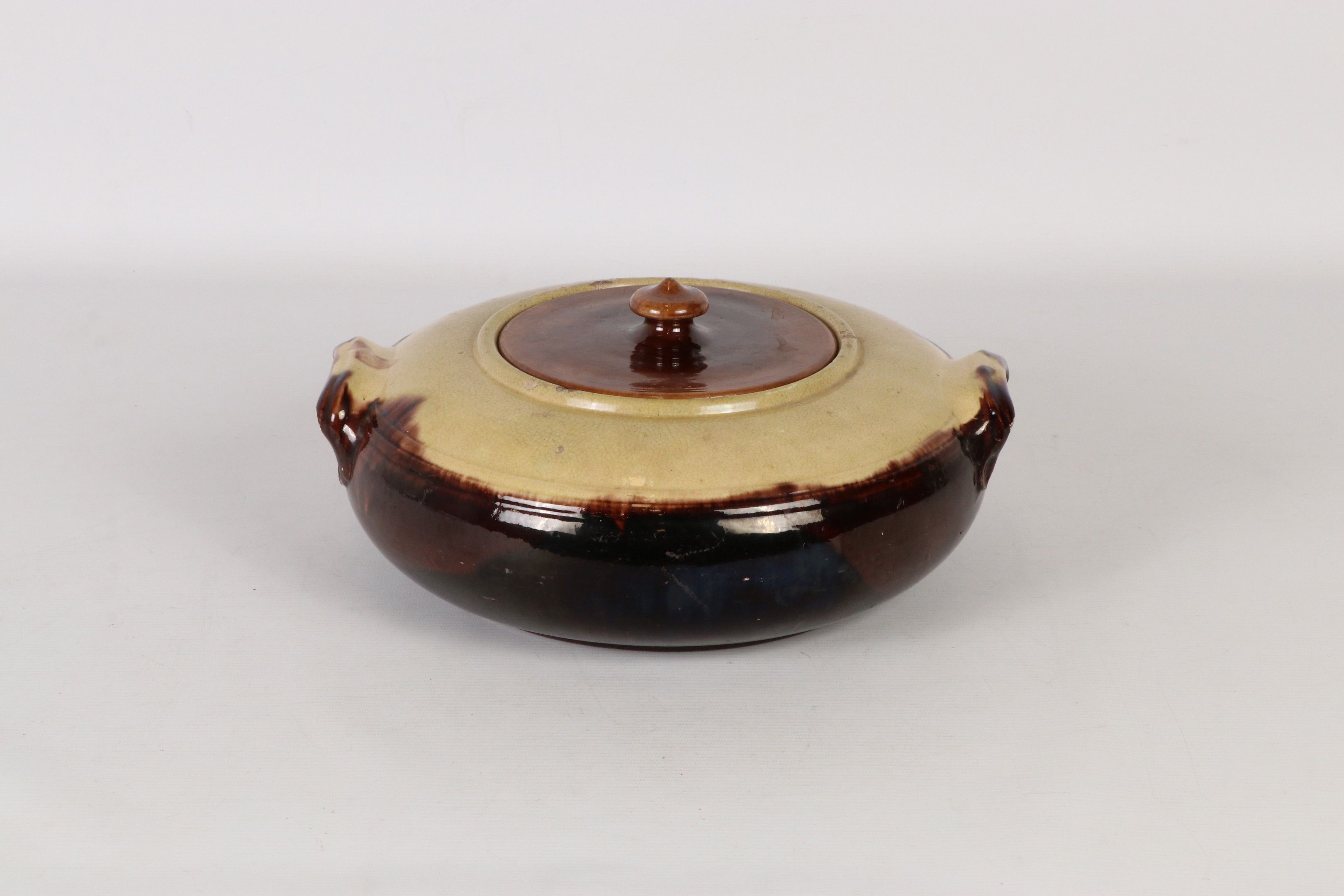 Round glazed earthenware trivet with two handles. (small chips and broken enamel).