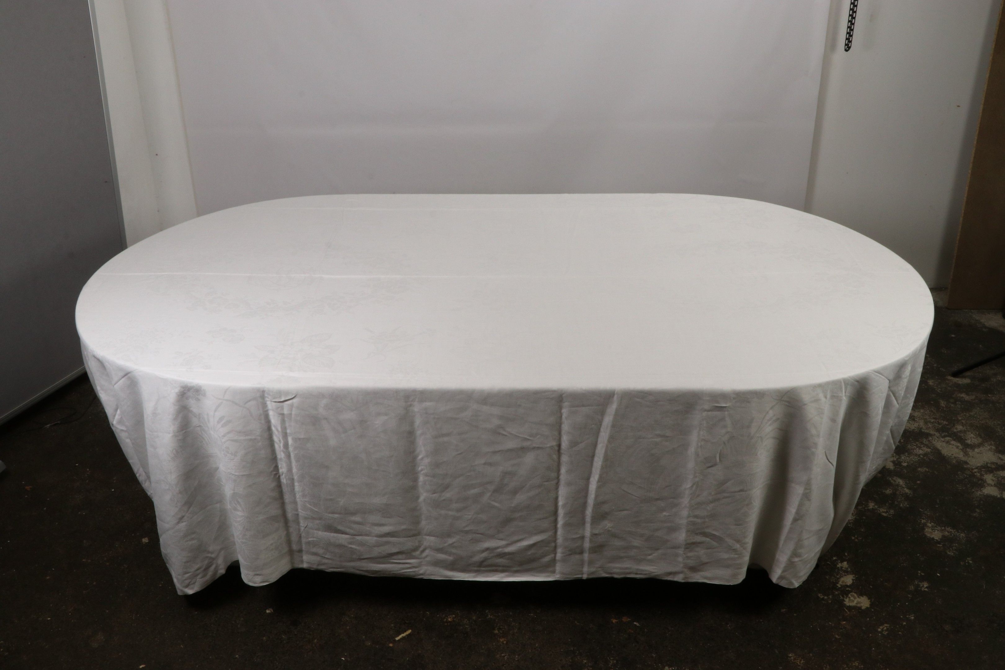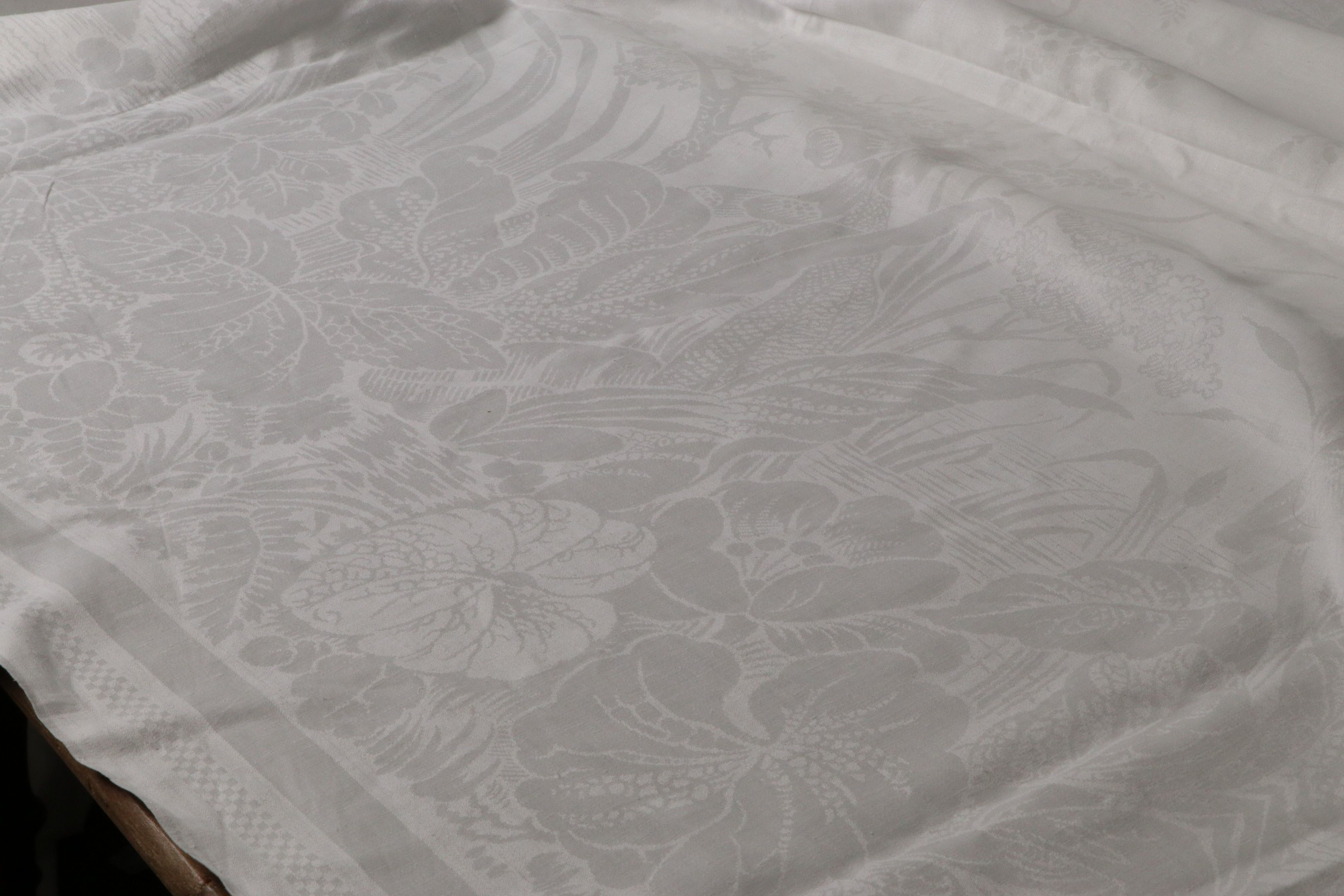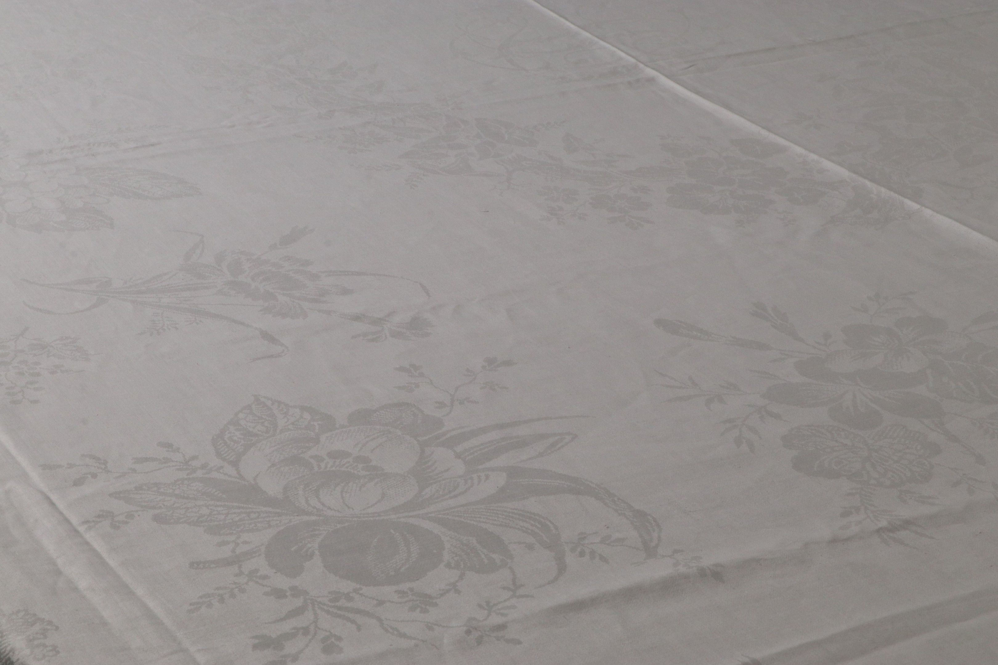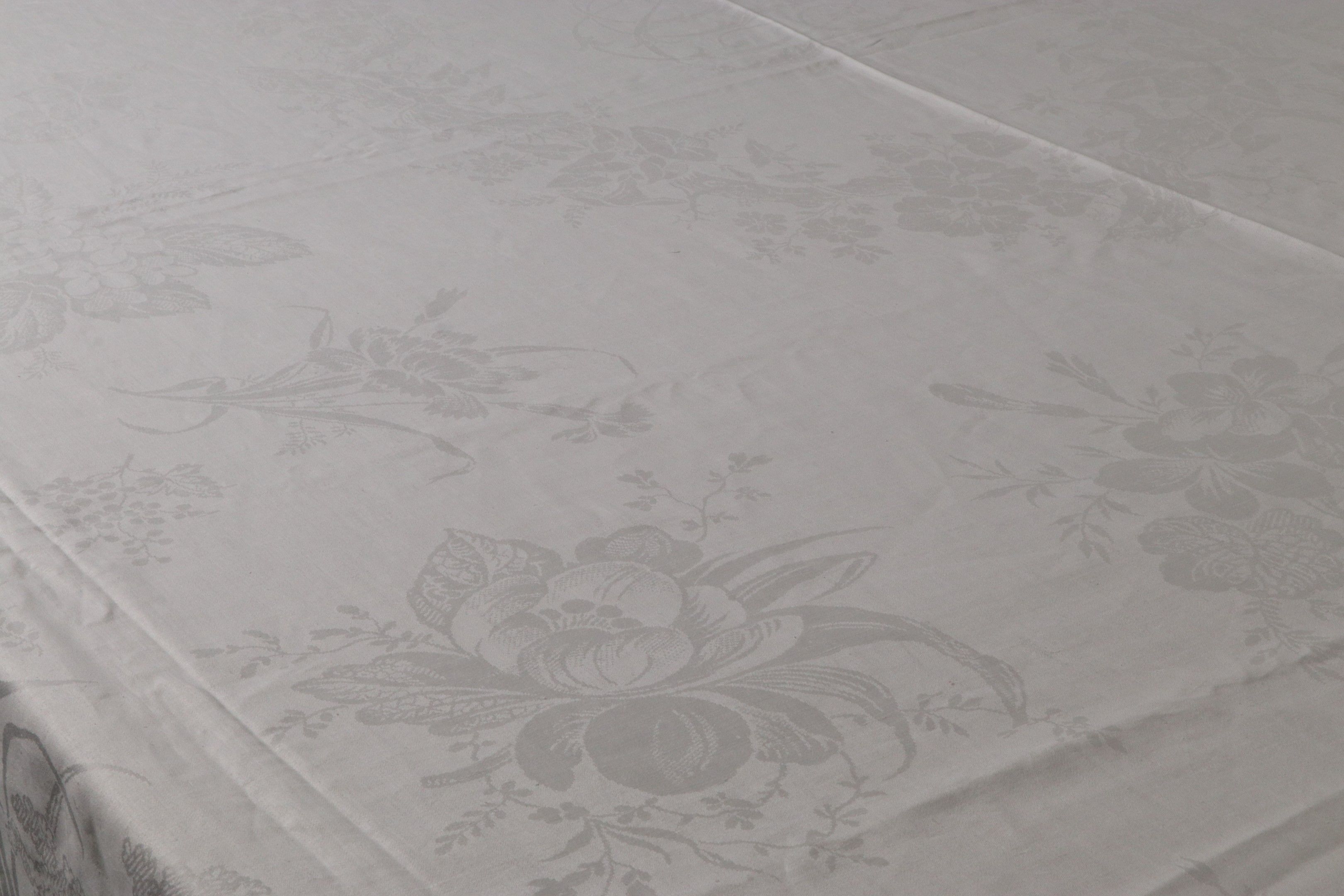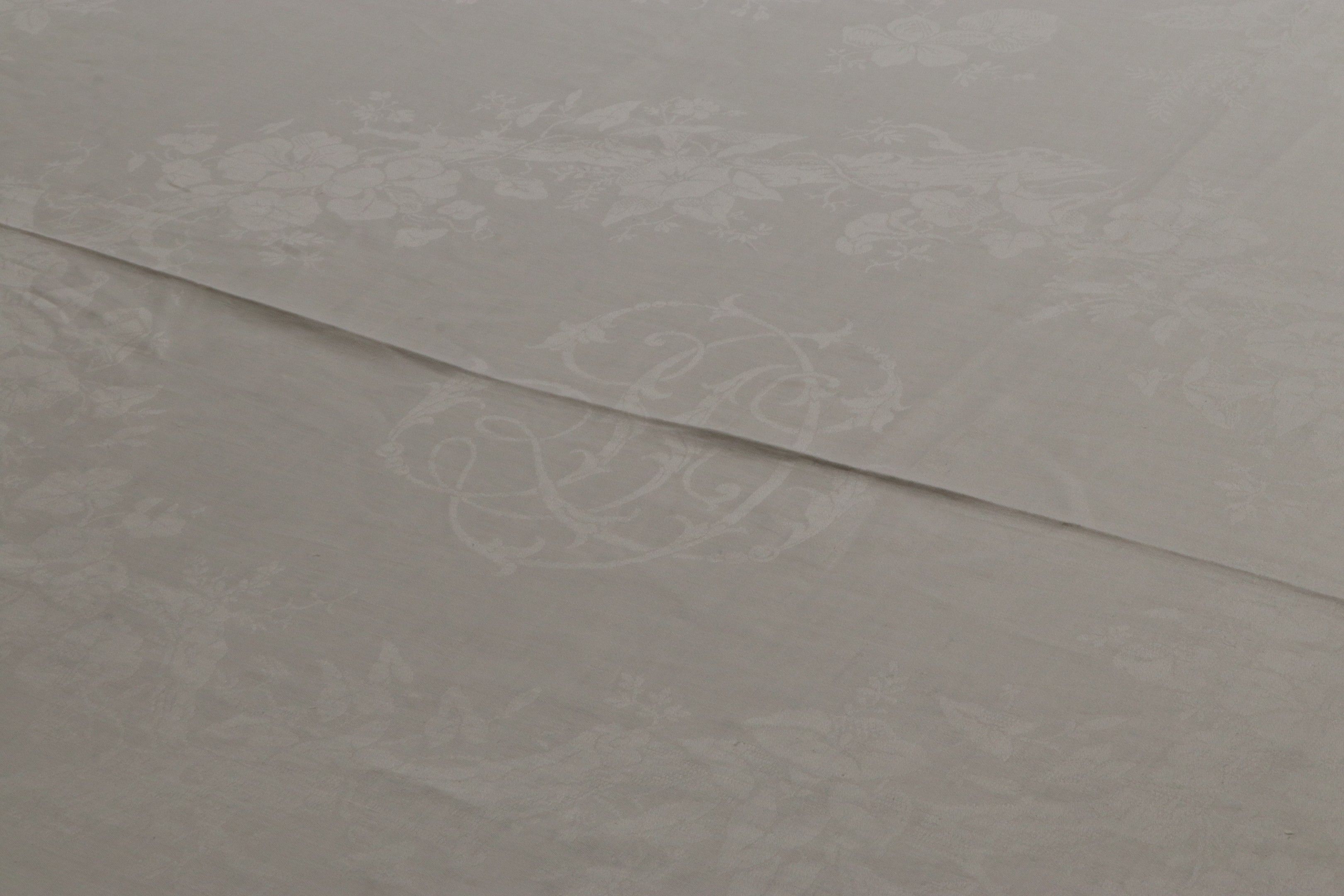 A large rectangular damask tablecloth of fine workmanship, figured LD three times in the weft in the centre with garlands of flowers, surrounded by aquatic plants, boats and carrelets. 540 x 248 cm approx. Early 20th century (slight wear).