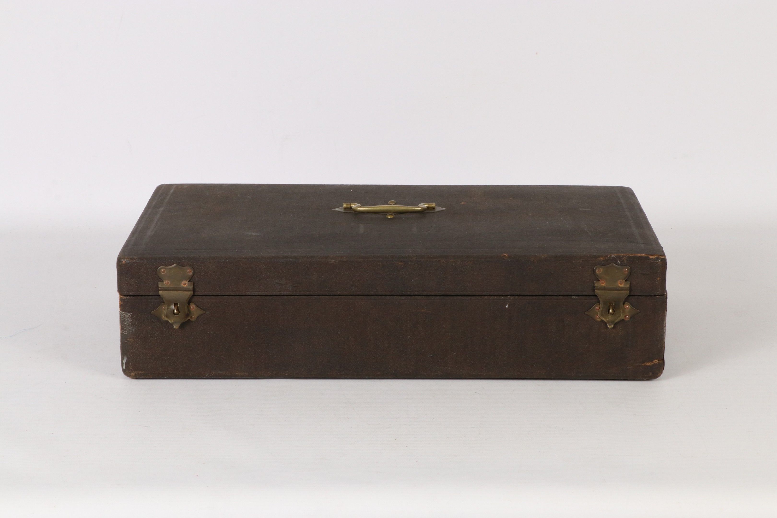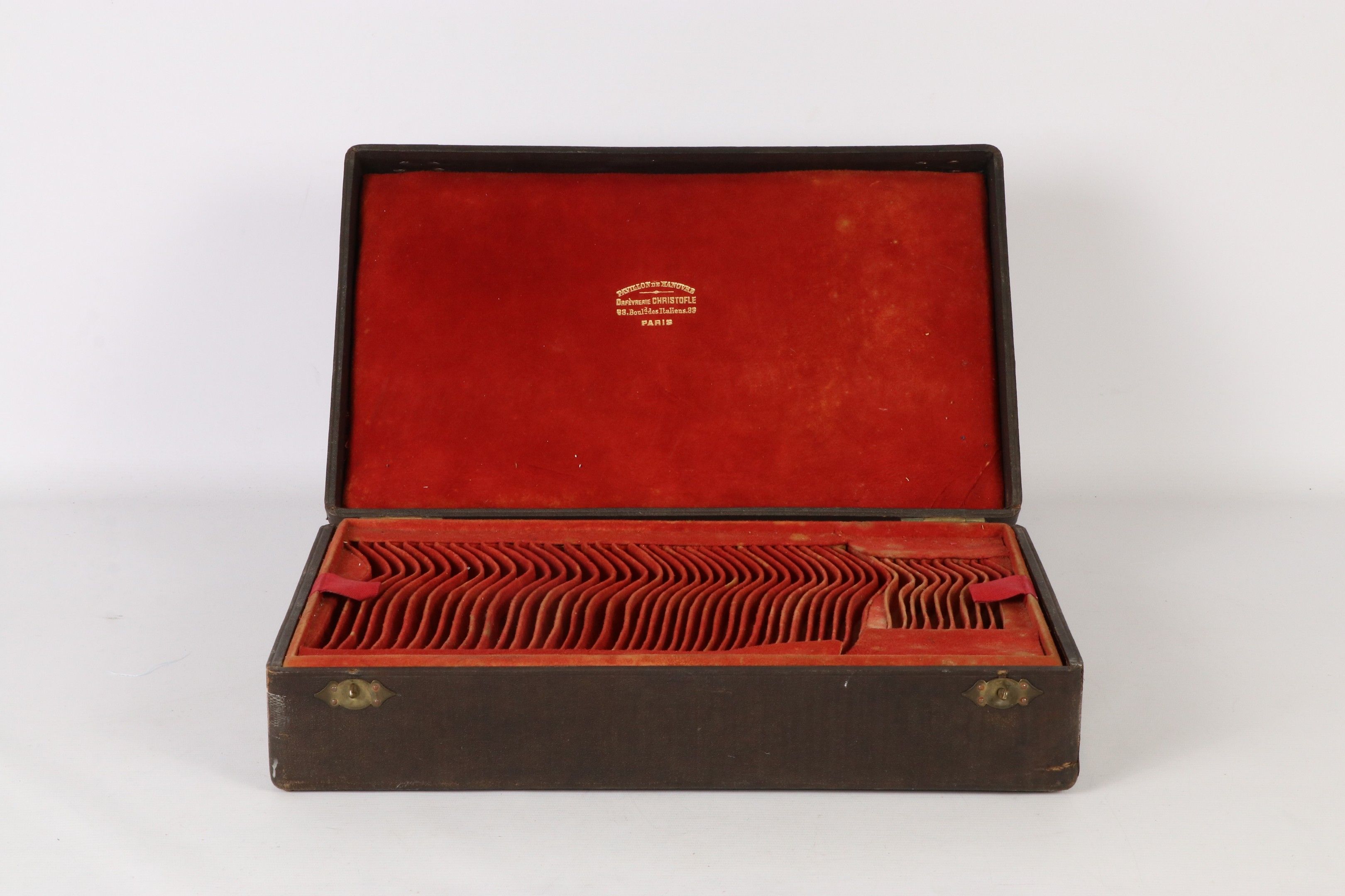 CHRISTOFLE - Antique household set with two trays lined with red suede for 18 place settings, 18 dinner knives, 18 dessert knives and 18 teaspoons. Marked "Pavillon de Hanovre Orfèvrerie Christofle". The lid is engraved TL. 46 x 11 x 28.5 cm (corner restorations, cracks, rubbing and wear).