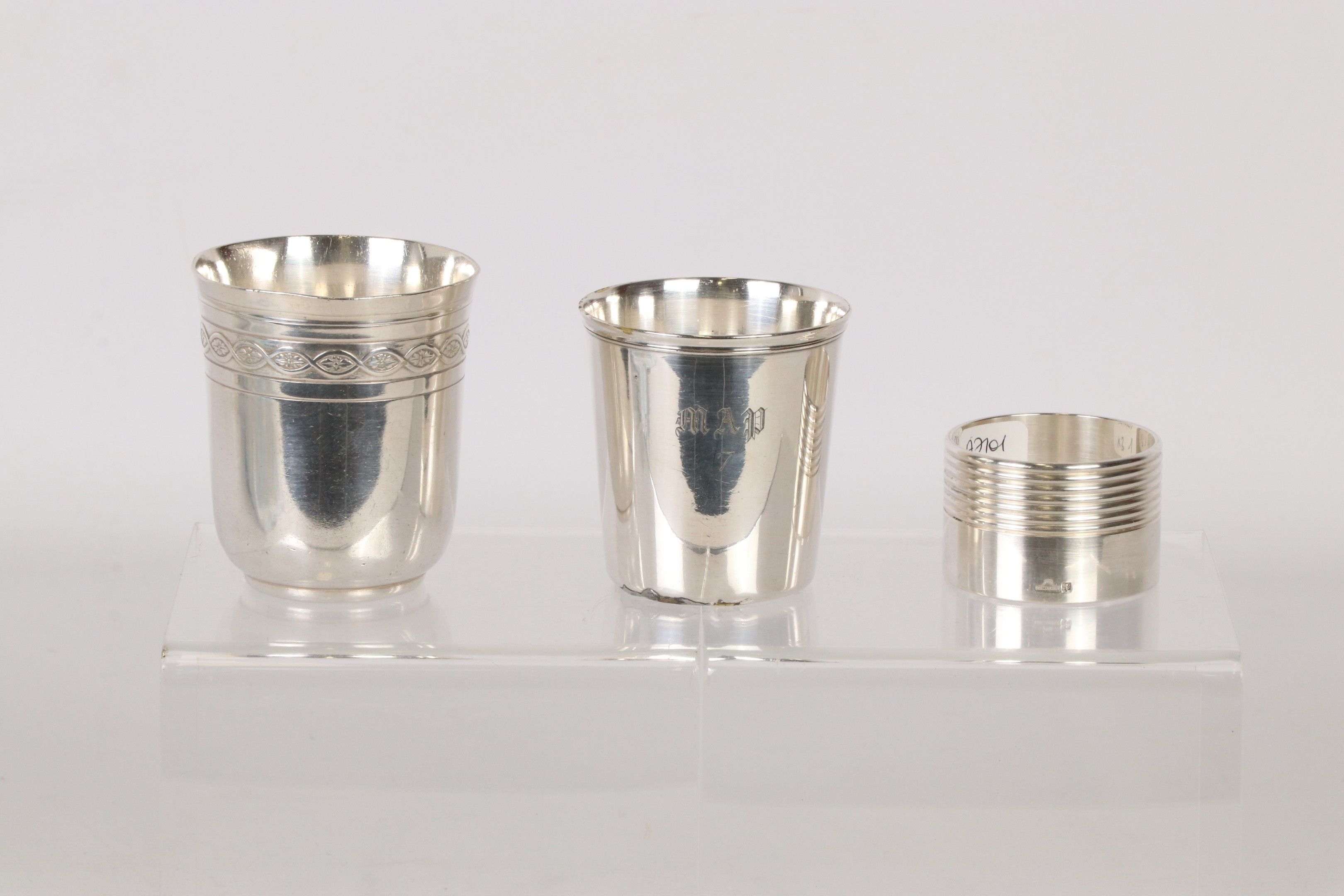 CHRISTOFLE - Two silver-plated kettledrums, one tulip-shaped with a frieze of interlacing and fleurons, the other straight, numbered MAP 7 (small dents to the first, soldering to the second). A silver-plated napkin ring partly moulded with fillets is attached.
