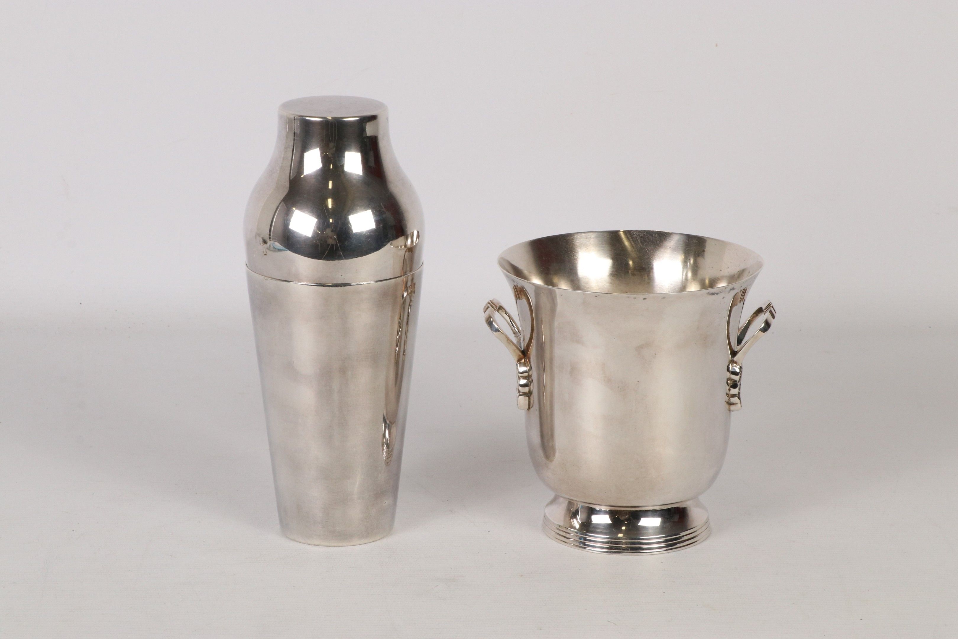 CHRISTOFLE - Shaker in plain silver-plated metal. A SIS L'écuyer silvered metal ice bucket, plain tulip-shaped body, foliate handles, circular pedestal moulded with fillets. H. 15 cm (deformation on the rim).