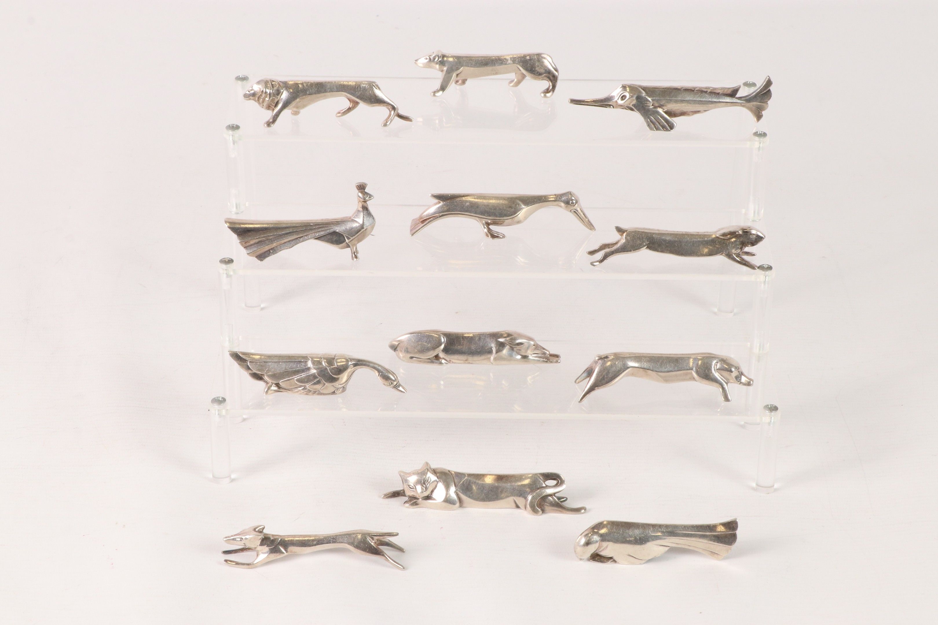 Édouard Marcel SANDOZ (1881-1971) & GALLIA - Suite of 12 zoomorphic silver-plated knife-holders depicting birds, fish or mammals. Art deco period.