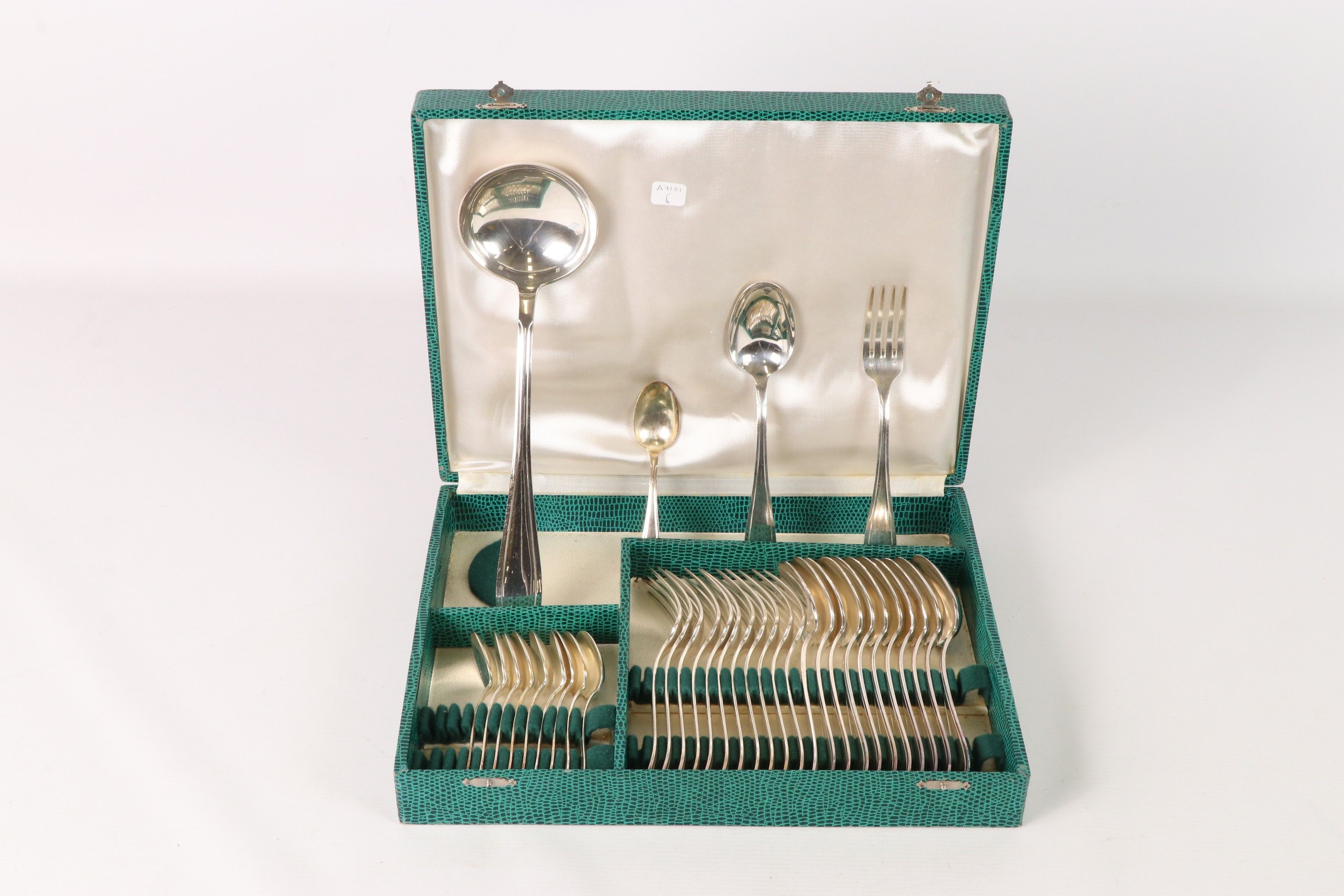 ORBRILLE - Set of silver-plated cutlery, the flared spatula moulded with fillets, comprising: 12 place settings, 10 teaspoons and a ladle. In its box.