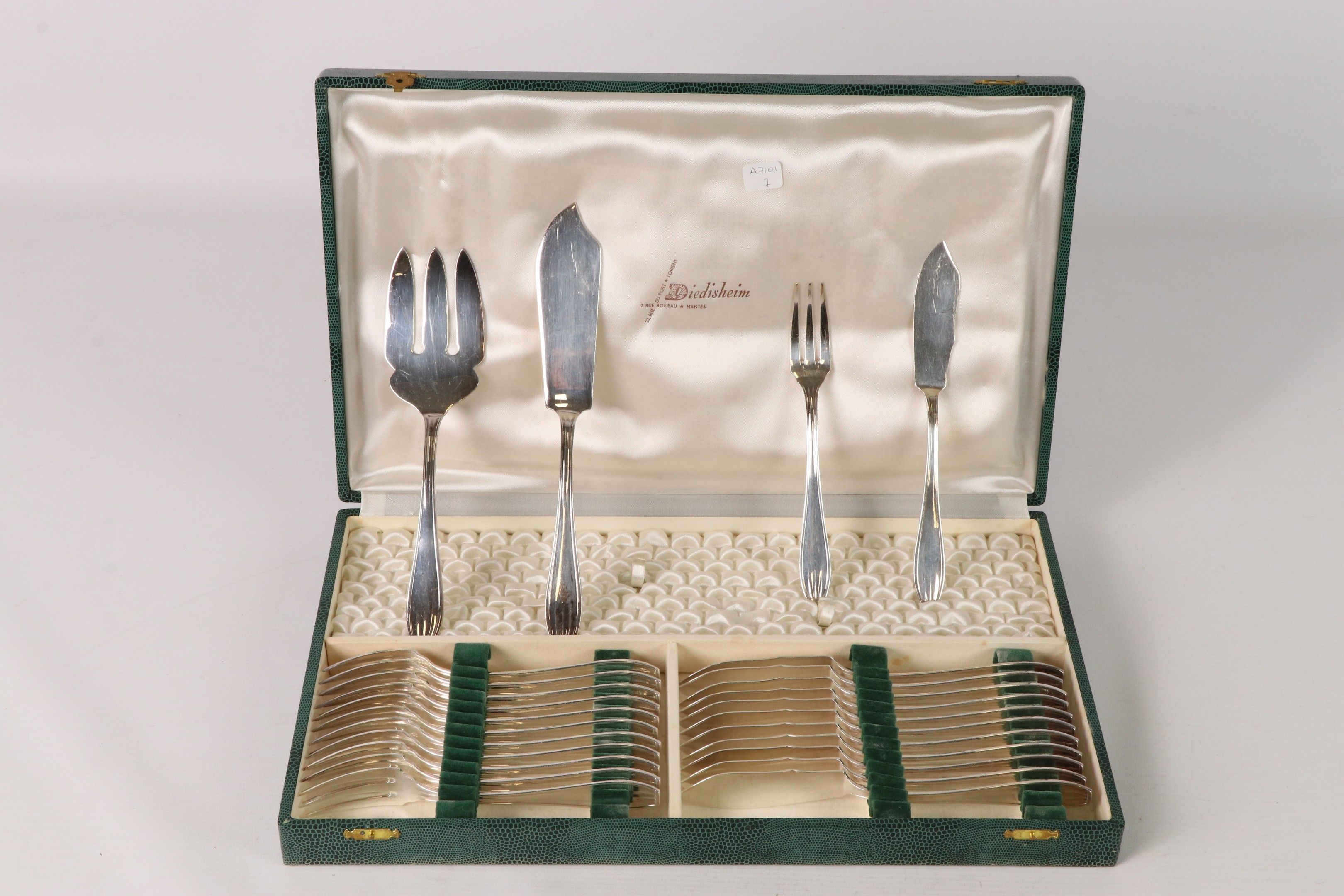 SFAM - Silver-plated fish serving set, spatula in a barrel with an outline, comprising: 12 place settings and a serving piece. In box.