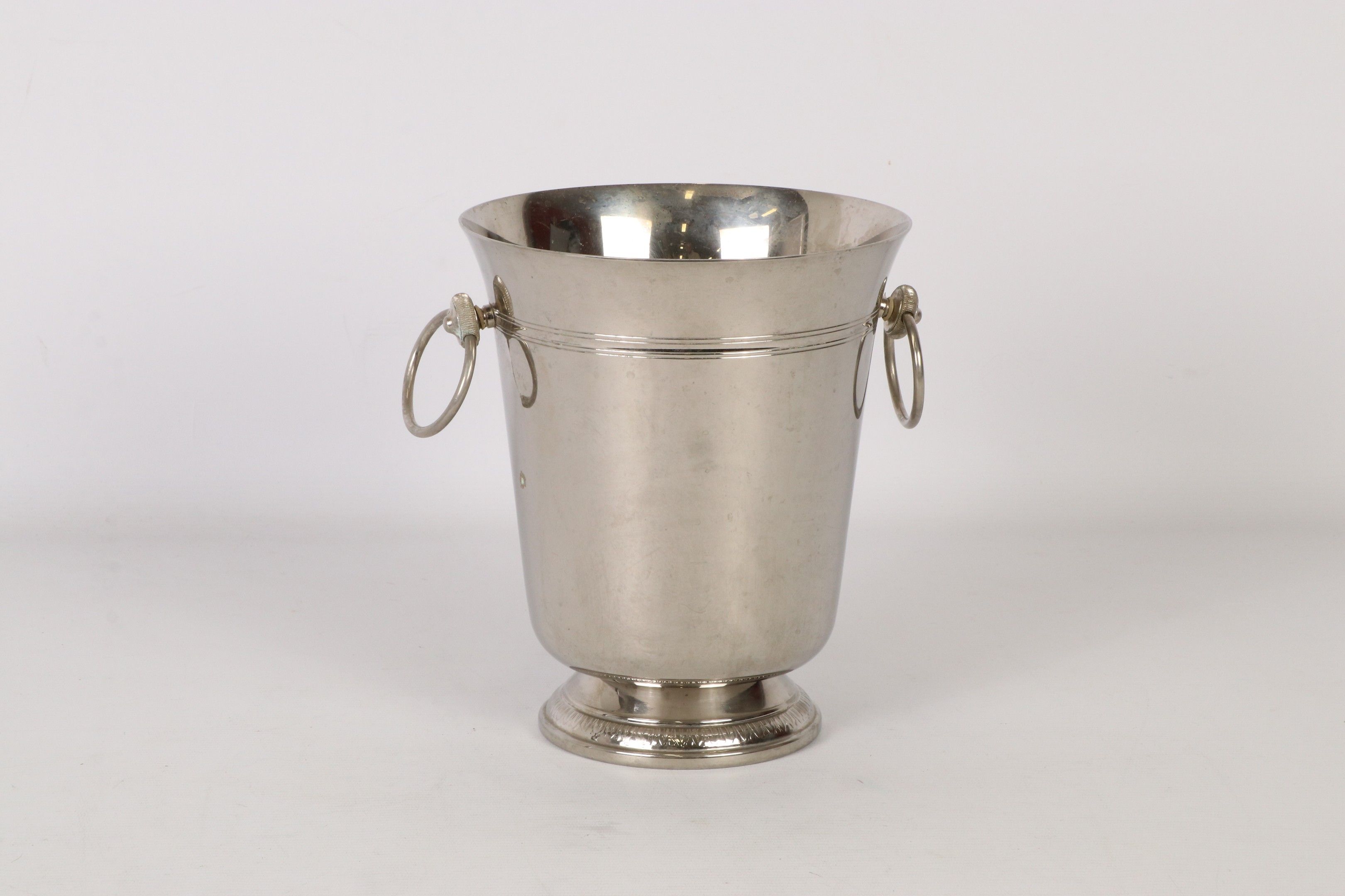 A silver-plated champagne bucket with two ring handles, the neck moulded with fillets, the pedestal chased with palmettes. Height 23 cm.
