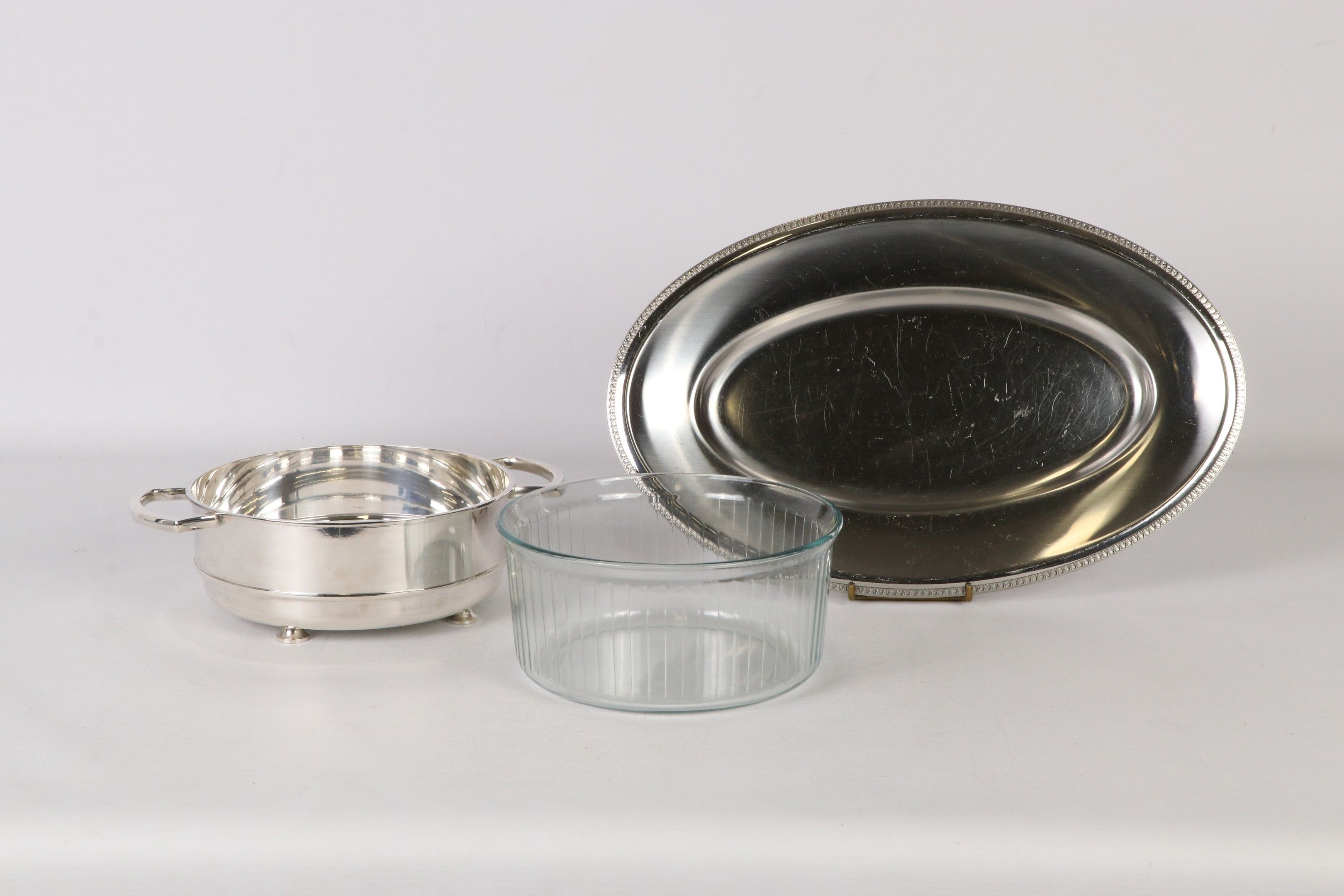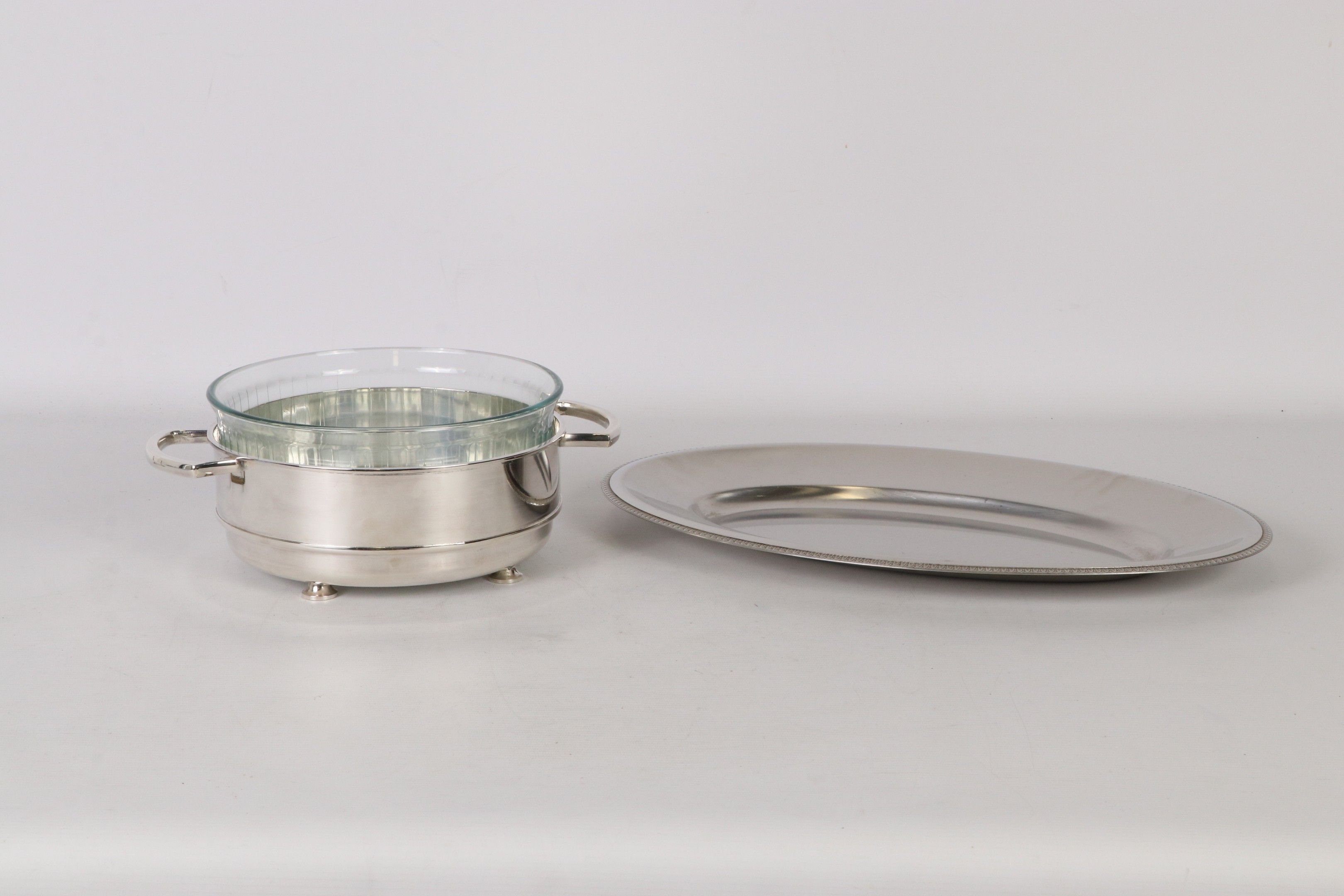 Two silver-plated serving pieces: an oblong dish with a frieze of palmettes and a glass-lined dish with handles.