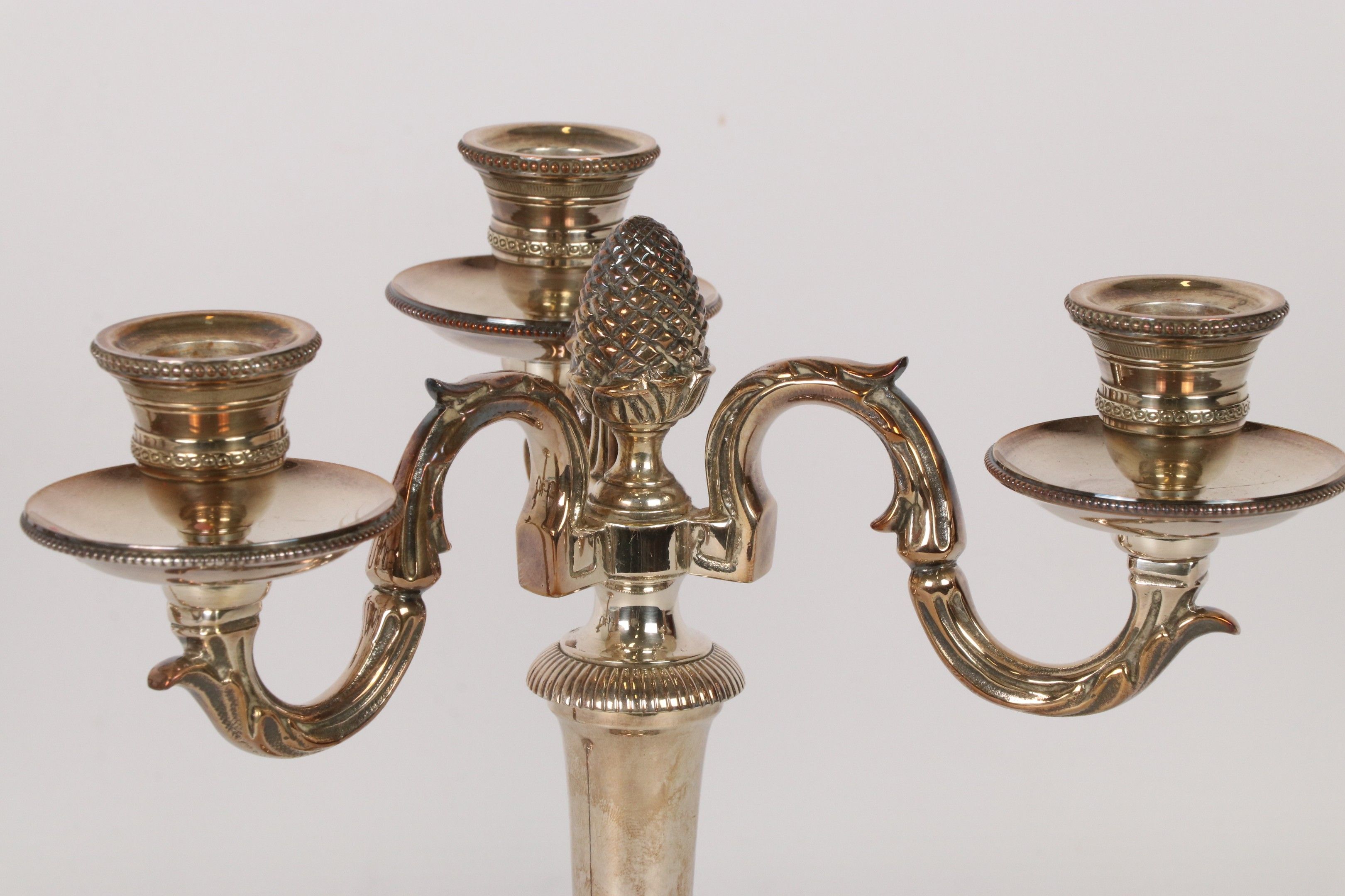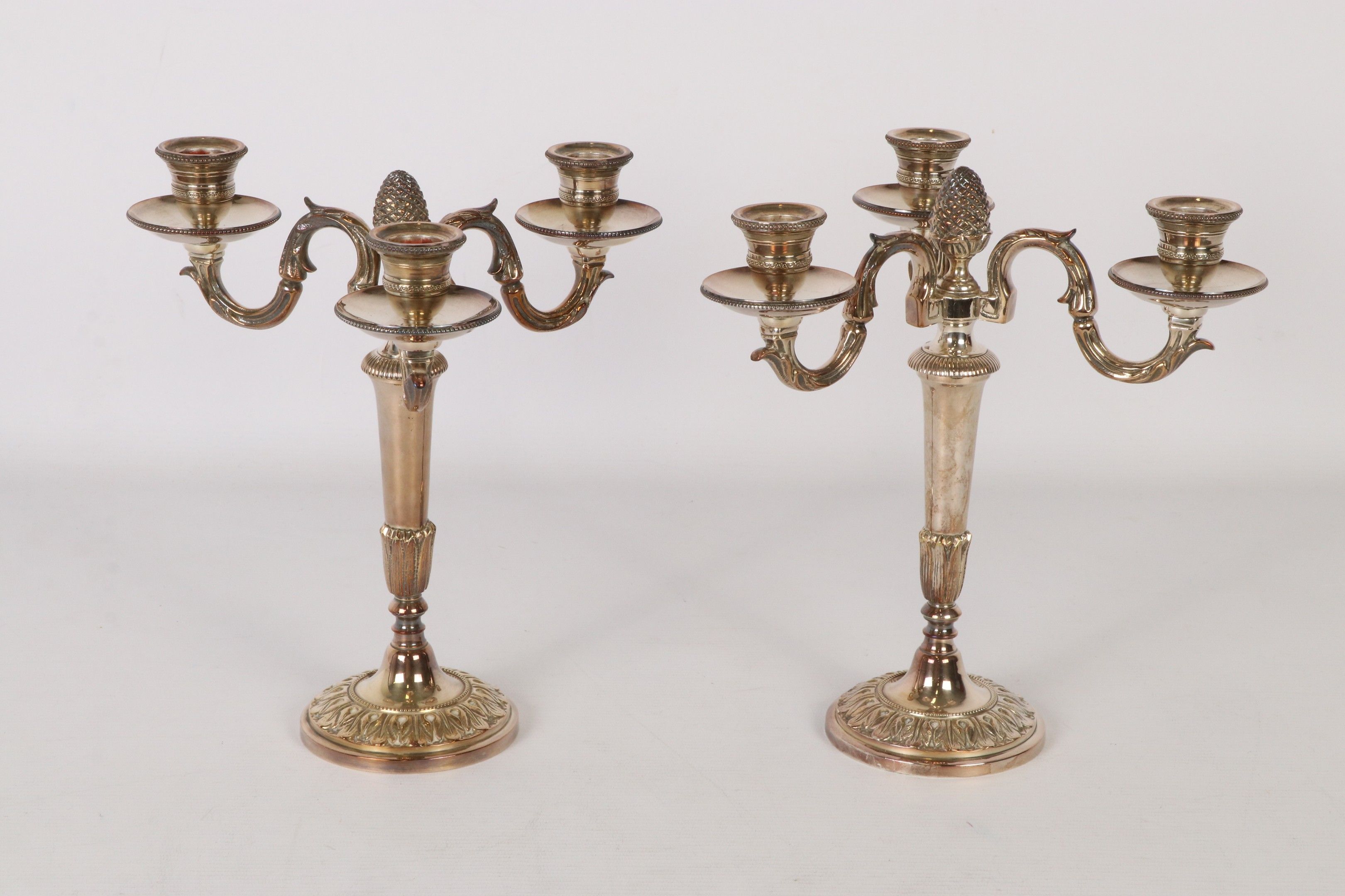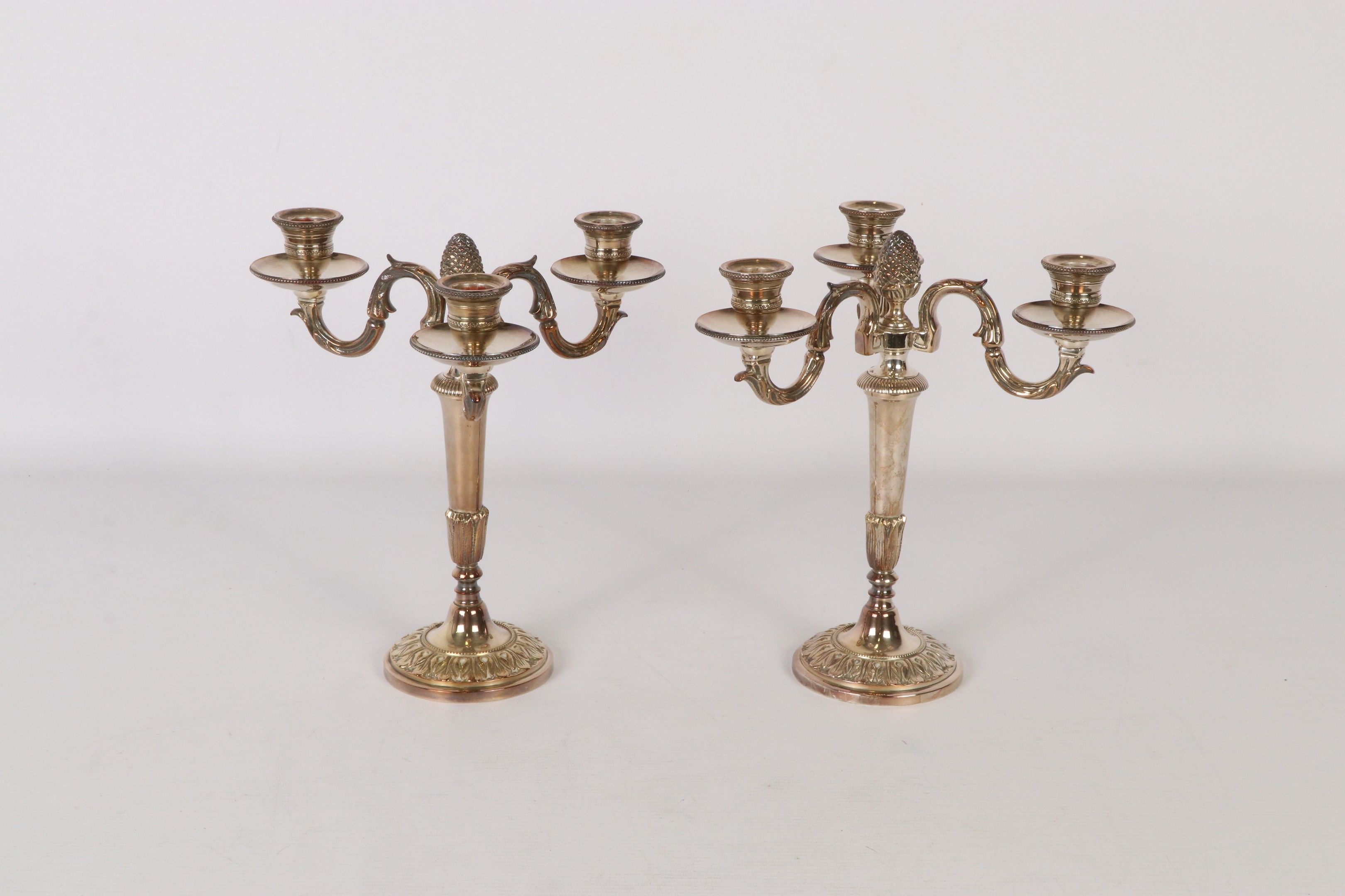 A pair of silver-plated three-light candlesticks in the neoclassical style with a frieze of gadroons and leaves. Height 25.5 cm.