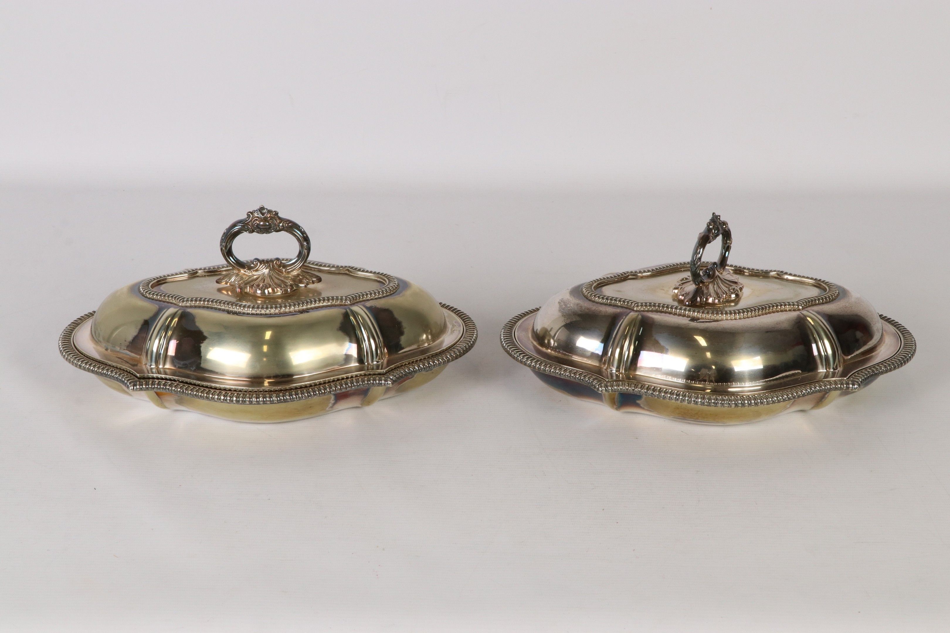 Pair of silver-plated covered serving dishes with gadroon fr…