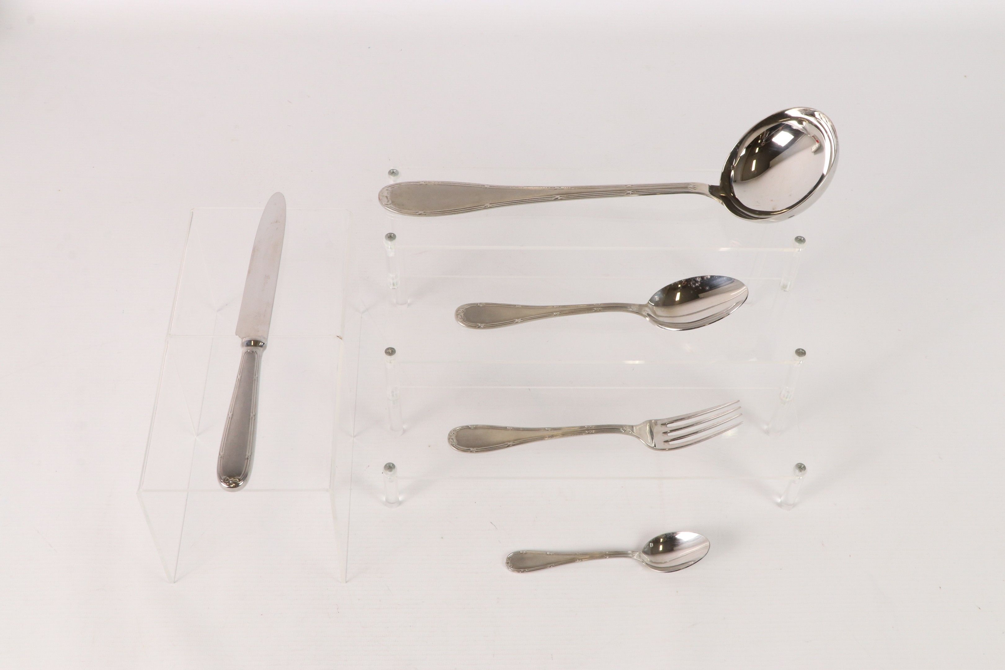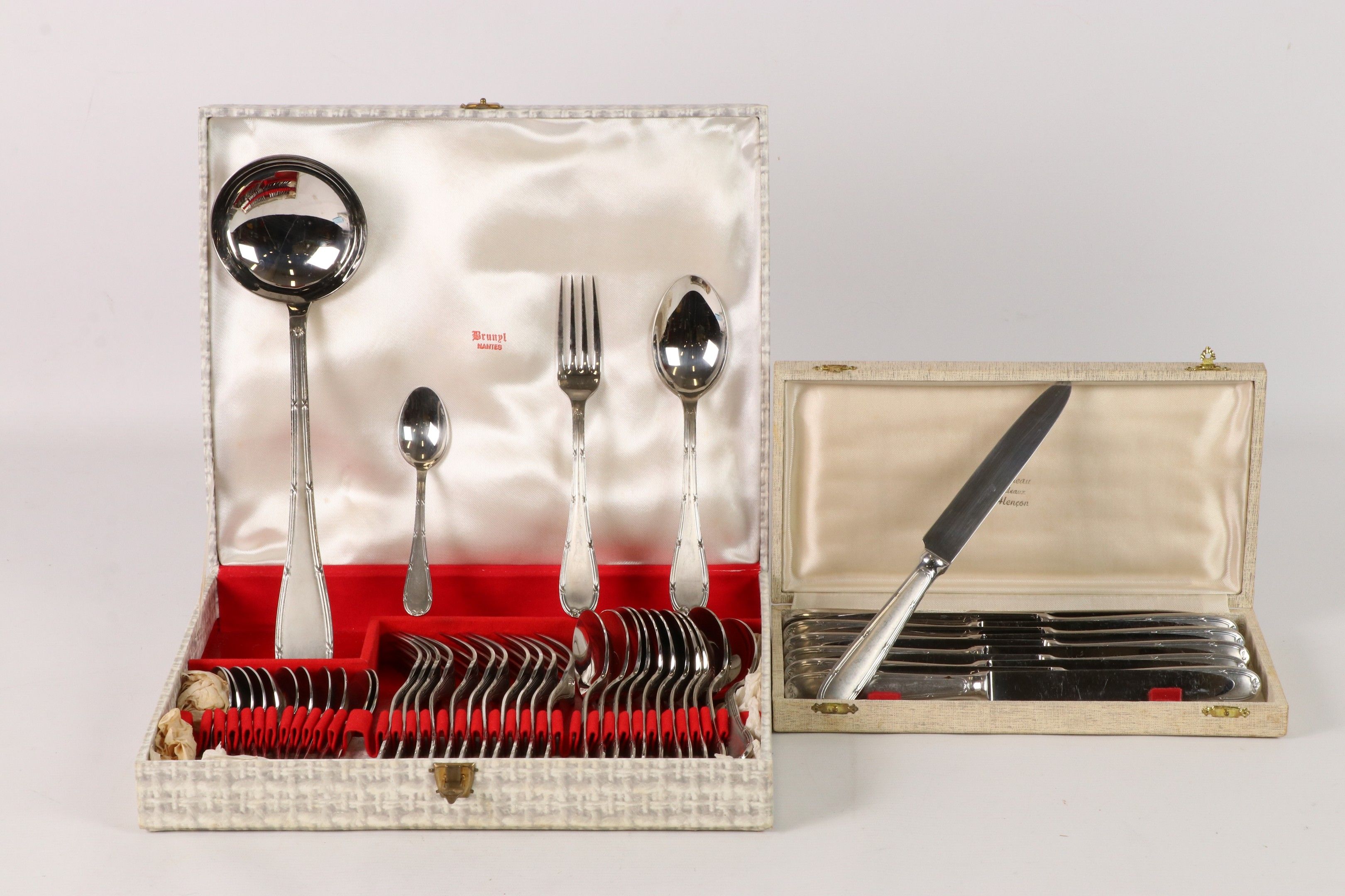 Silver-plated metal cutlery set, the spatula with ribboned filets. Includes: 12 place settings, 12 teaspoons, 12 table knives and a ladle. In two cases.