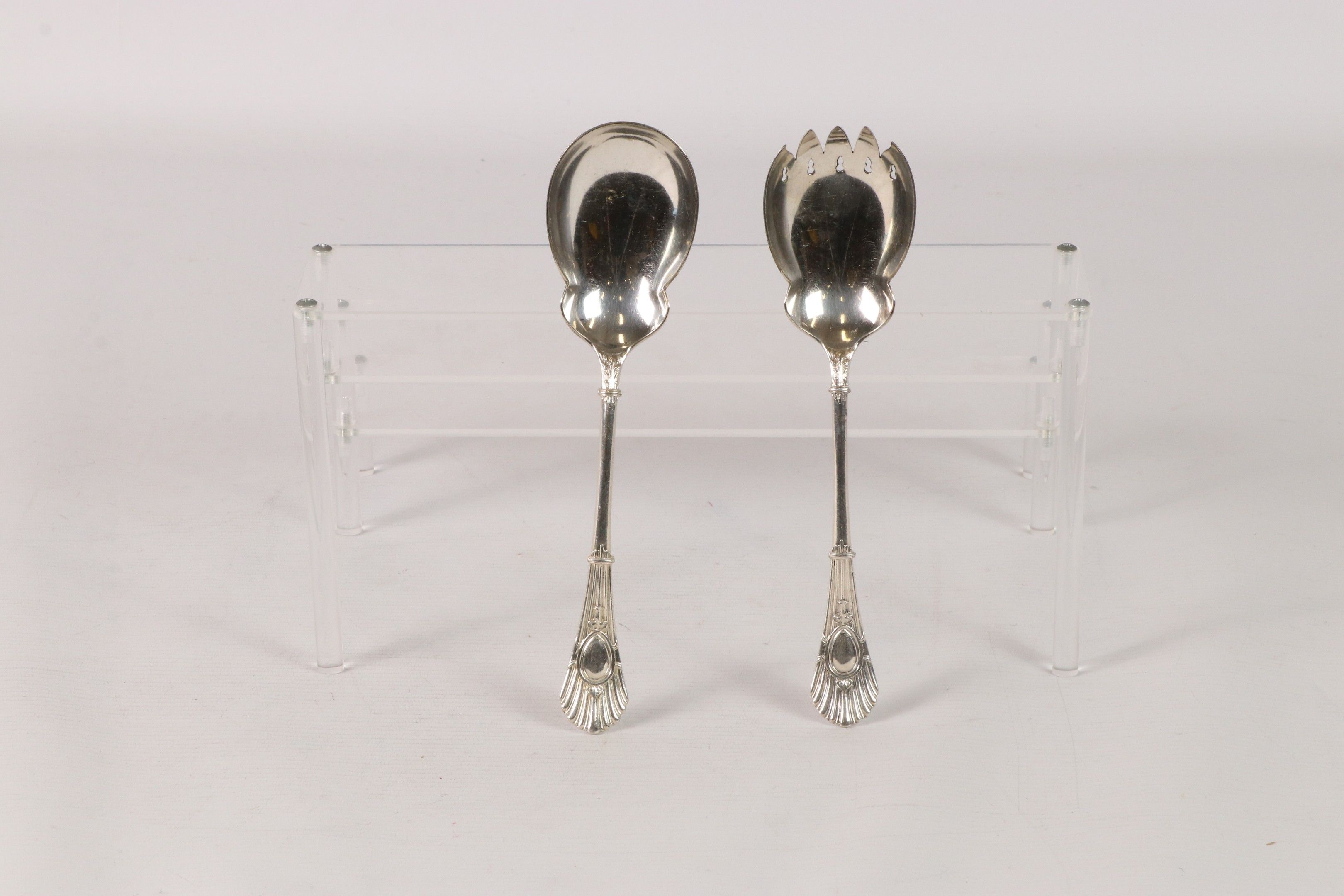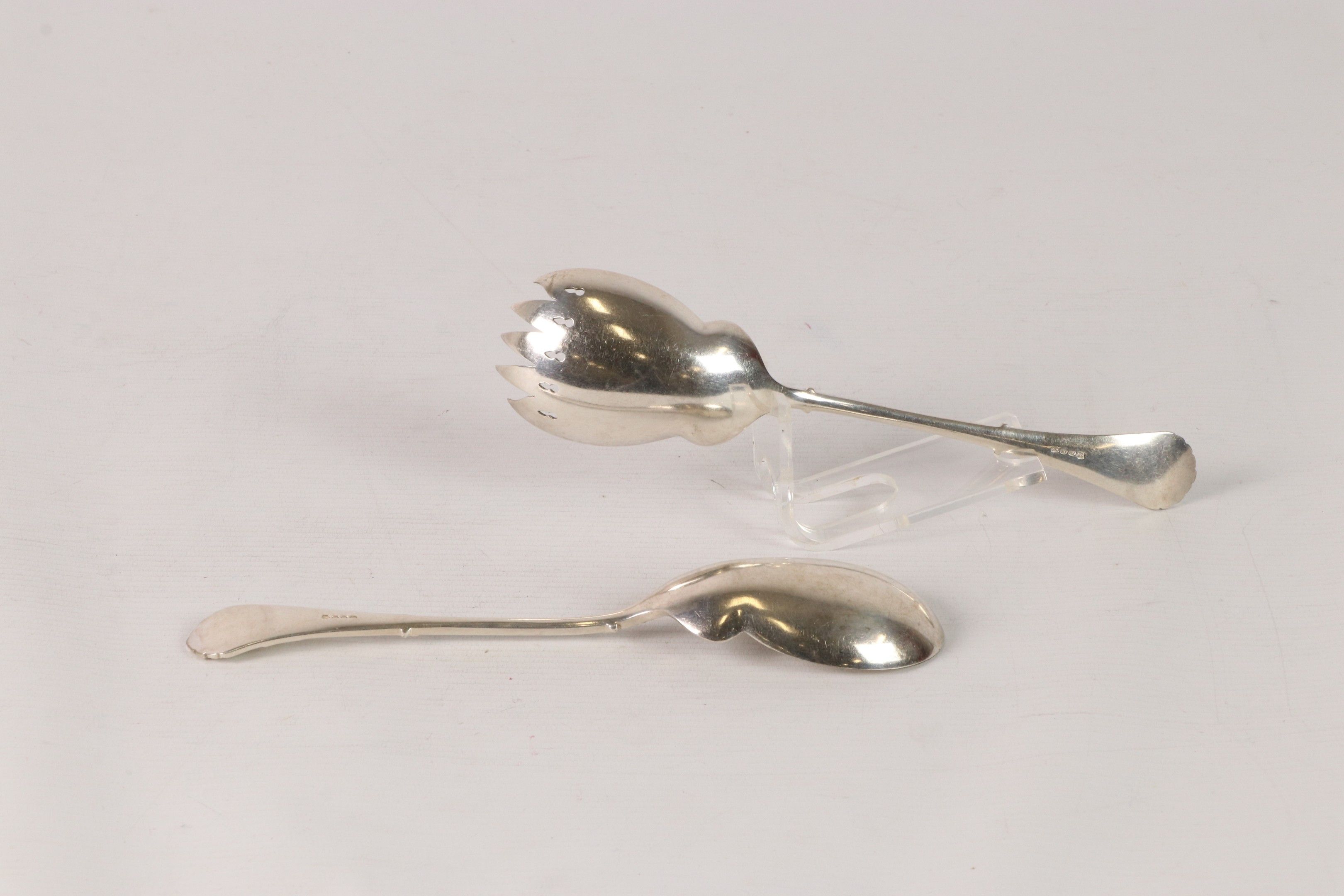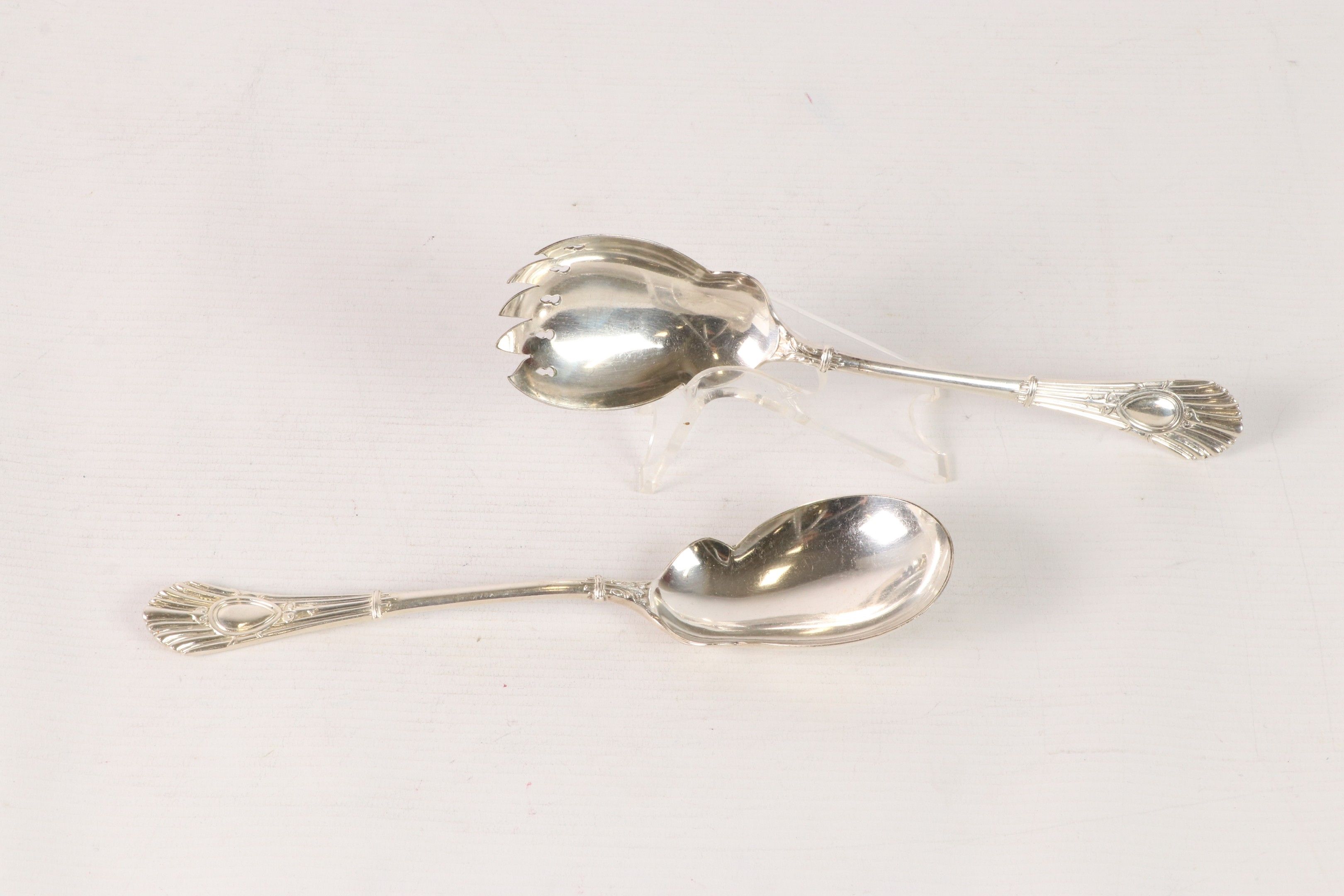 A silver-plated salad server with a flared palmette spatula carved with a medallion. English work.