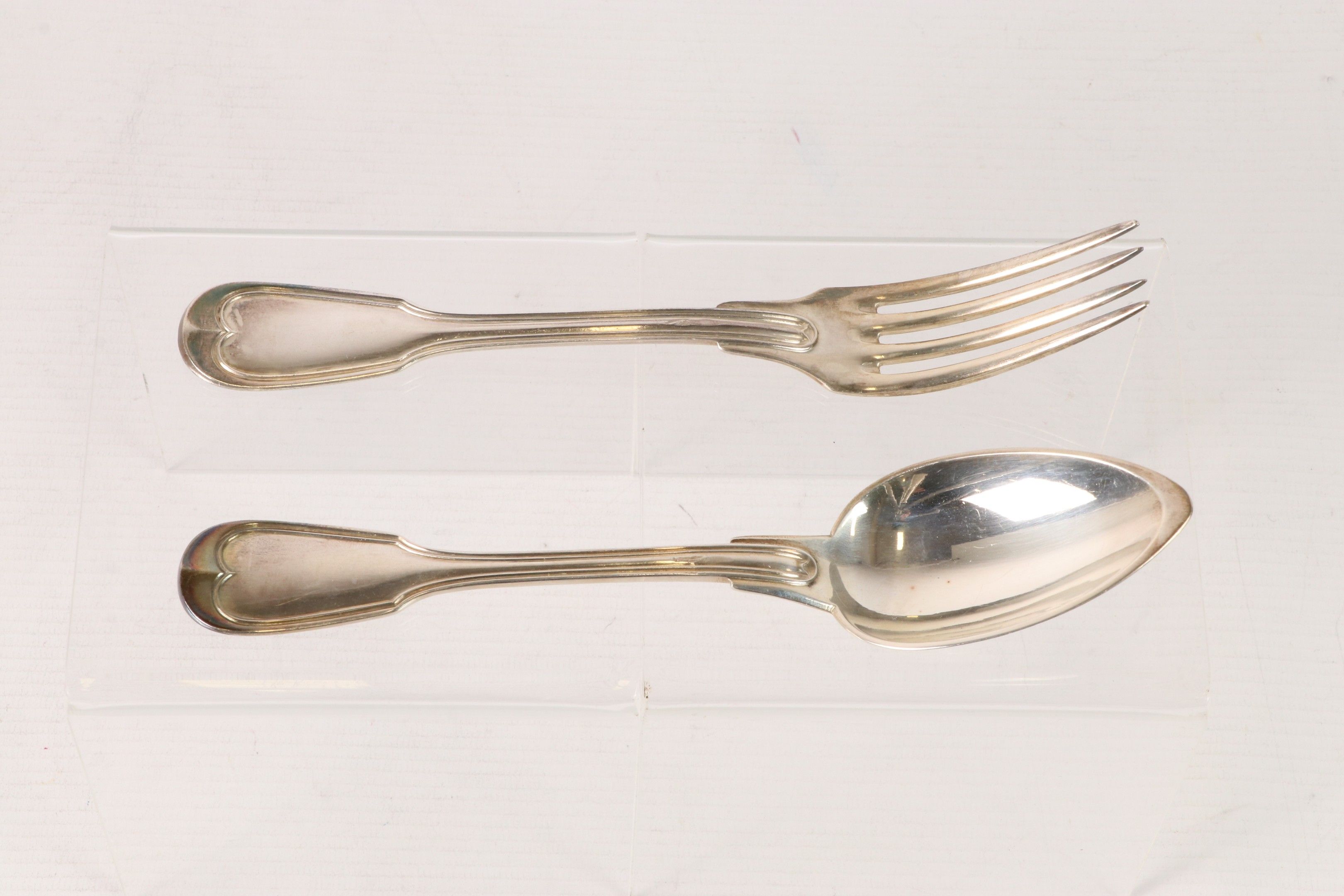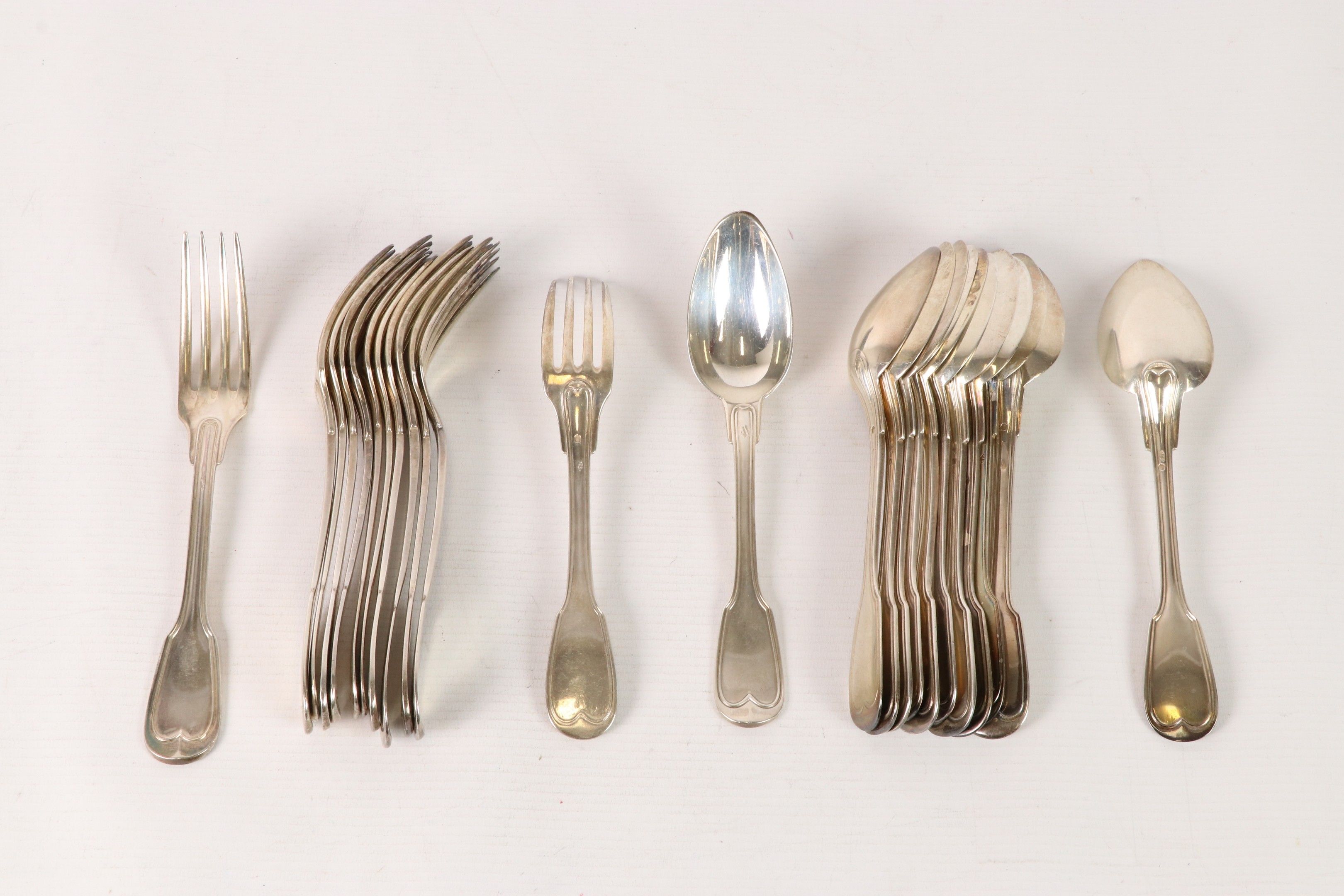 Set of 12 sterling silver flatware. Minerve hallmark. Various silversmiths. Weight : 1965 g.