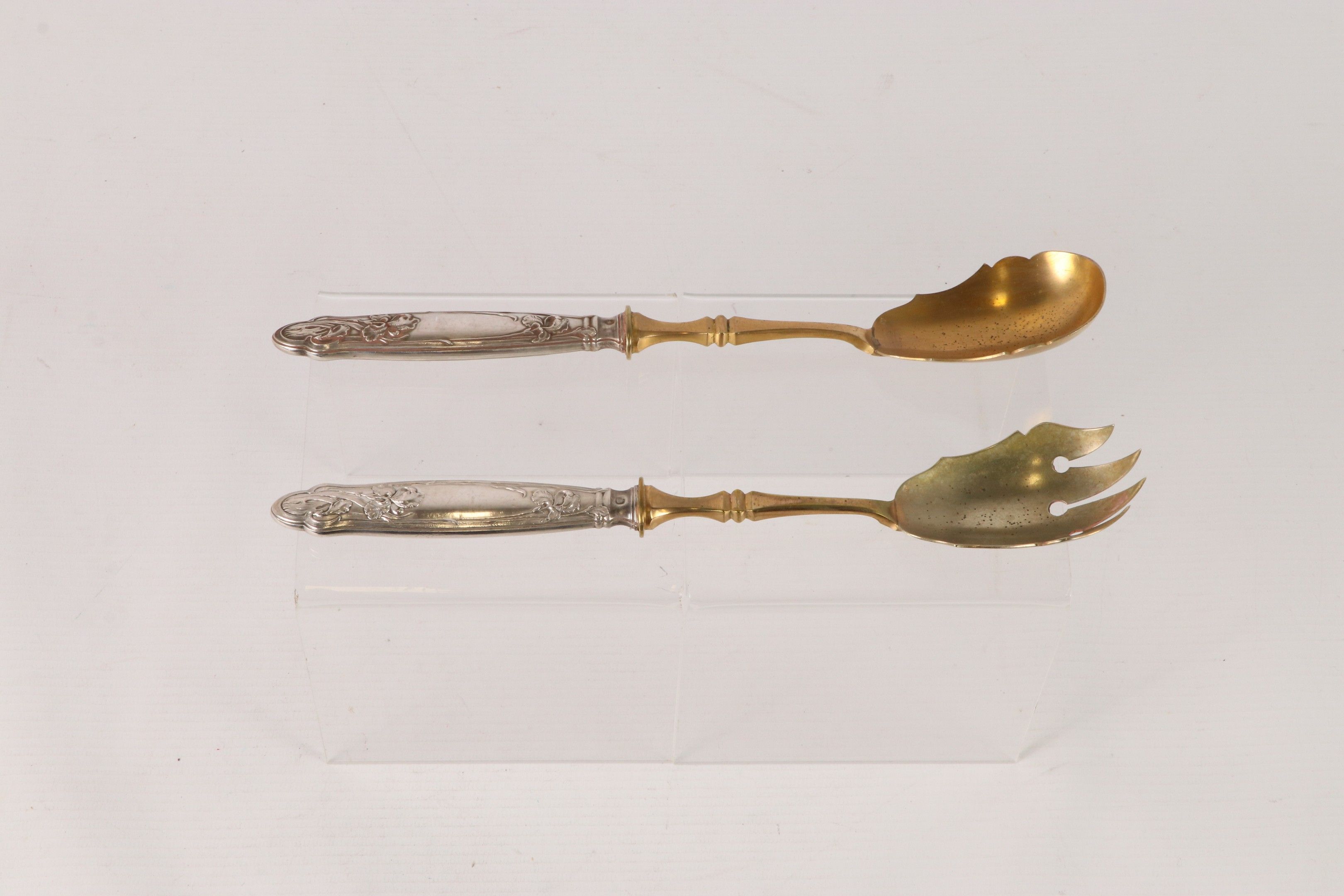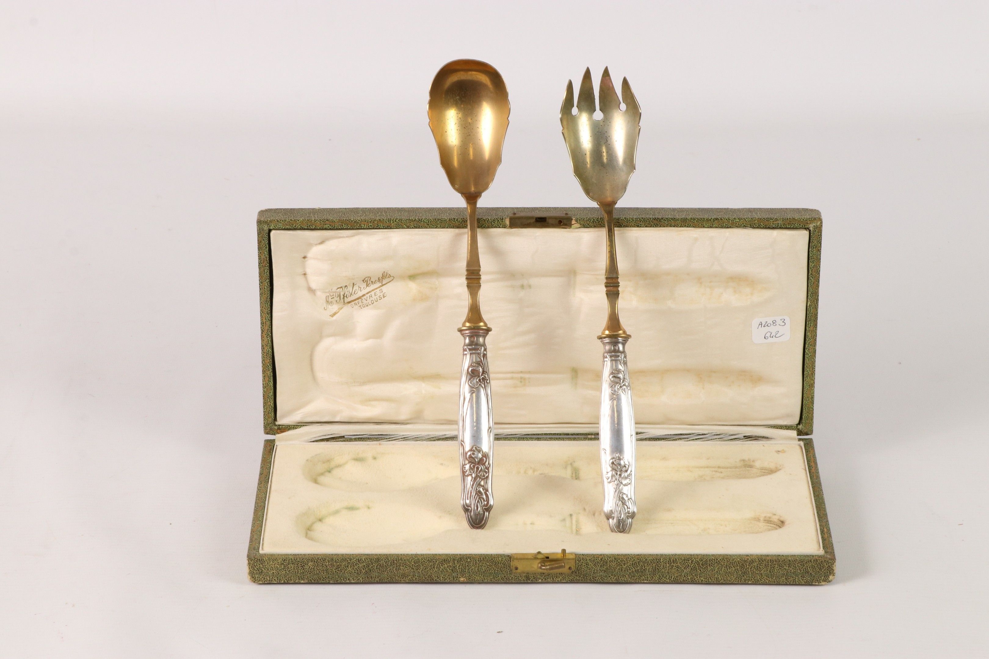 Salad service with silver handles embossed with irises. In a case.