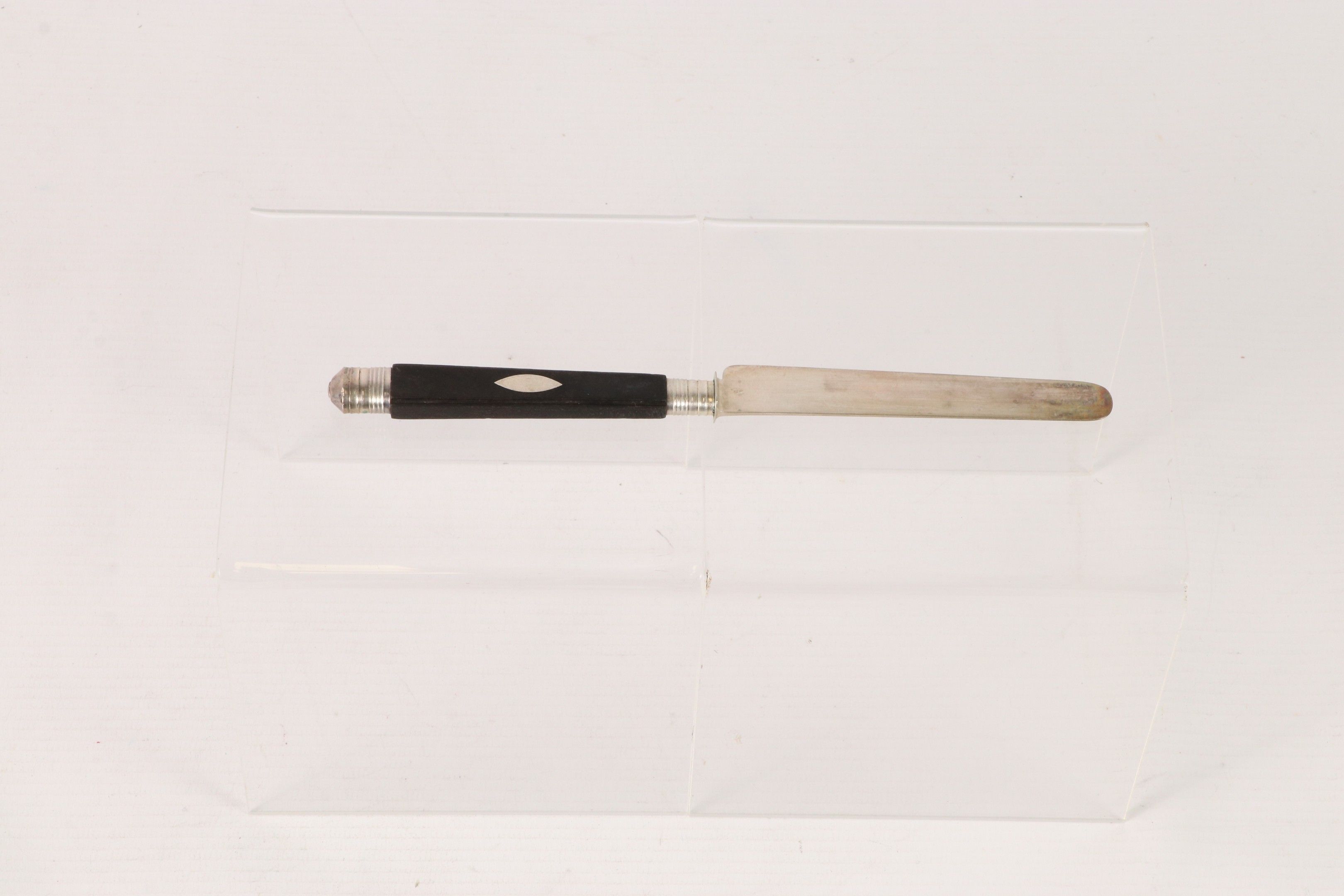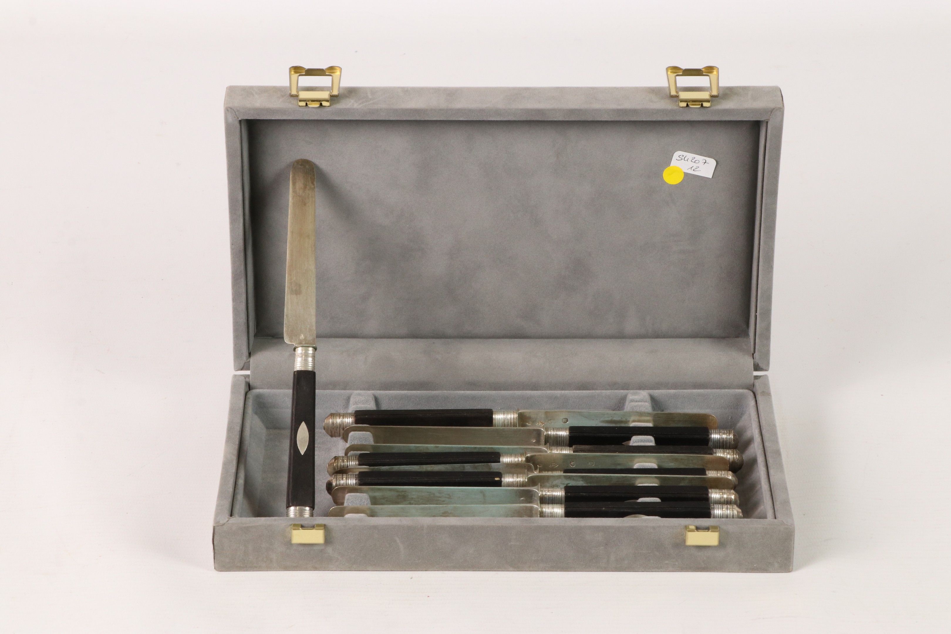 Set of 9 fruit knives, silver blade (800°/00), ebony handle with silver ferrule and base. MO LC unidentified. Province, 2nd title, 1819-1838.