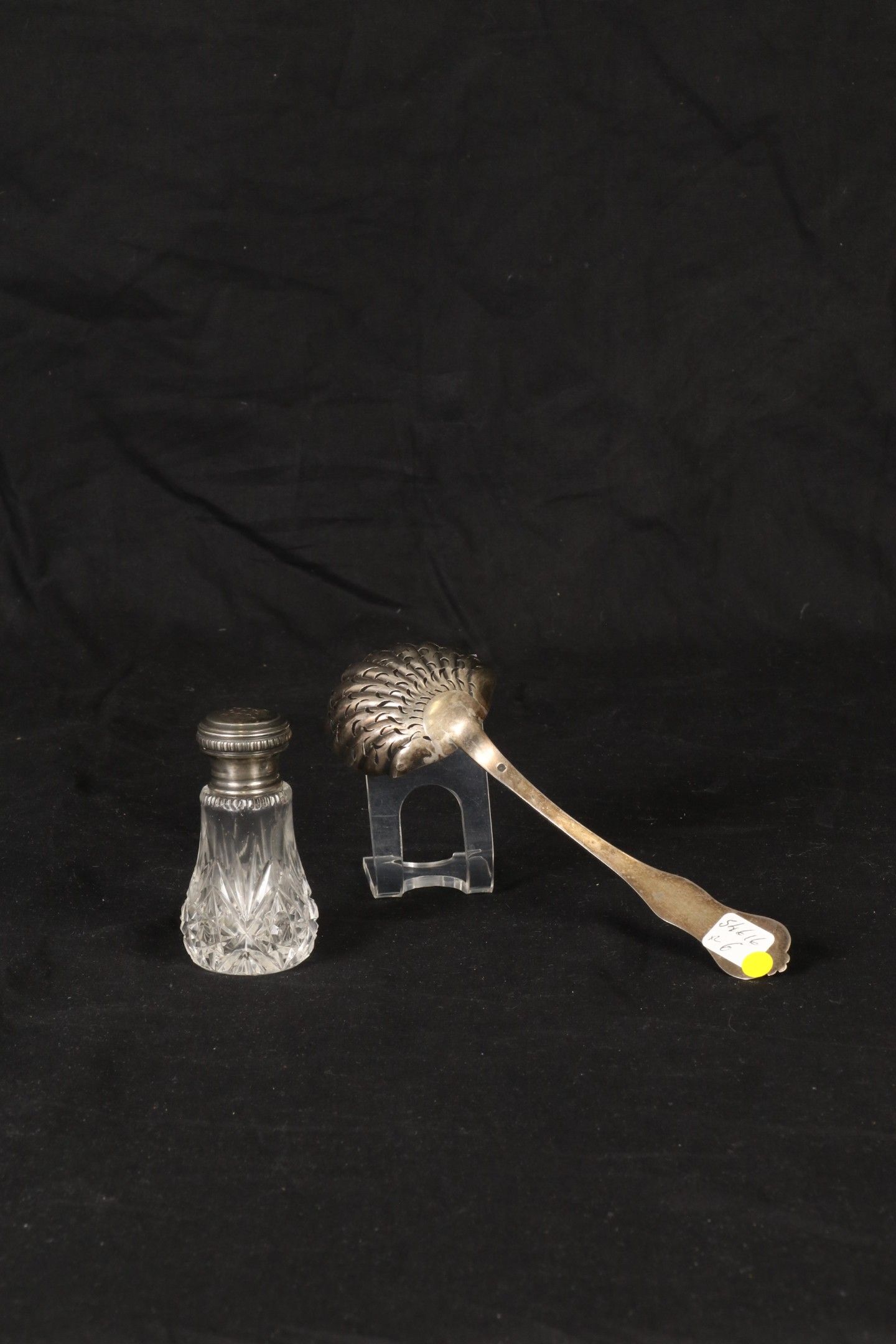 A silver sprinkler spoon, the spoon shell openwork, the sprig and the violin spatula chased in tremolo with flowers in cartouches and fillets. Marked Minerve. Weight: 36.09 g. (slight dents). A moulded crystal saleron with silver stopper. Marked Minerve.