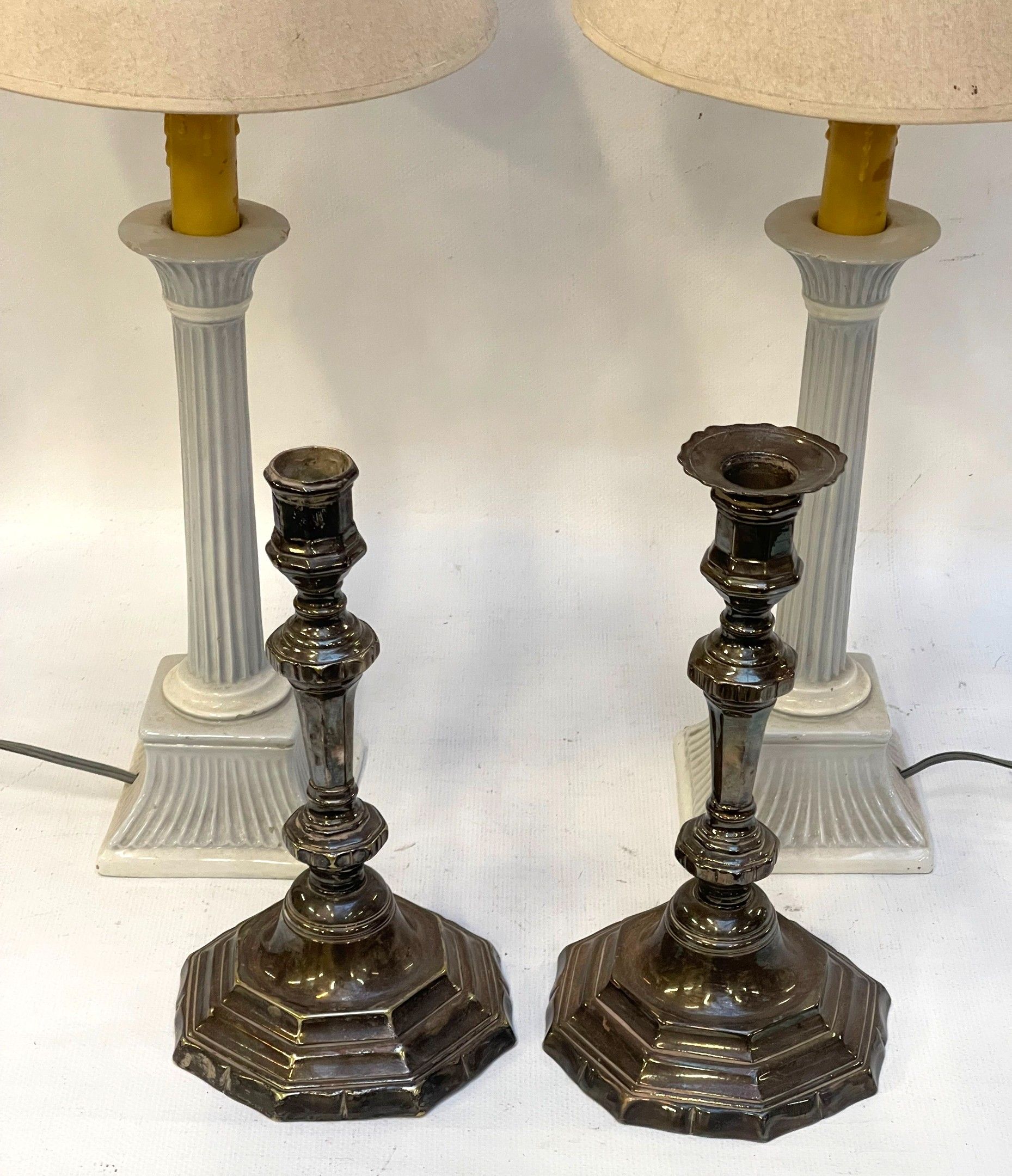 A pair of silver-plated candlesticks and a pair of lamps from a set after the departure of Madame DE X...