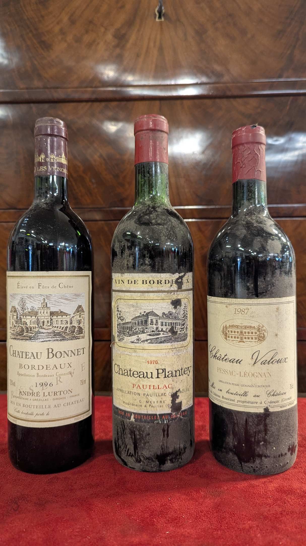 3 Bottles including 1 château BONNET ANDRÉ LURTON 1996 BORDEAUX + 1 château PLANTEY 1970 PAUILLAC + 1 château VALOUX 1987 PESSAC-LÉOGNAN