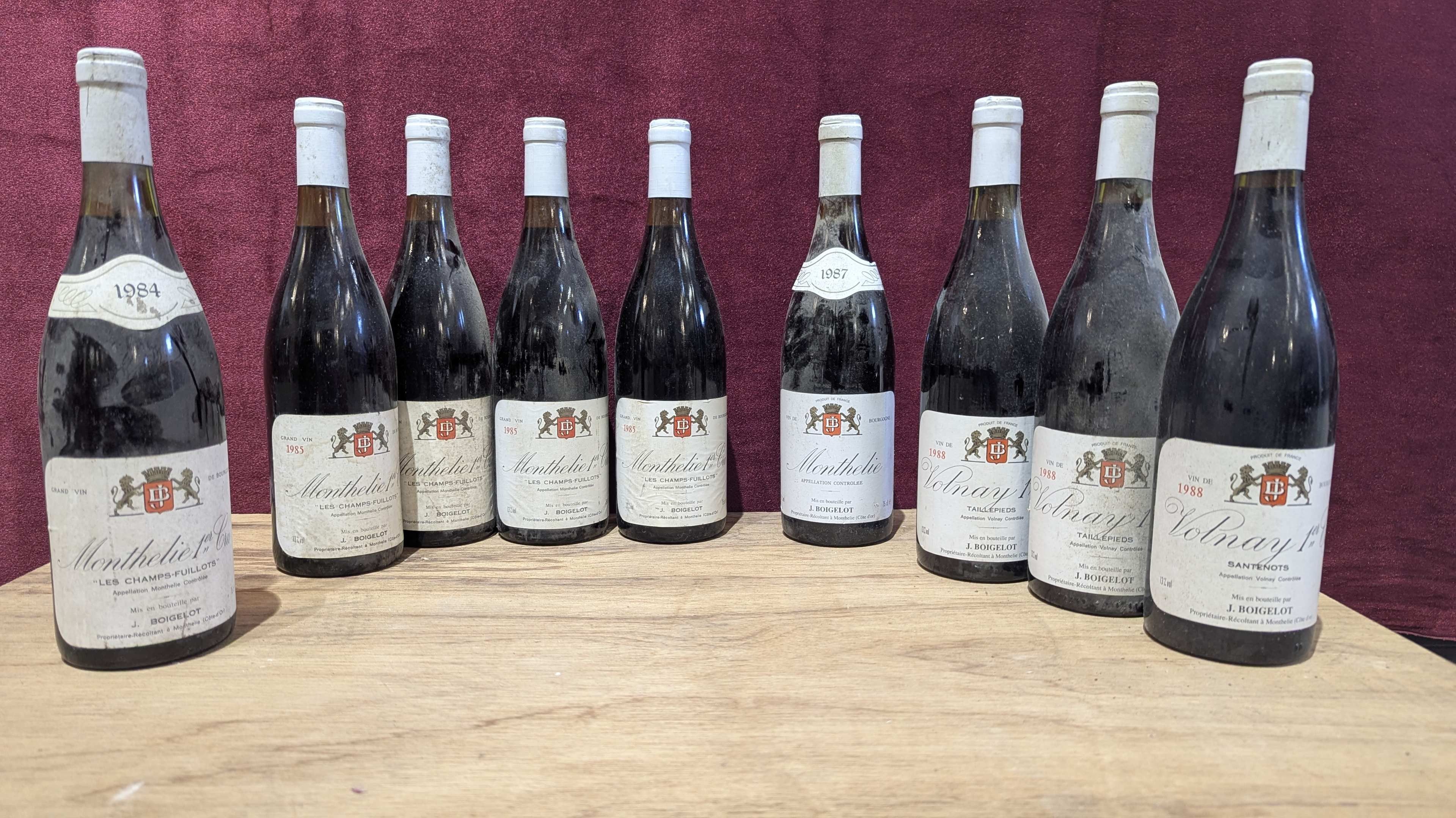 9 Bottles including 1 bottle 1984 & 4 bottles 1985 MONTHELIE 1er CRU "LES CHAMPS-FUILLOTS" + 1 bottle MONTHELIE 1987 & 2 bottles MONTHELIE "TAILLEPIEDS" 1988 + 1 bottle MONTHELIE "SANTENOTS 1988 - GRAND VIN DE BOURGOGNE