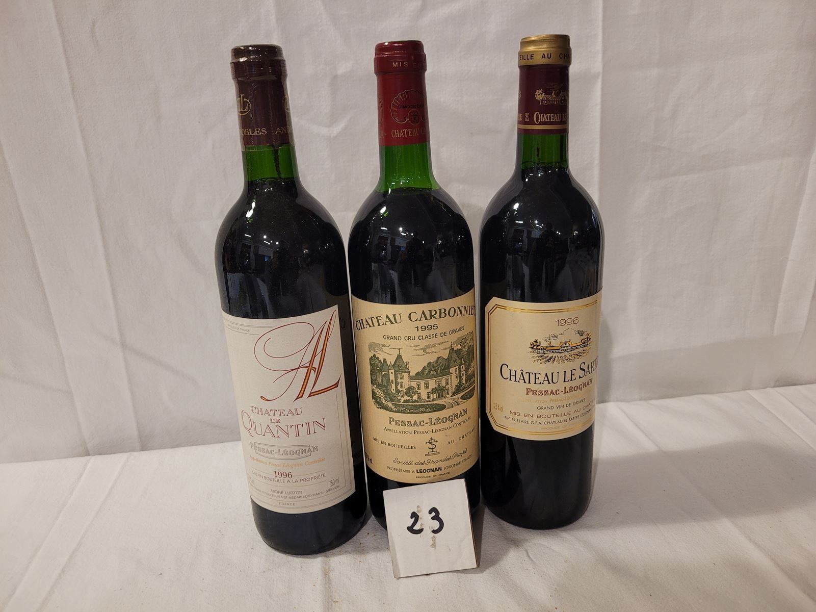 3 bottles including 1 bottle CHÂTEAU CARBONNIEUX PESSAC LEOGNAN ROUGE 1995 and 1 bottle CHÂTEAU LE SARTRE PESSAC LEOGNAN ROUGE 1996 and 1 bottle CHÂTEAU DE QUANTIN PESSAC LEOGNAN ROUGE 1996