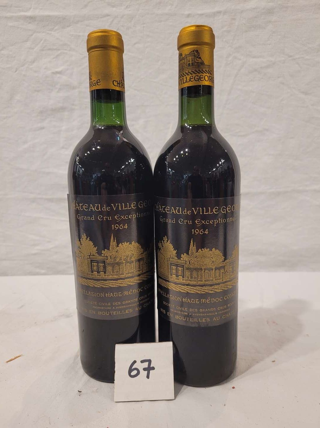 2 bottles CHÂTEAU VILLEGEORGES 1964 HAUT MEDOC. Beautiful labels and low neck levels.