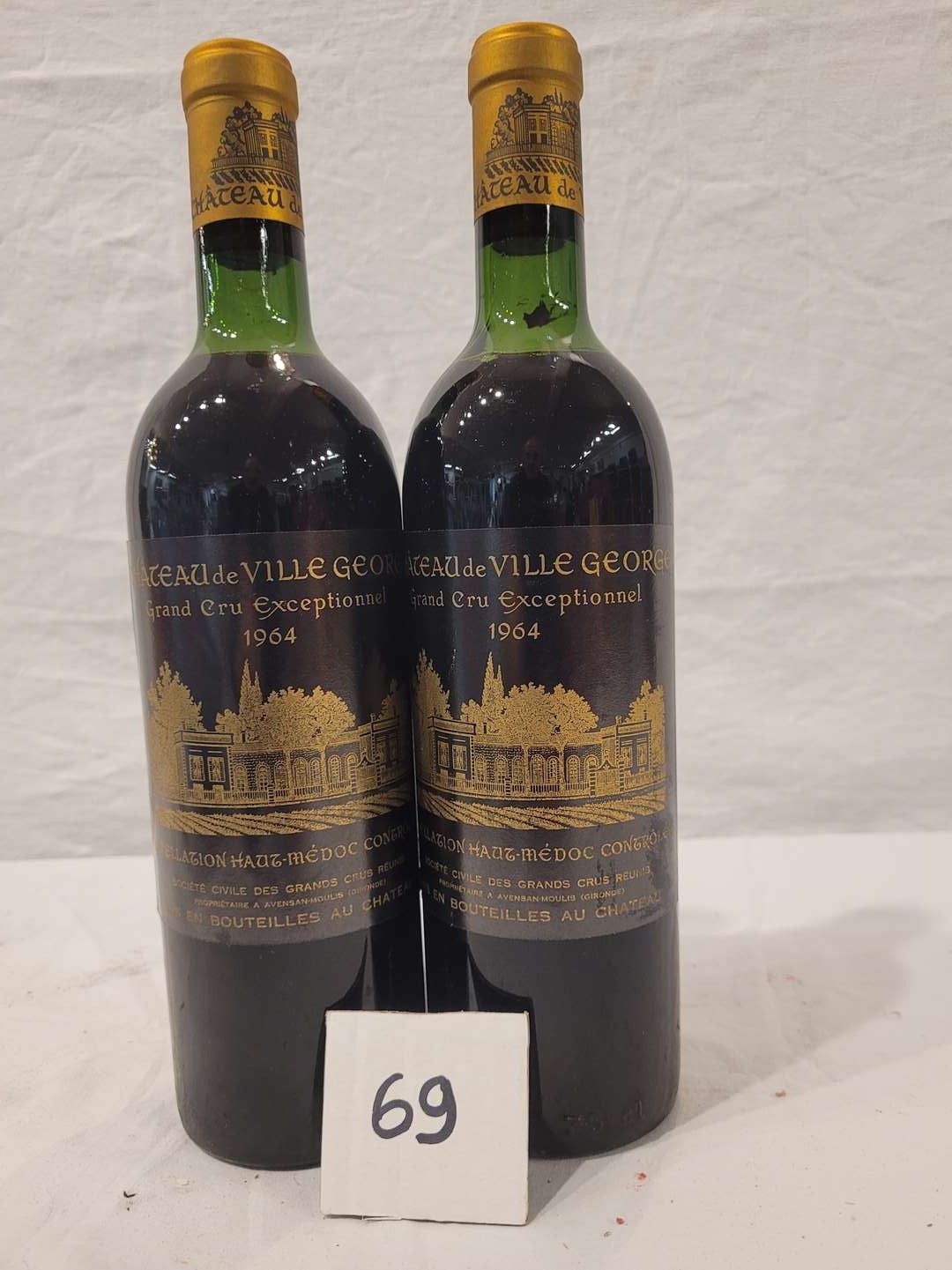 2 bottles CHÂTEAU VILLEGEORGES 1964 HAUT MEDOC. Beautiful labels and high shoulder levels.