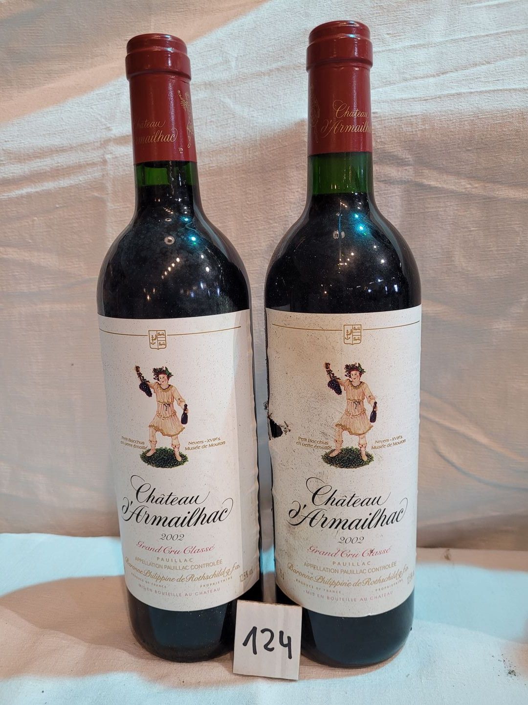 2 bottles château D'ARMAILLAC 2002 GCC PAUILLAC. 1 label torn.