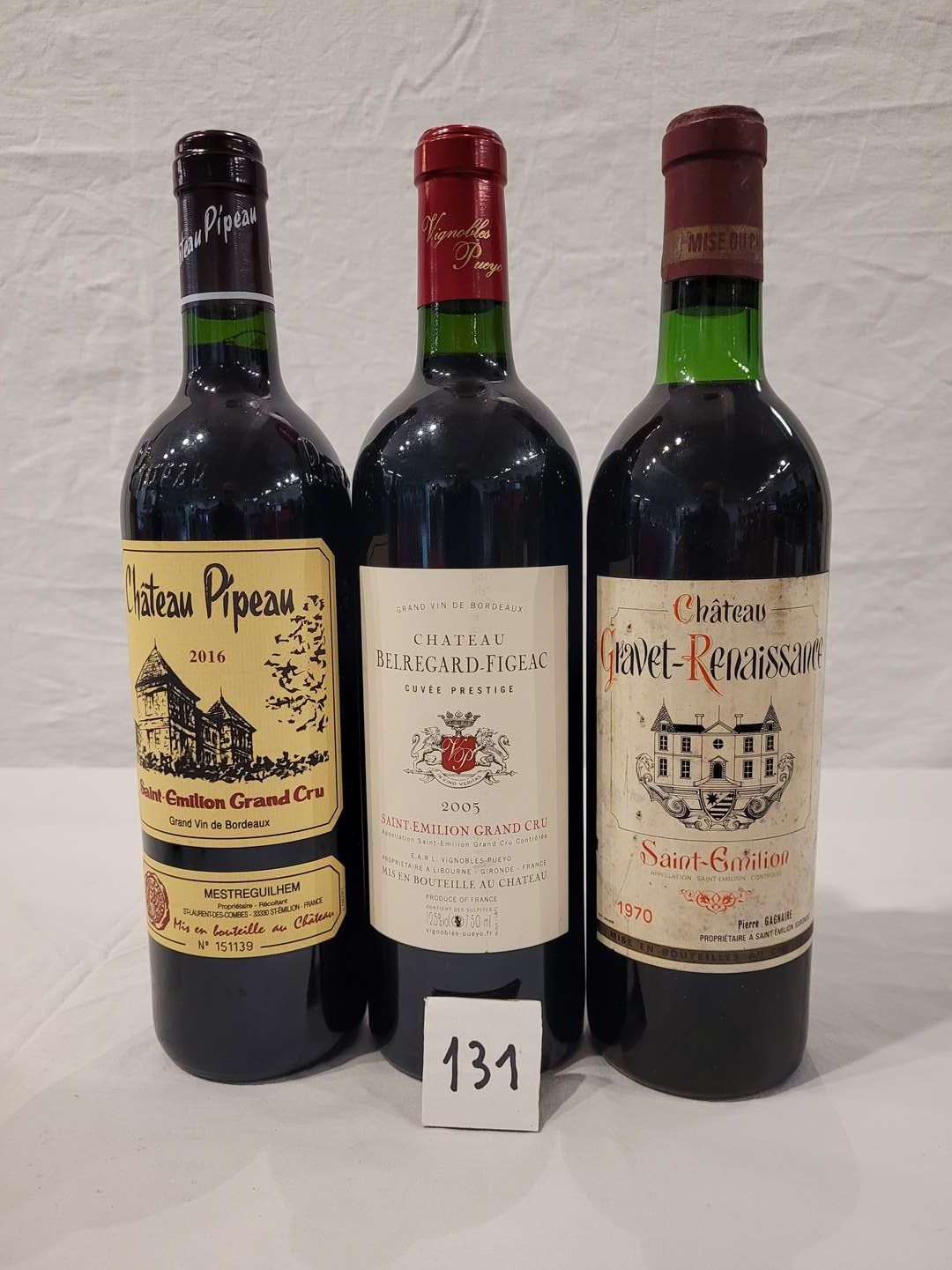 Lot of 3 bottles including 1 bottle CHÂTEAU PIPEAU 2016 SAINT EMILION GC, 1 bottle CHÂTEAU BELREGARD-FIGEAC 2005 SAINT EMILION GC and 1 bottle CHÂTEAU GRAVET-RENAISSANCE 1970 SAINT EMILION, low neck level.