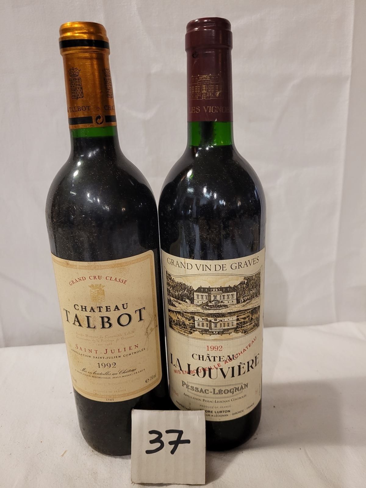2 bottles including 1 bottle CHÂTEAU TALBOT 1992 GCC SAINT JULIEN and 1 bottle CHÂTEAU LA LOUVIERE 1992 PESSAC LEOGNAN. Good presentation.