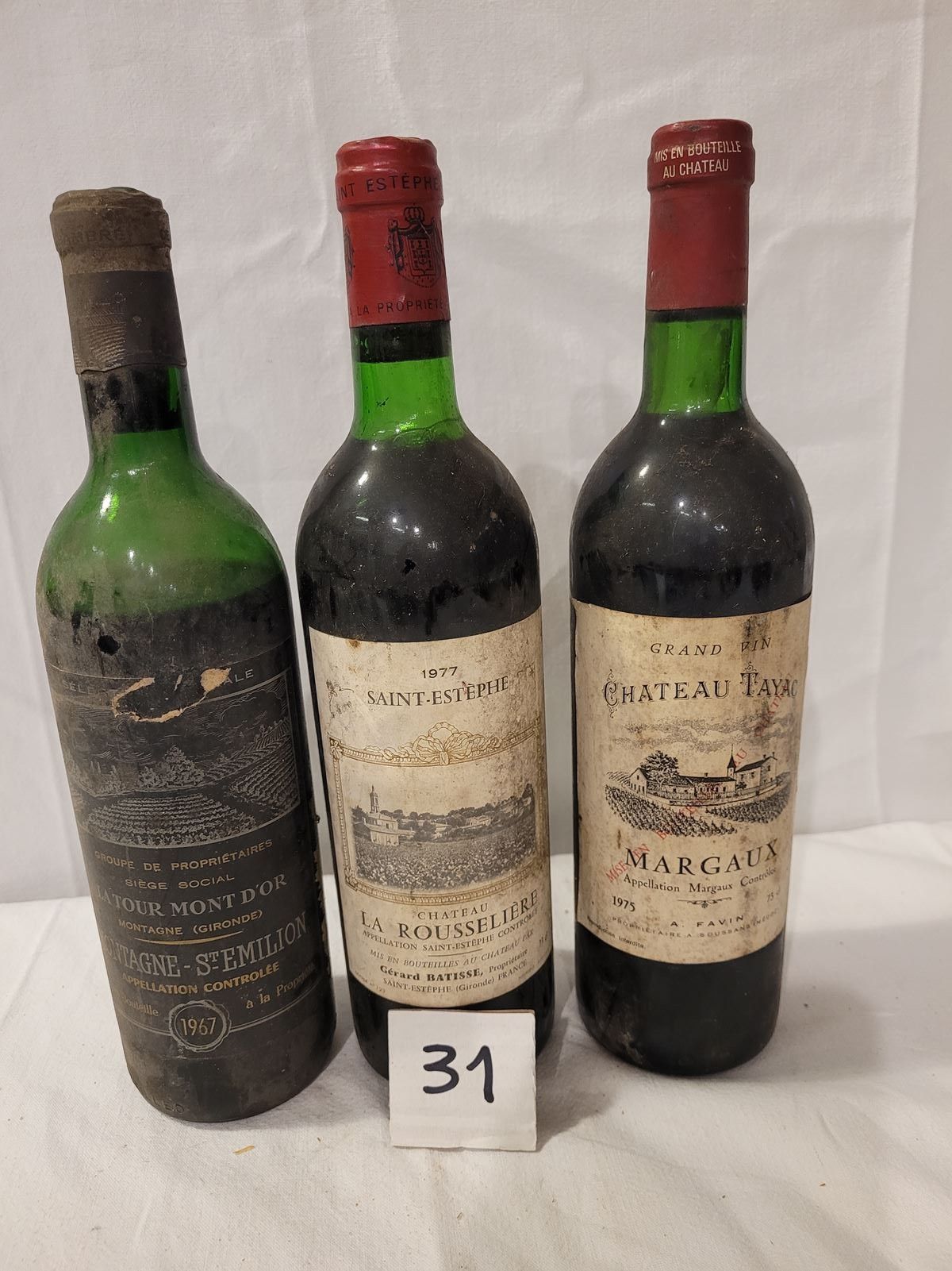 3 bottles, including 1 bottle LA MONT D'OR MONTAGNE SAINT EMILION 1967, drained, 1 bottle CHÂTEAU LA ROUSSELIERE 1977 SAINT ESTEPHE and 1 bottle CHÂTEAU TAYAC 1975 MARGAUX.