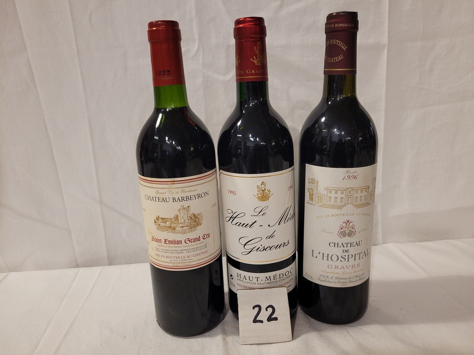 3 bottles including 1 bottle CHÂTEAU BARBEYRON SAINT EMILION GC 1995 and 1 bottle HAUT MEDOC DE GISCOURS 1995 and 1 bottle CHÂTEAU DE L'HOSPITAL GRAVES 1996. All well presented.