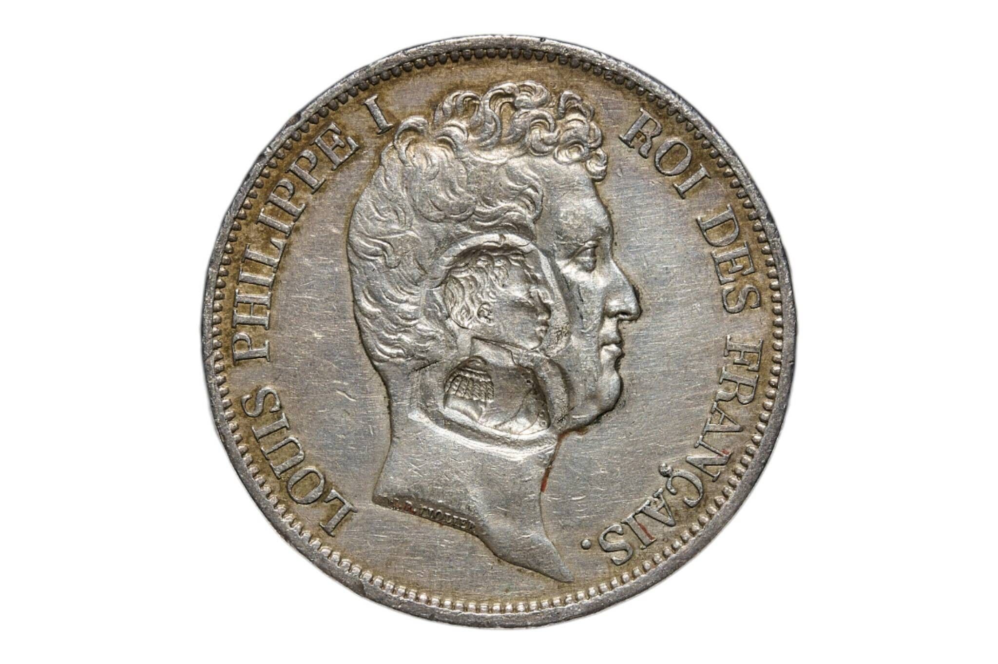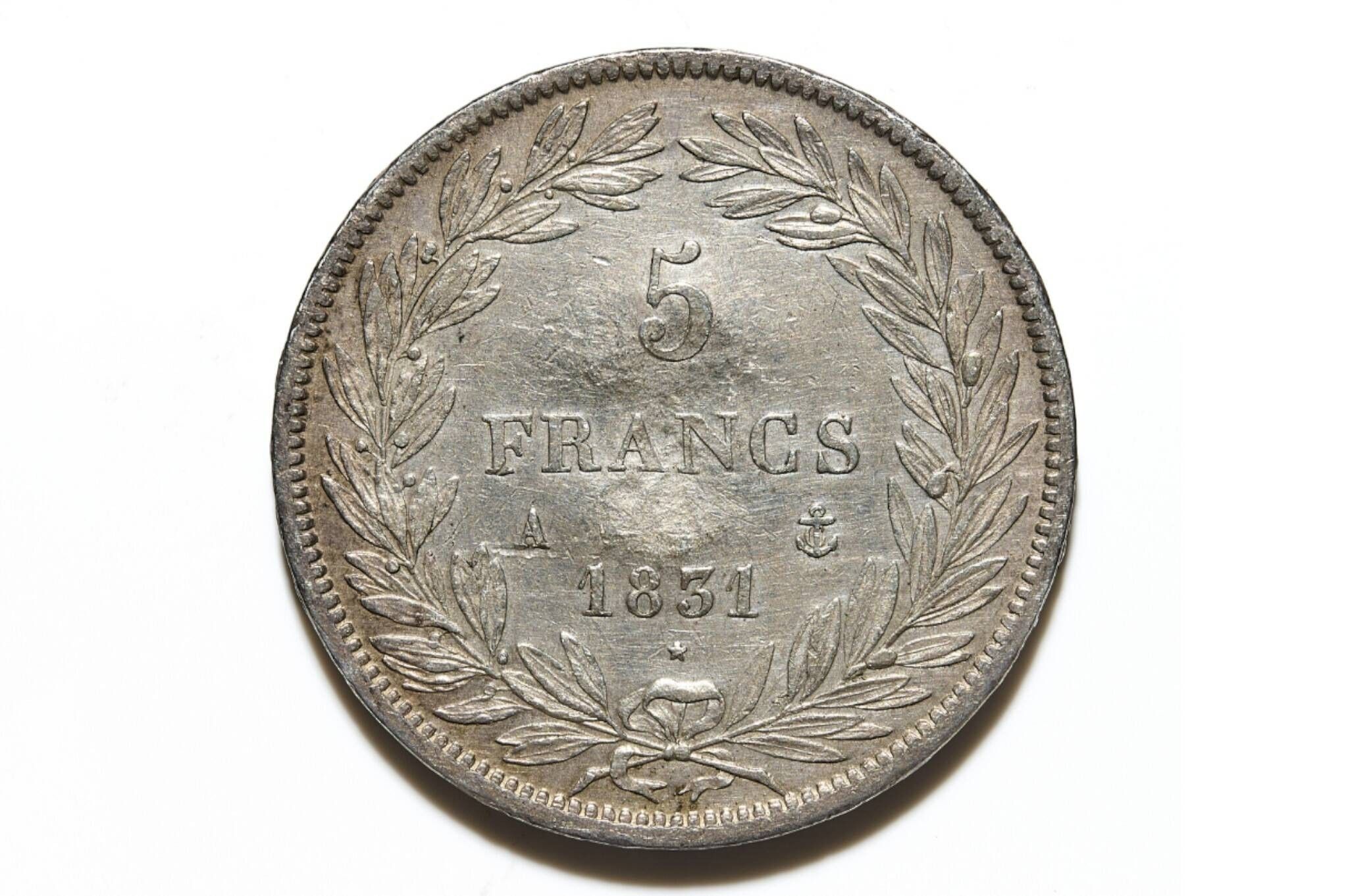 5 Francs 1831 Paris, edge in relief, bare head type, countermarked with an intaglio bust of Henri V