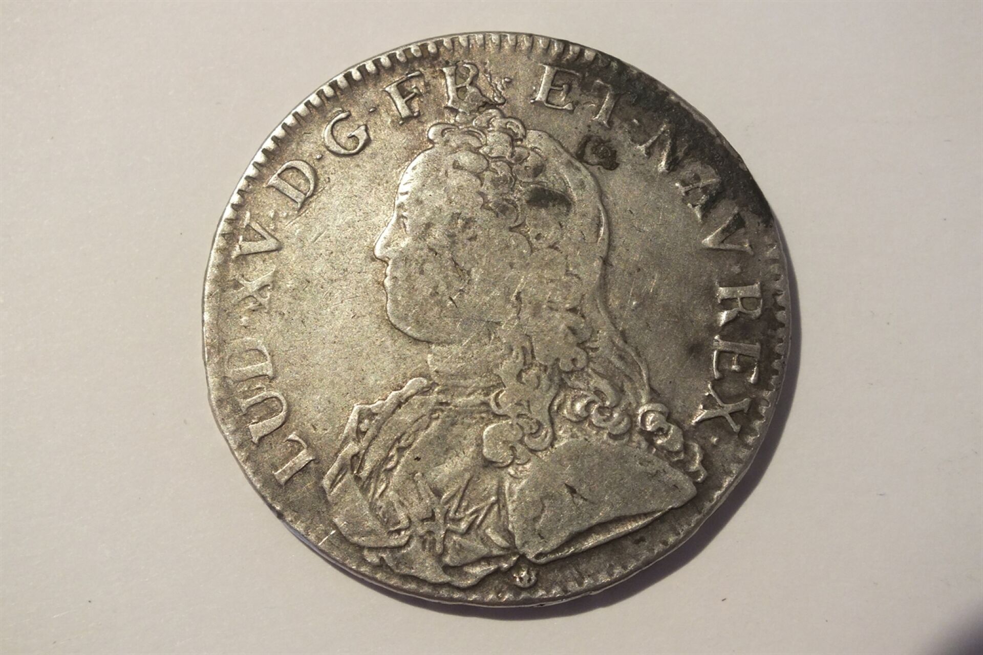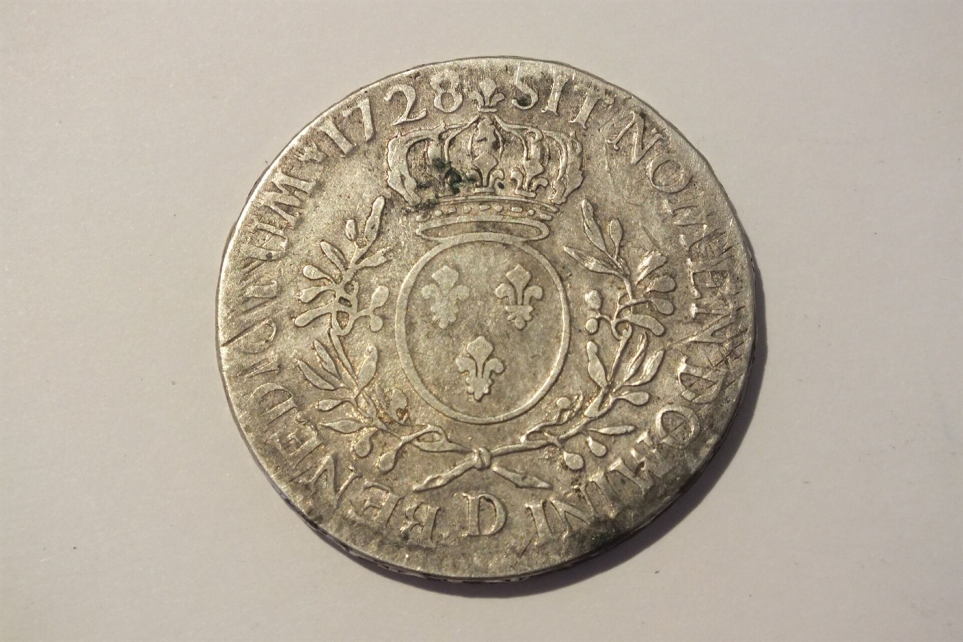 104 / FRANCE - Silver shield with olive branches Louis XV 1728 D (Lyon). A/ Bust of Louis XV on the left wearing the Order of the Holy Spirit. Legend: LUD. XV.D.G.FR. ET.NAV.REX. R/ Oval shield of France under crown between two olive branches. Legend: SIT NOMEN DOMINI BENEDICTUM P = 29,05 g ; D = 41 mm ; VG+.