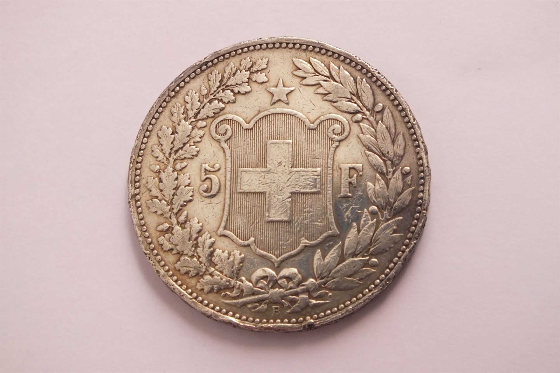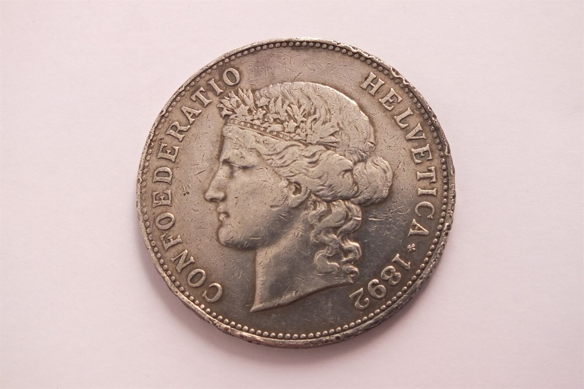 157 / SWITZERLAND - 5F silver Helvetia 1892 B (Bern). A/ Crowned head of Helvetia to left. Legend: CONFOEDERATIO HELVETICA R/ Swiss coat of arms within a wreath formed of two branches of oak and laurel, a star above. P = 24.91 g ; D = 37 mm ; Mint.