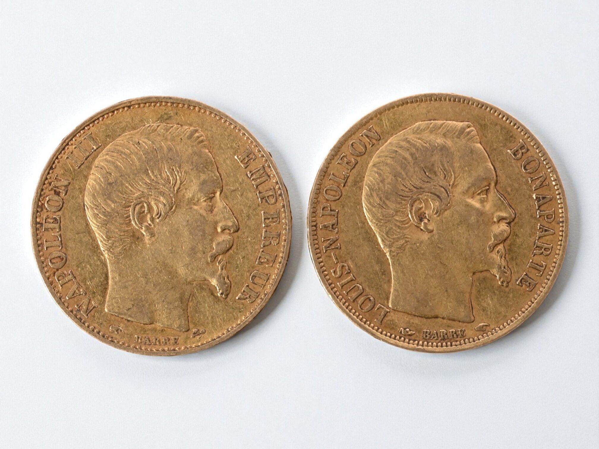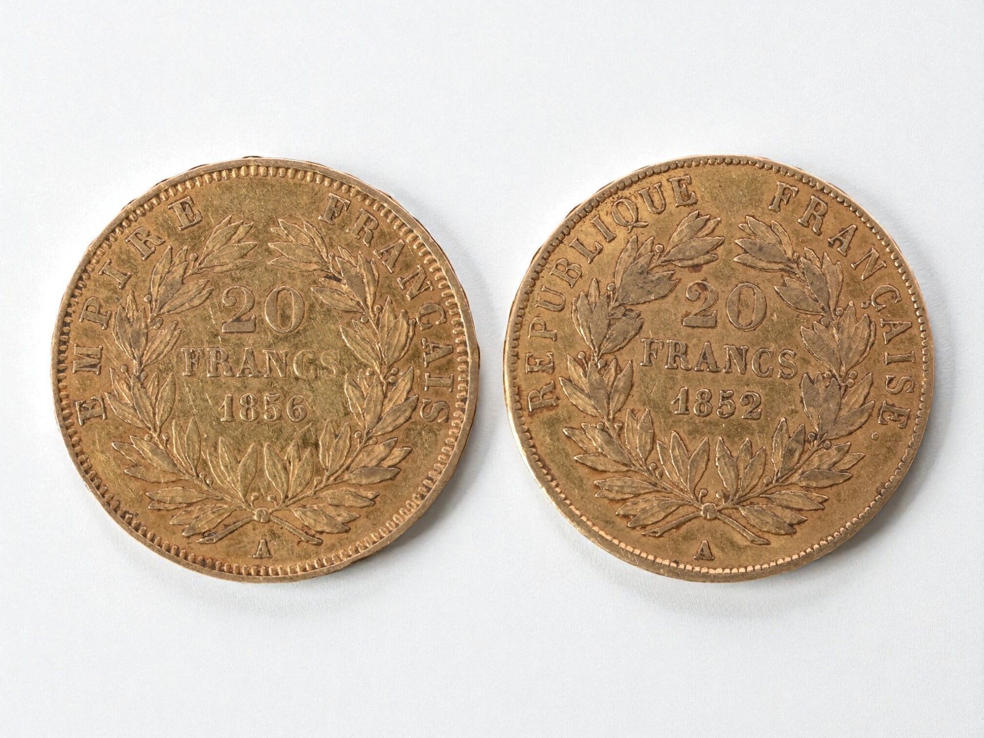 Two 20 franc gold Napoleon III headless coins of 1852 and 1856.