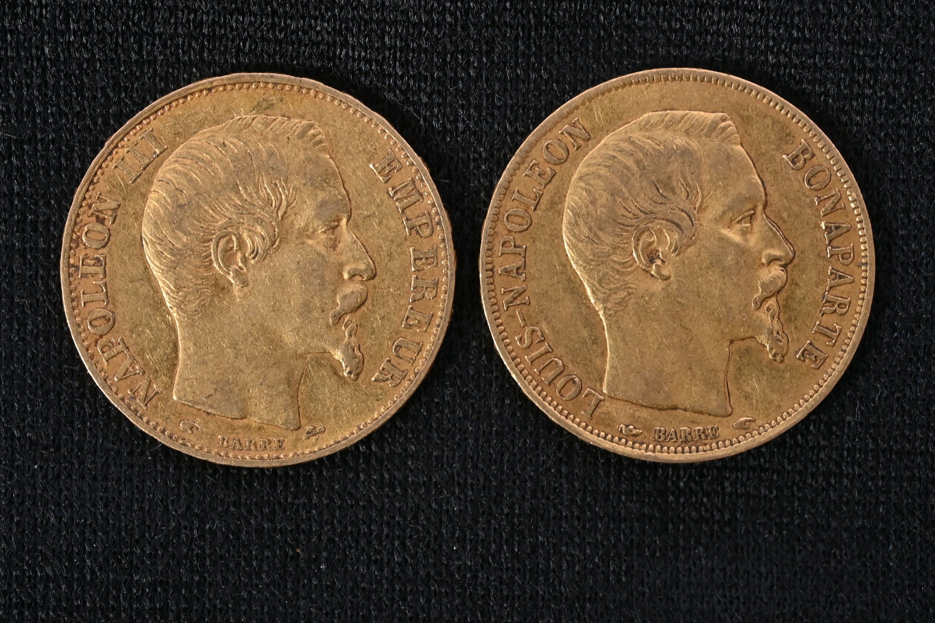 Two 20 franc gold Napoleon III headless coins of 1852 and 18…