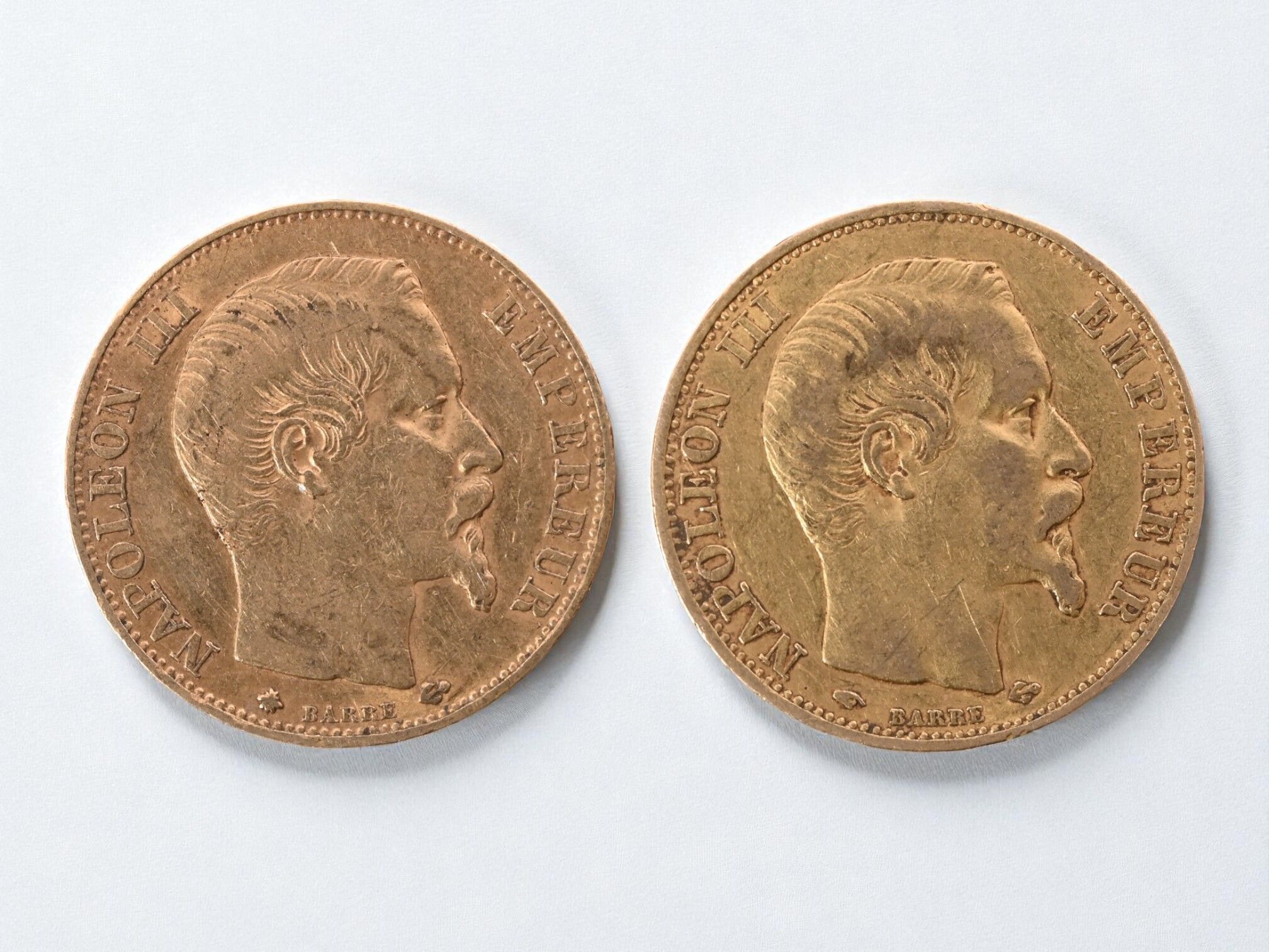 Two 20 franc gold Napoleon III headless coins from 1857 and …