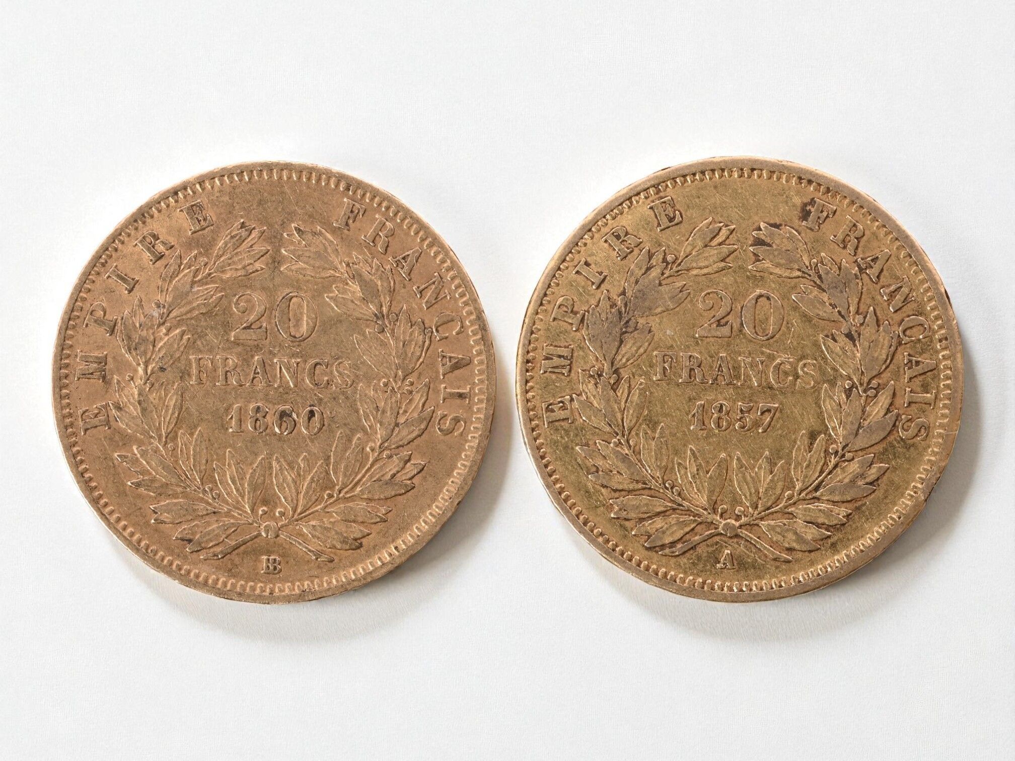 Two 20 franc gold Napoleon III headless coins from 1857 and 1860.